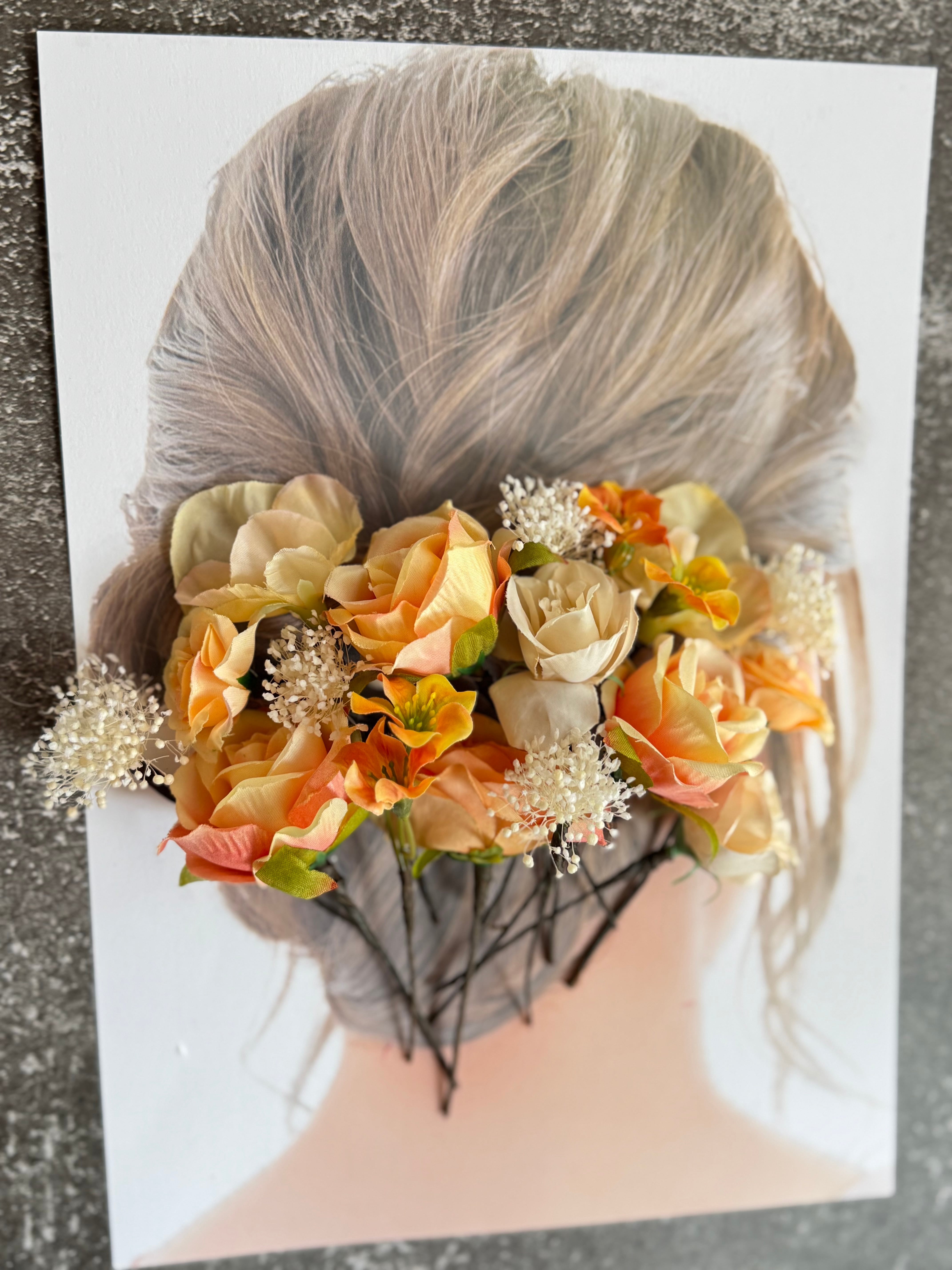 オレンジ濃淡とホワイトを中心に、優しい色味の花々を集めた爽やかなヘッドパーツセット。