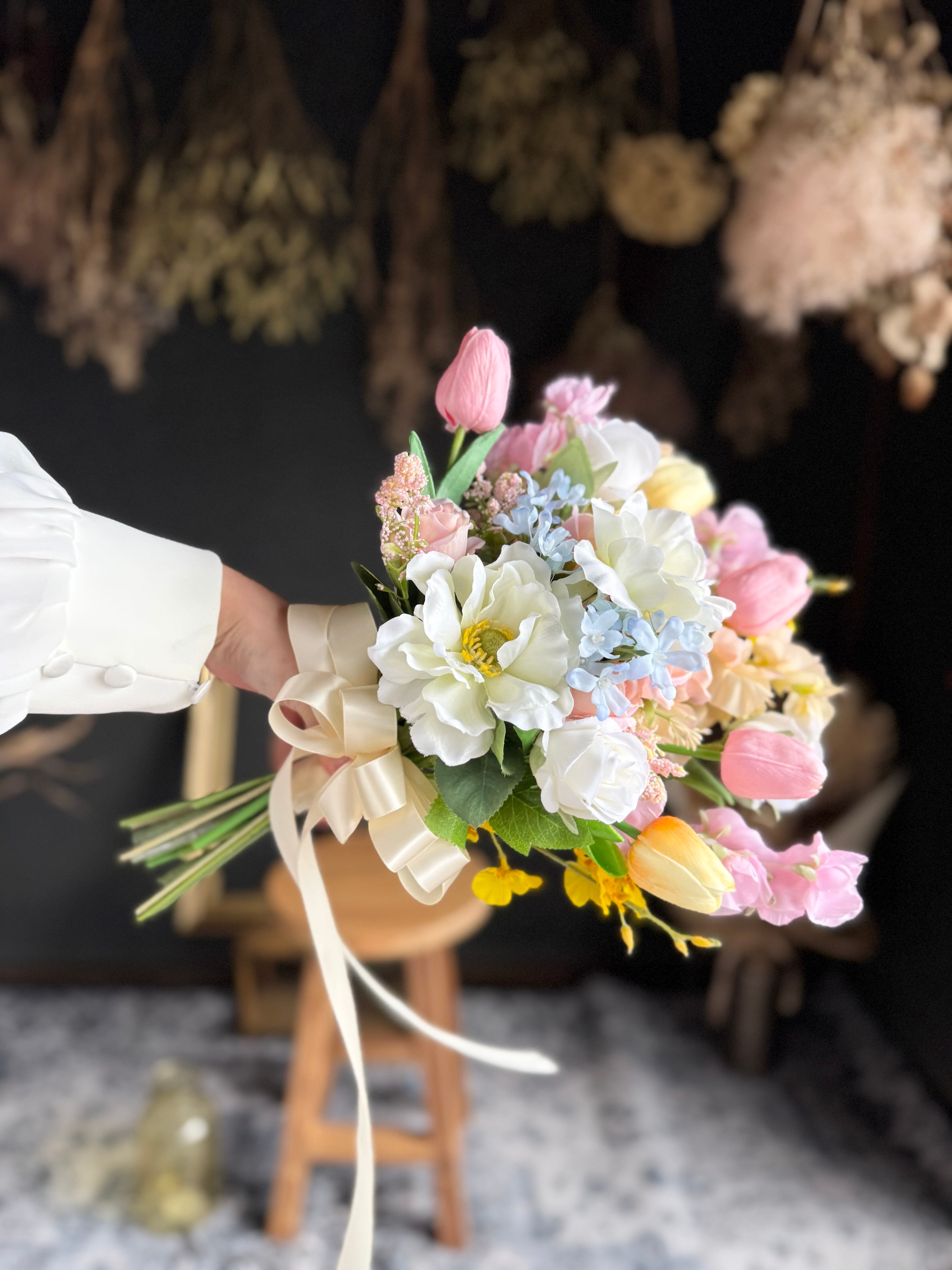 造花(アーティフィシャルフラワー)なので、前撮りや結婚式本番はもちろん、挙式後もそのままインテリアとして飾っていただけます。