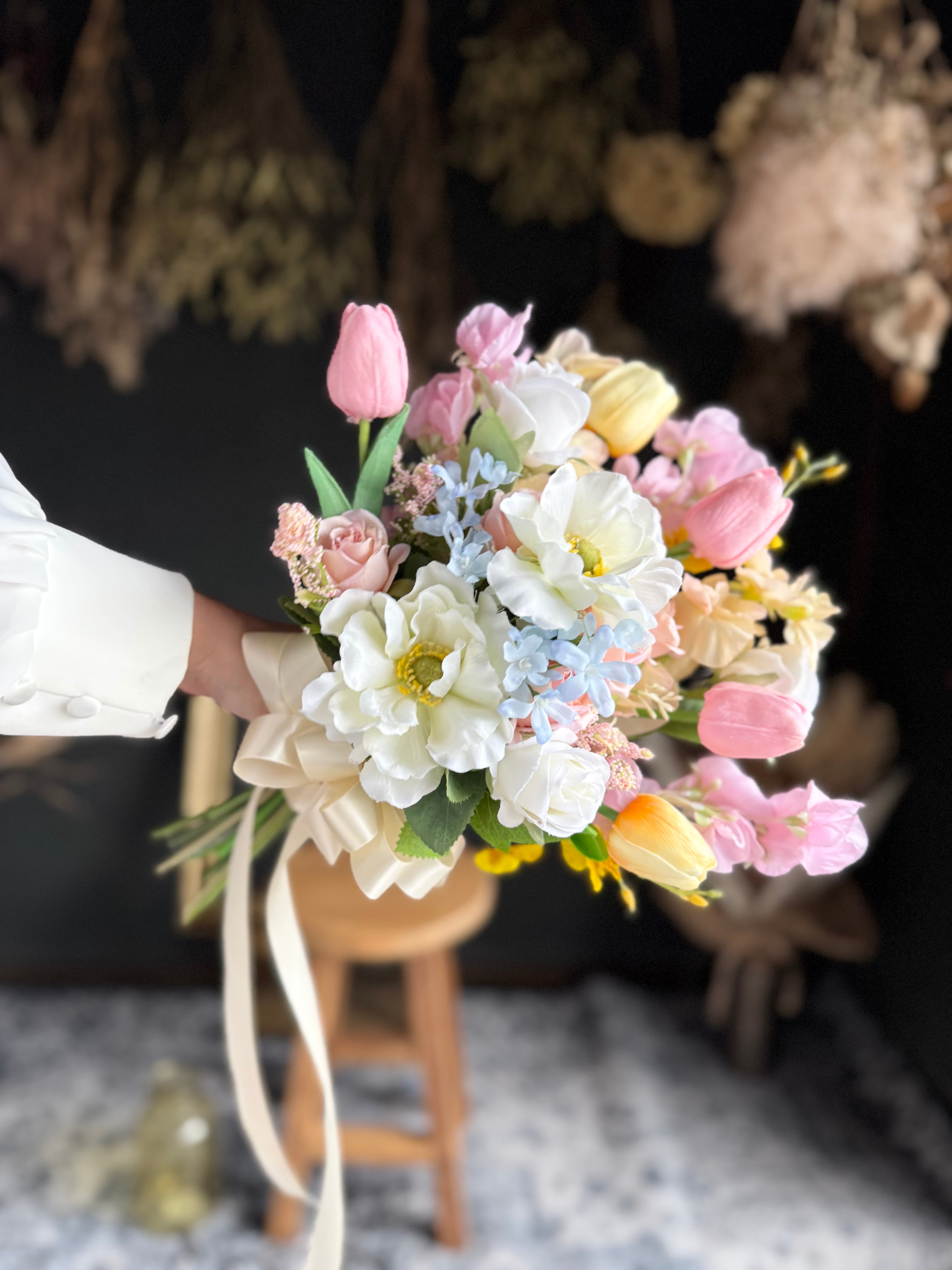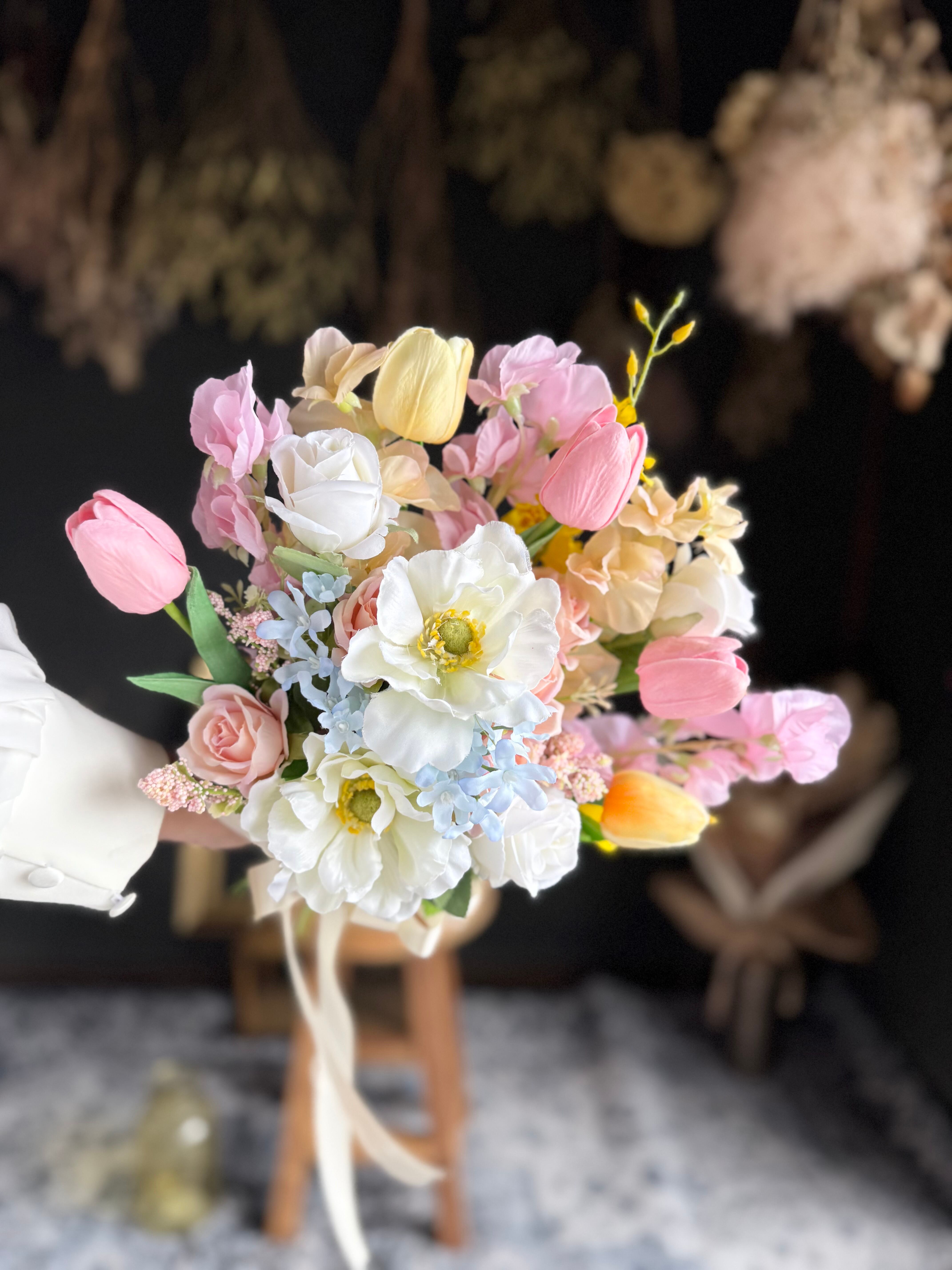 春色のチューリップや小花を添えた、