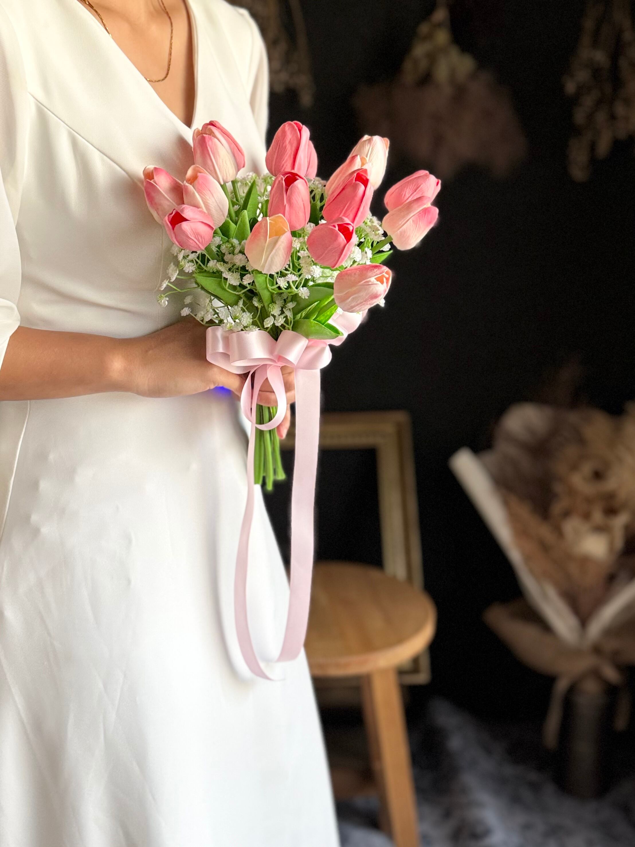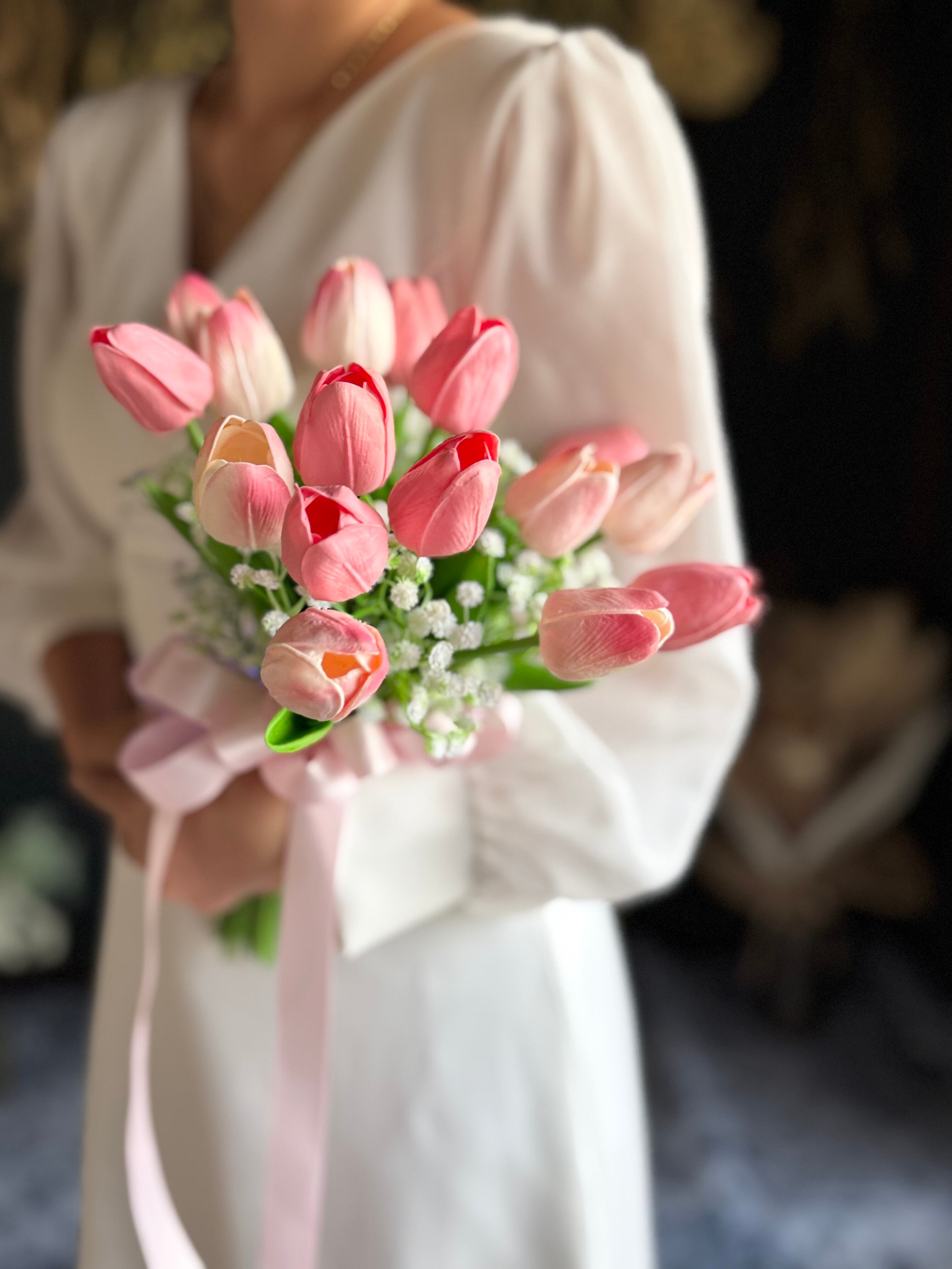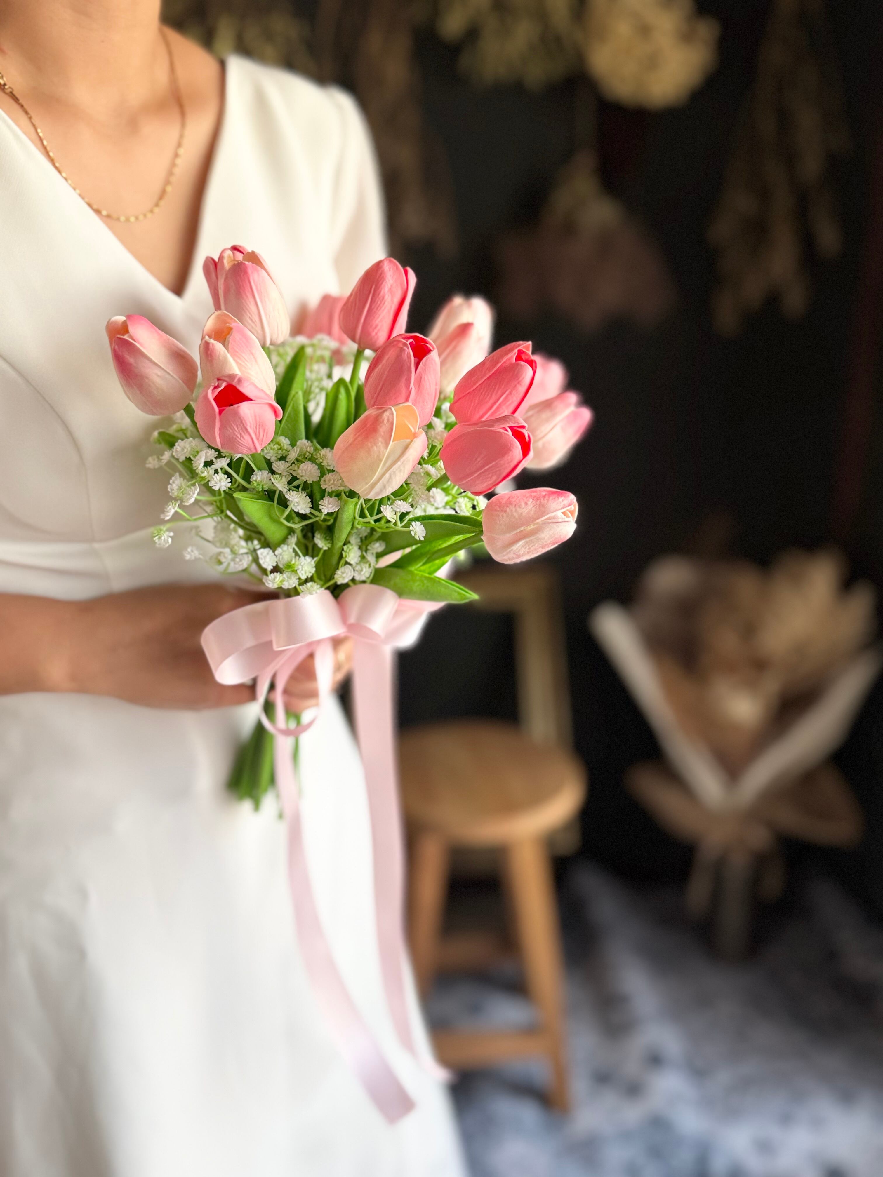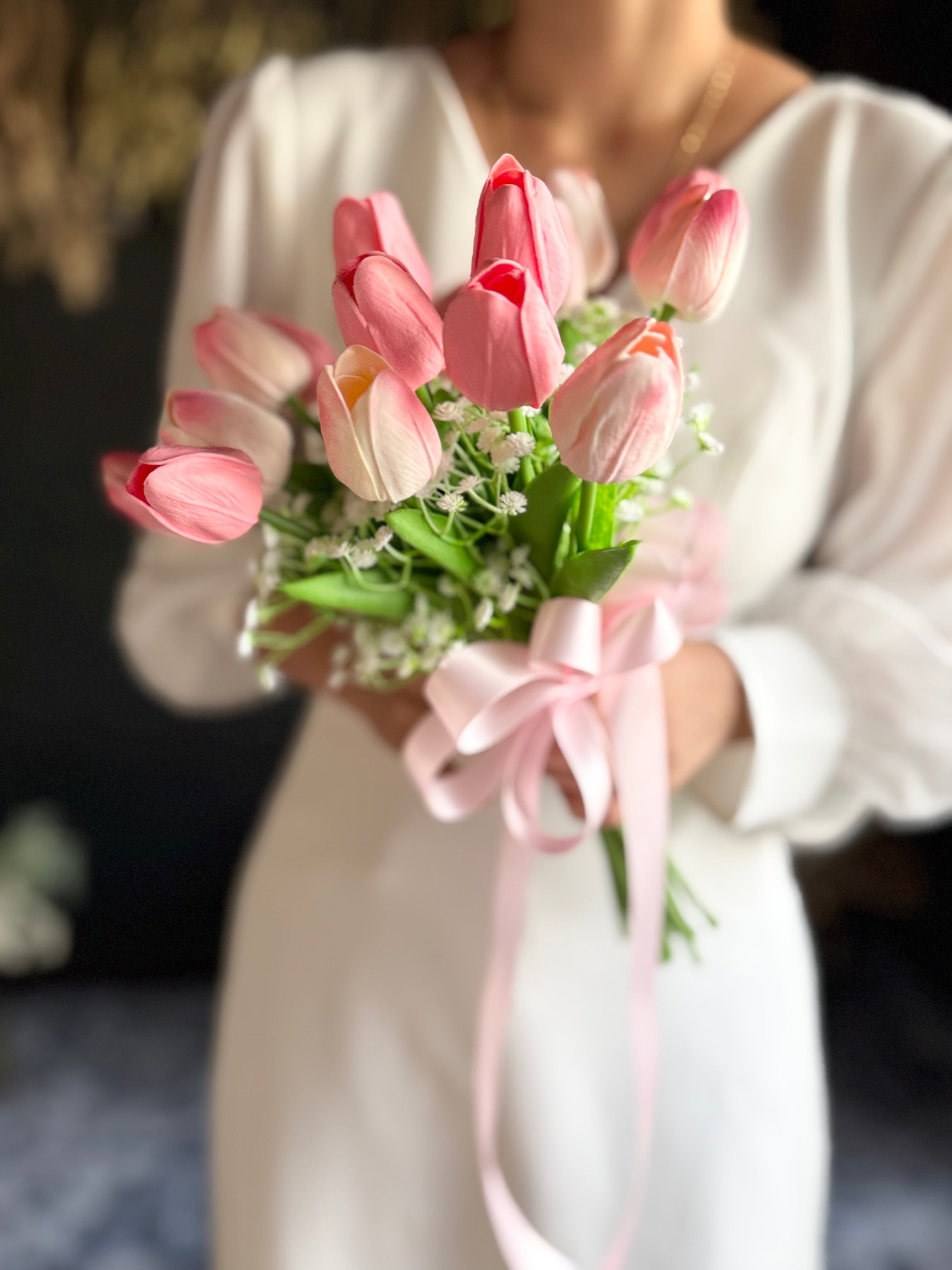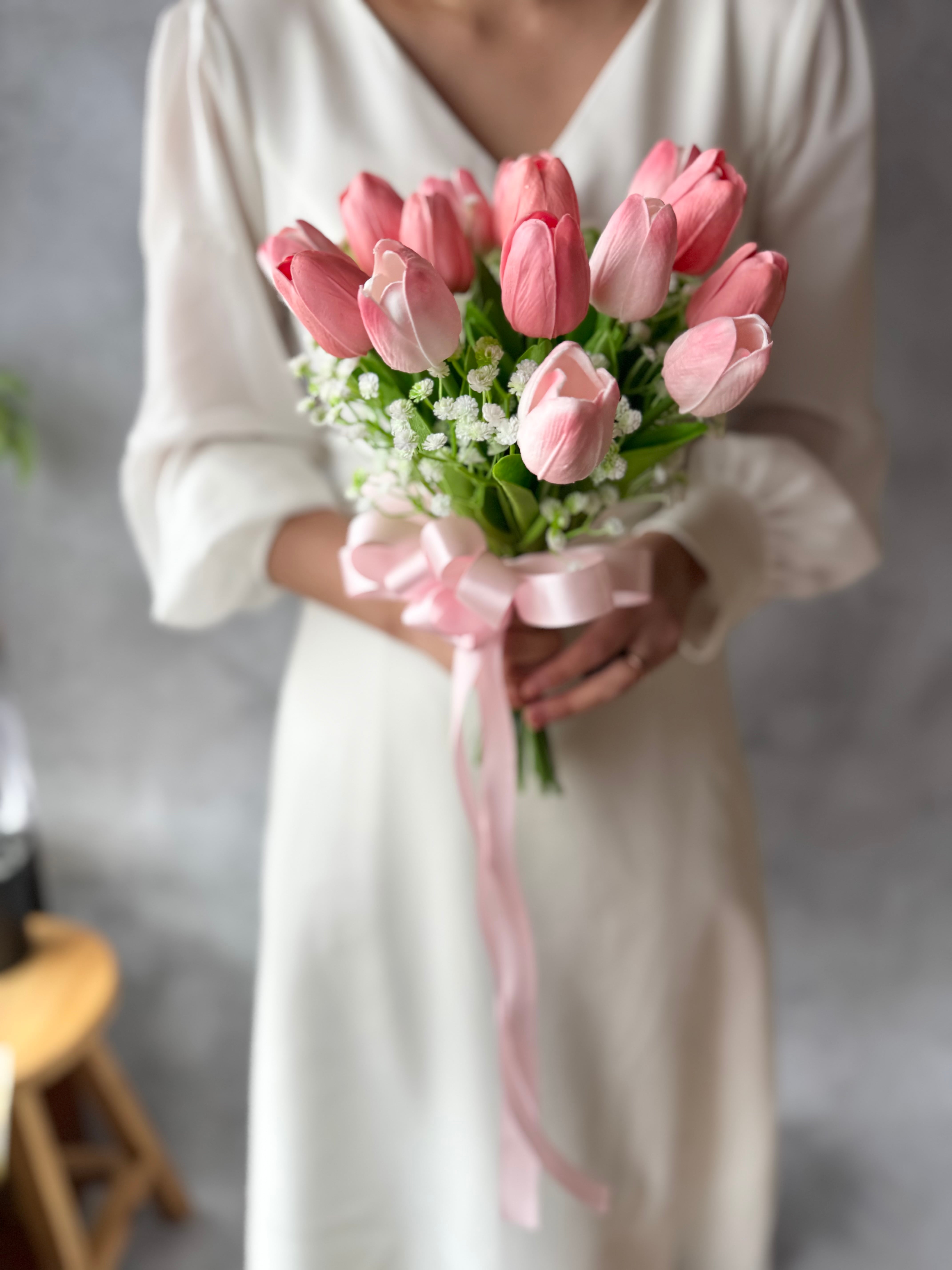 チューリップとかすみ草のふんわり心がときめく可愛いブーケ•*・人気のチューリップブーケでウェディングにもカラードレスにも合わせやすいデザイン•*・