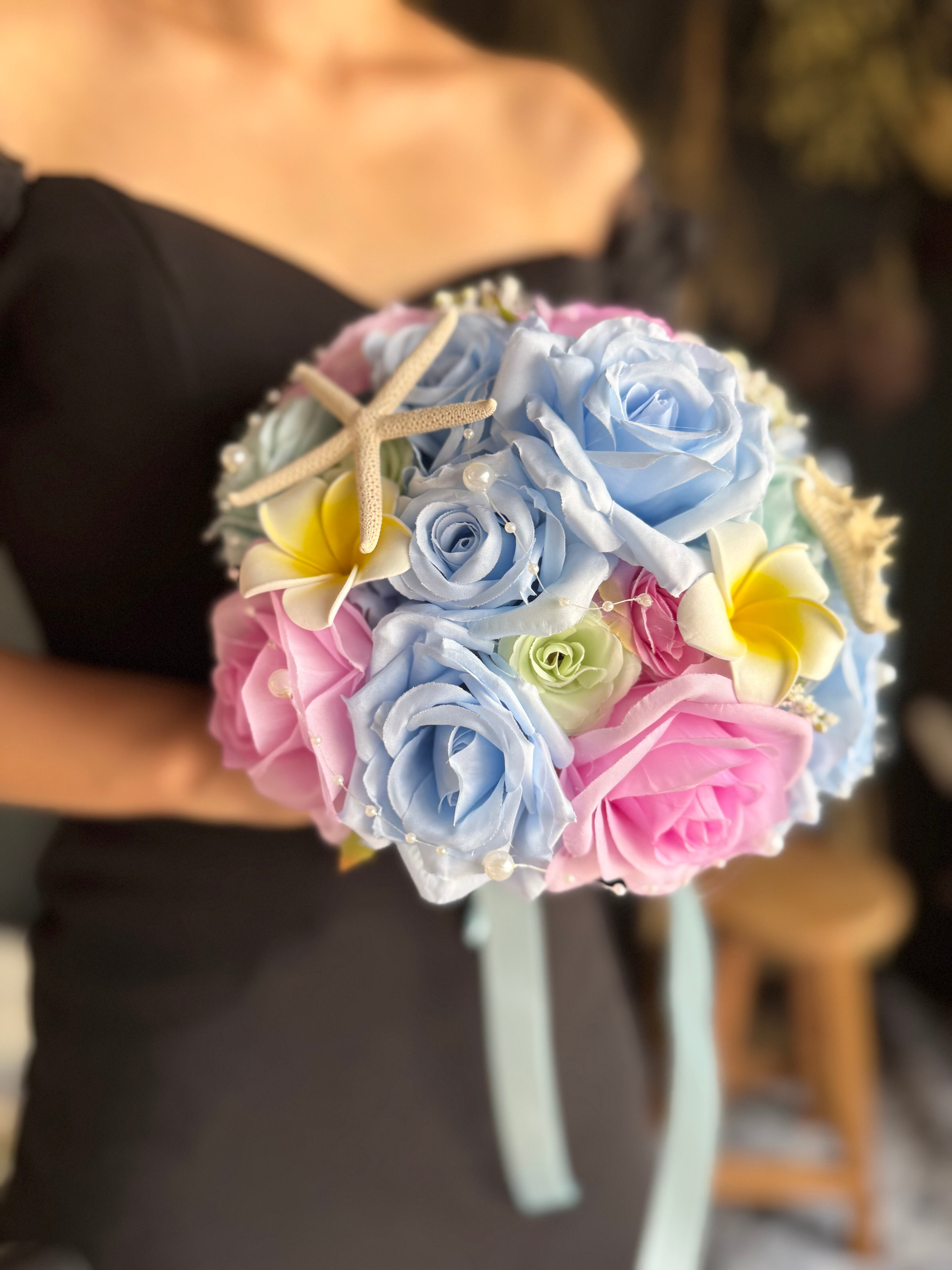 海や人魚をイメージしたラウンドブーケです♡生花では用意が難しい水色のバラに貝殻やヒトデ、パールを散りばめた可愛いらしいブーケ♪夏ウェディングや海辺のチャペルにいかがでしょうか(๑˃̵ᴗ˂̵)