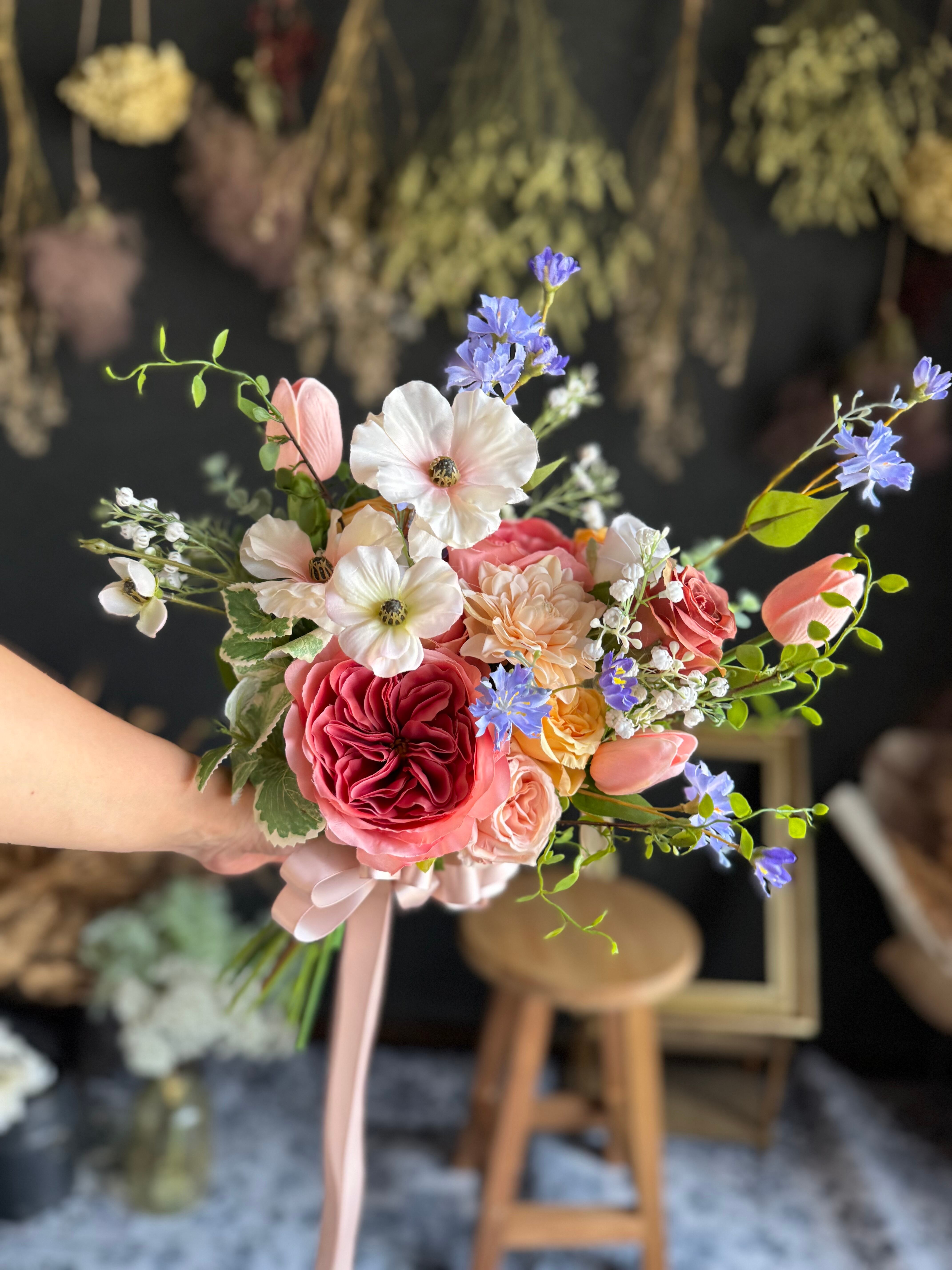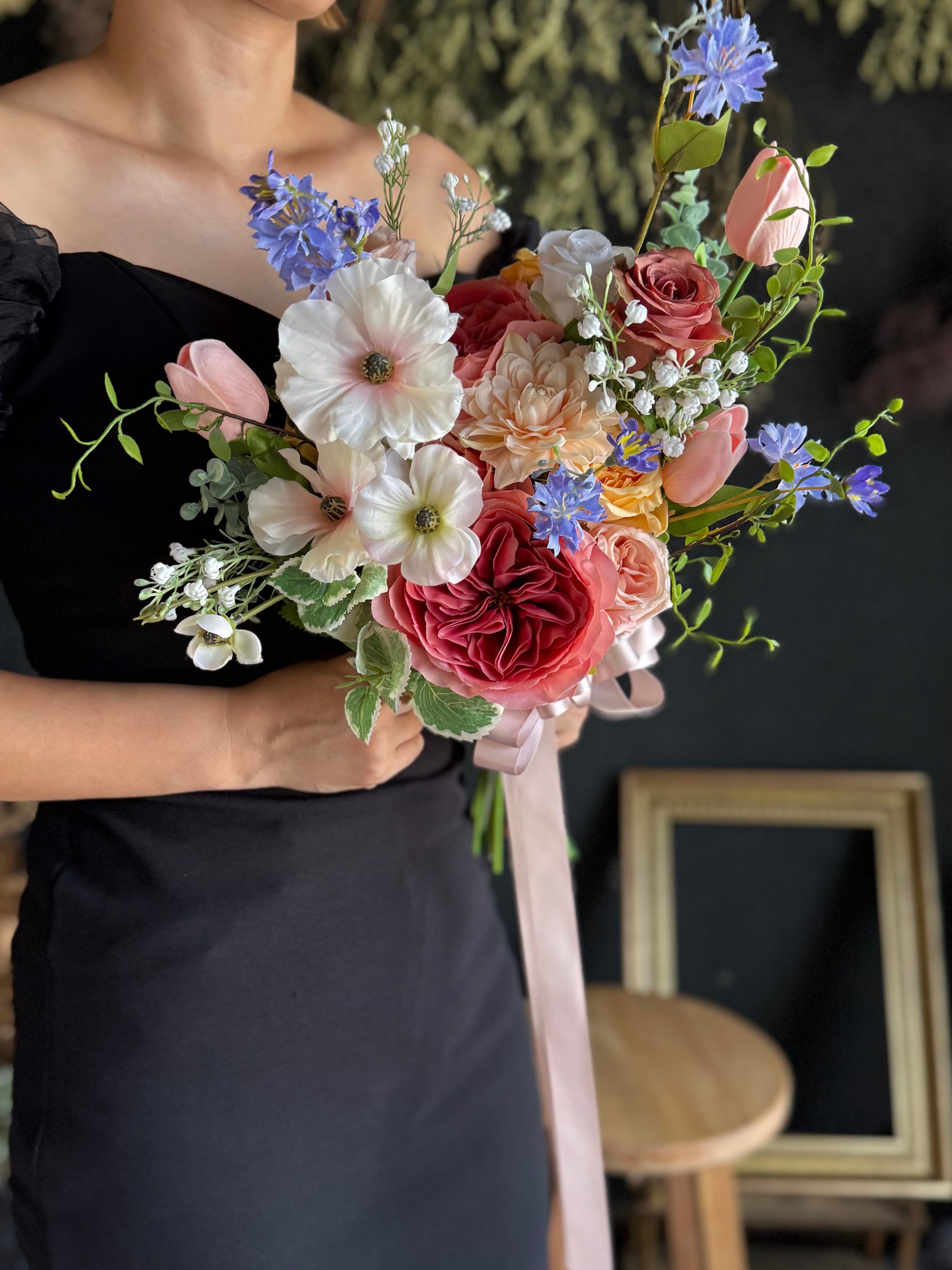 春の光を纏うようなふわりと優しい色合いの中に、ほんのり青が差し込むことで透明感が引き立つブーケ•*・やさしい春風のような、軽やかな色彩を束ね、甘すぎず爽やかなカラーは、ドレスや和装どちらにもおすすめです•*・
