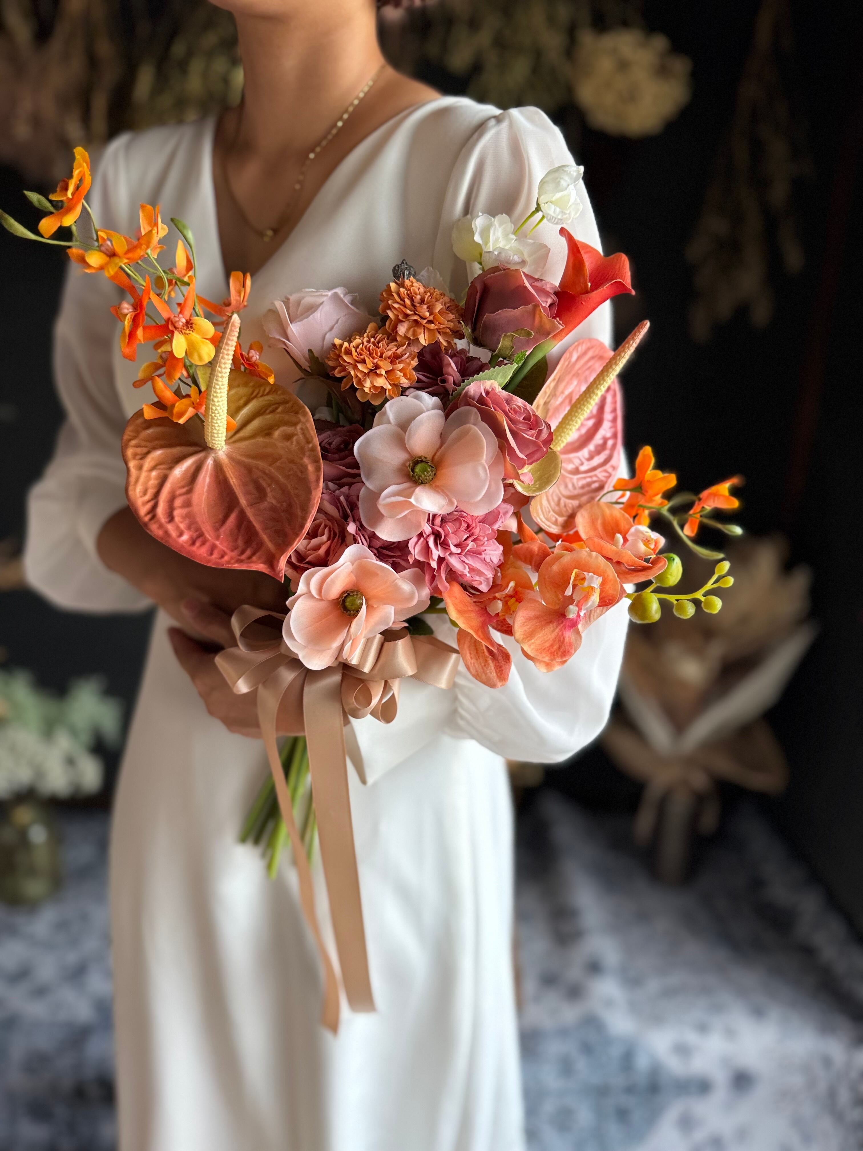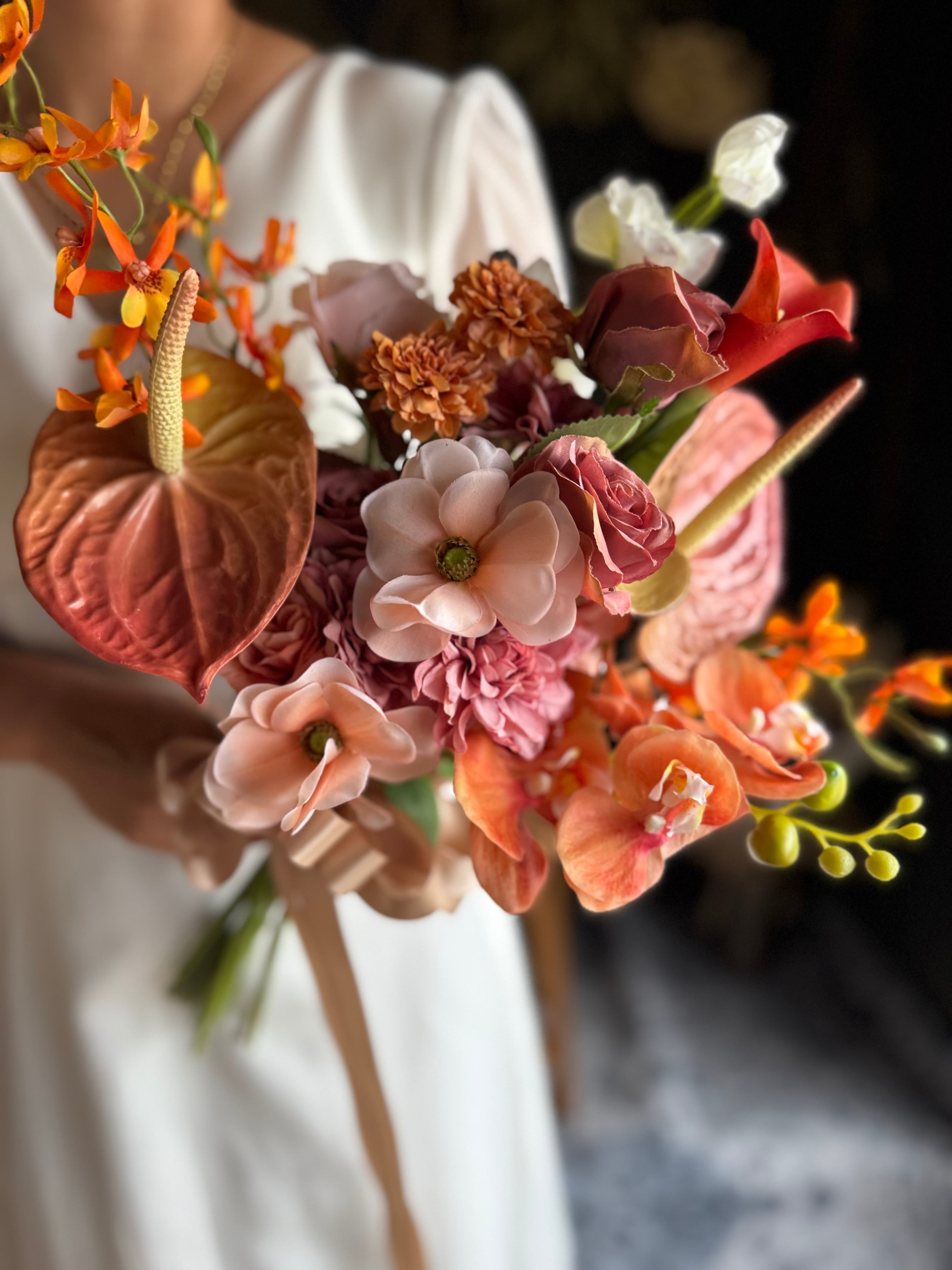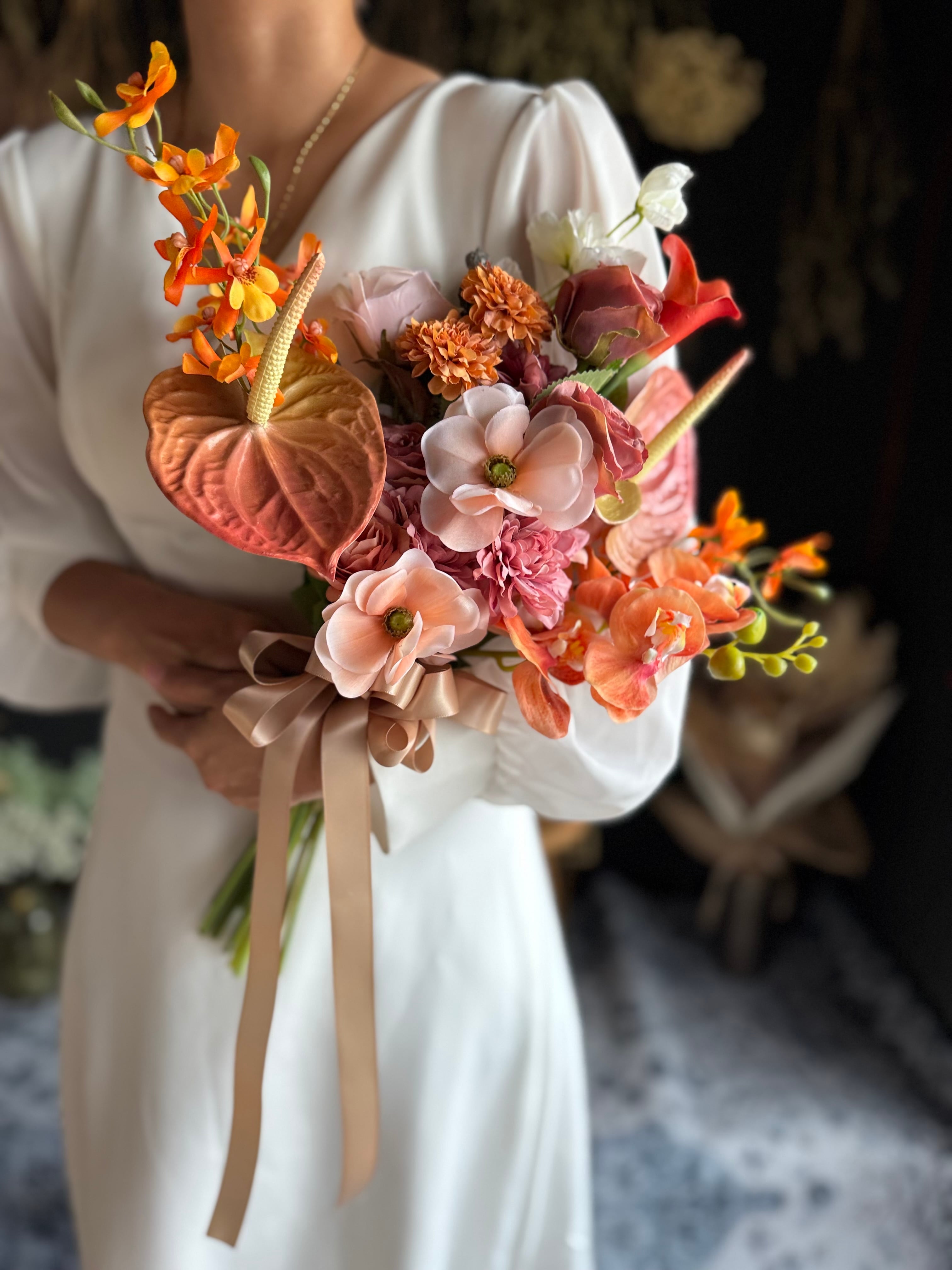 サーモンピンク、テラコッタ、オレンジと美しいコンビネーションが魅力のクラッチブーケです•*・グラデーションの色彩がブーケ全体を優雅に演出し高級感あるウェディングブーケに♪