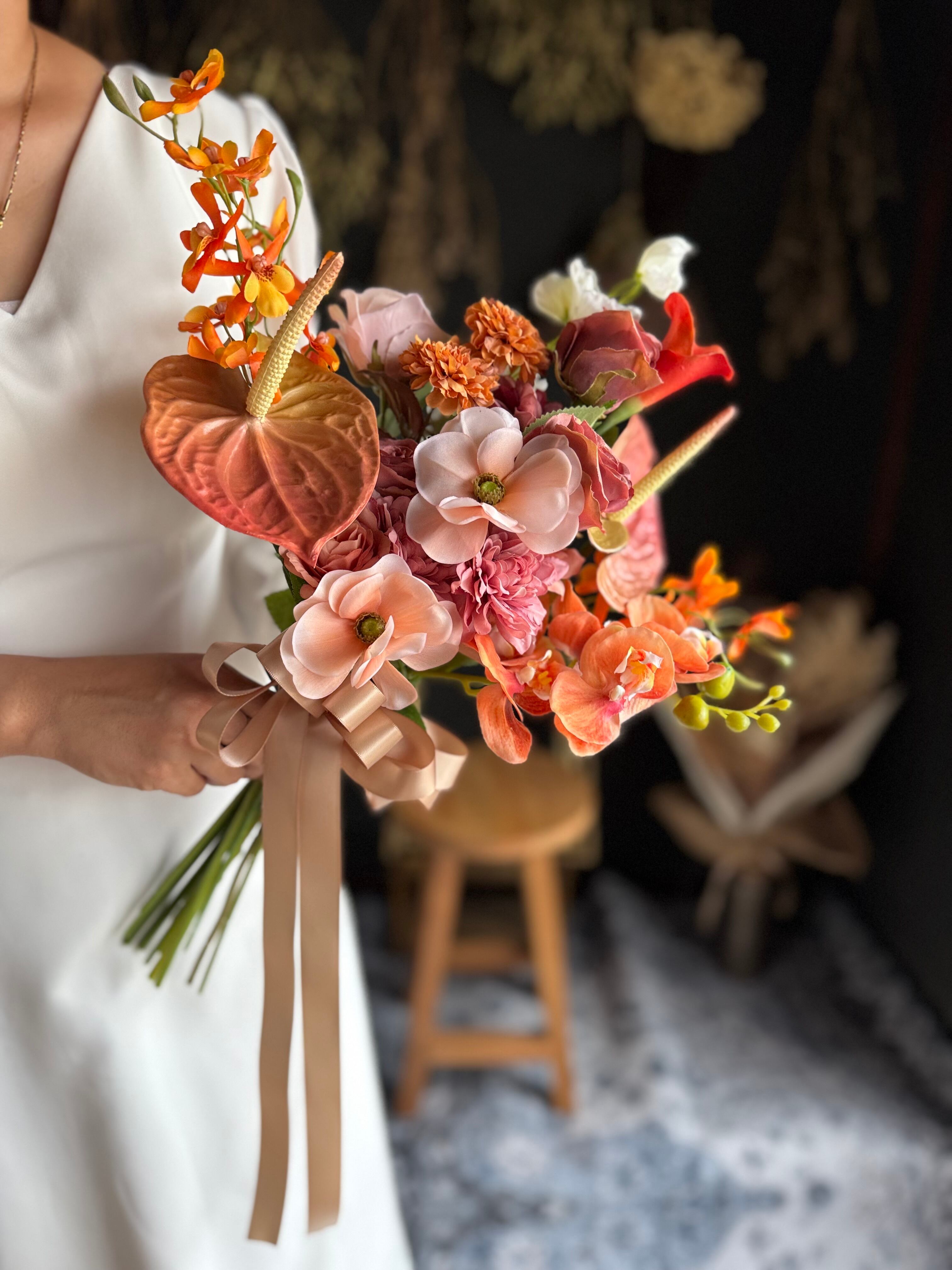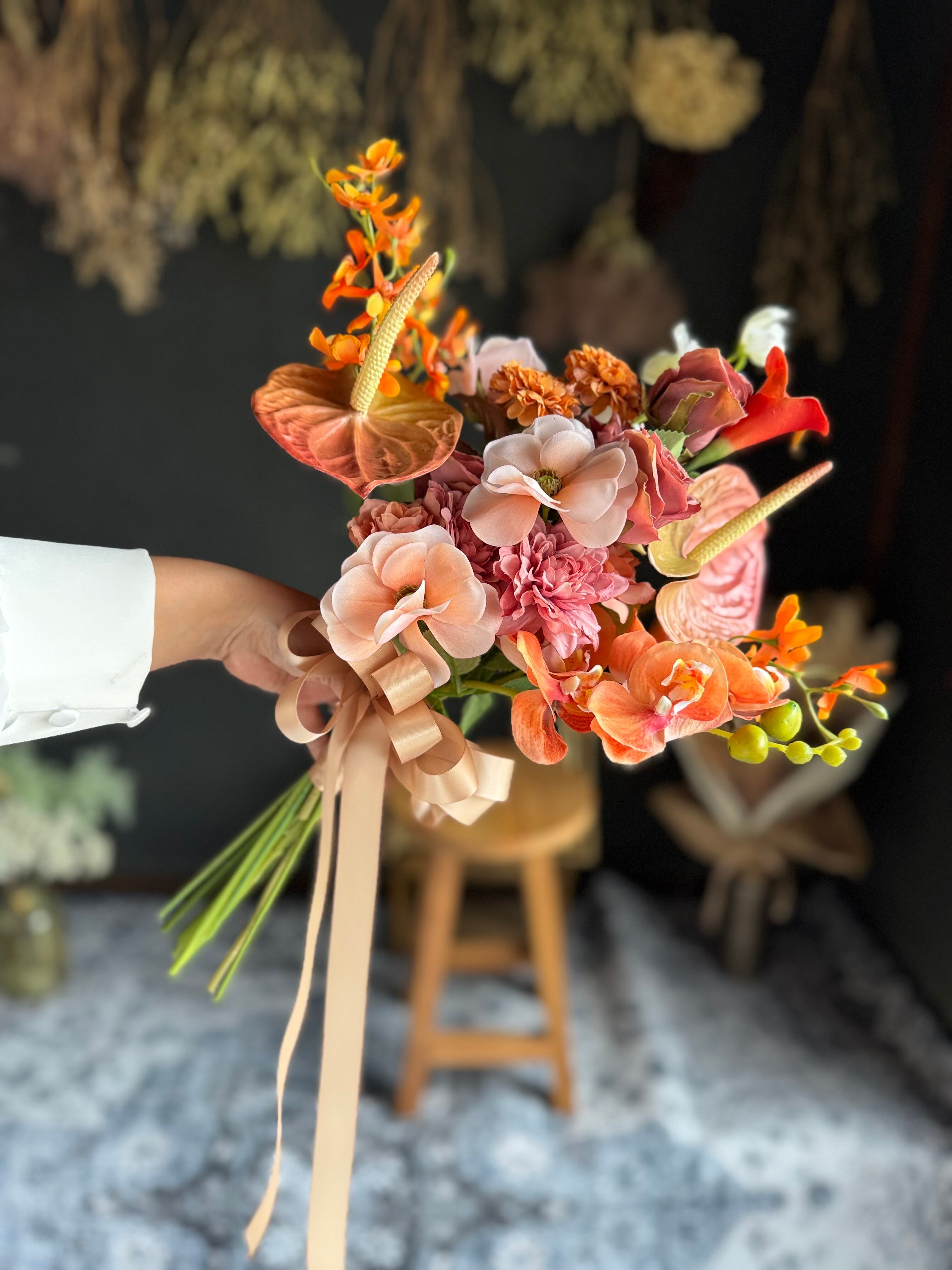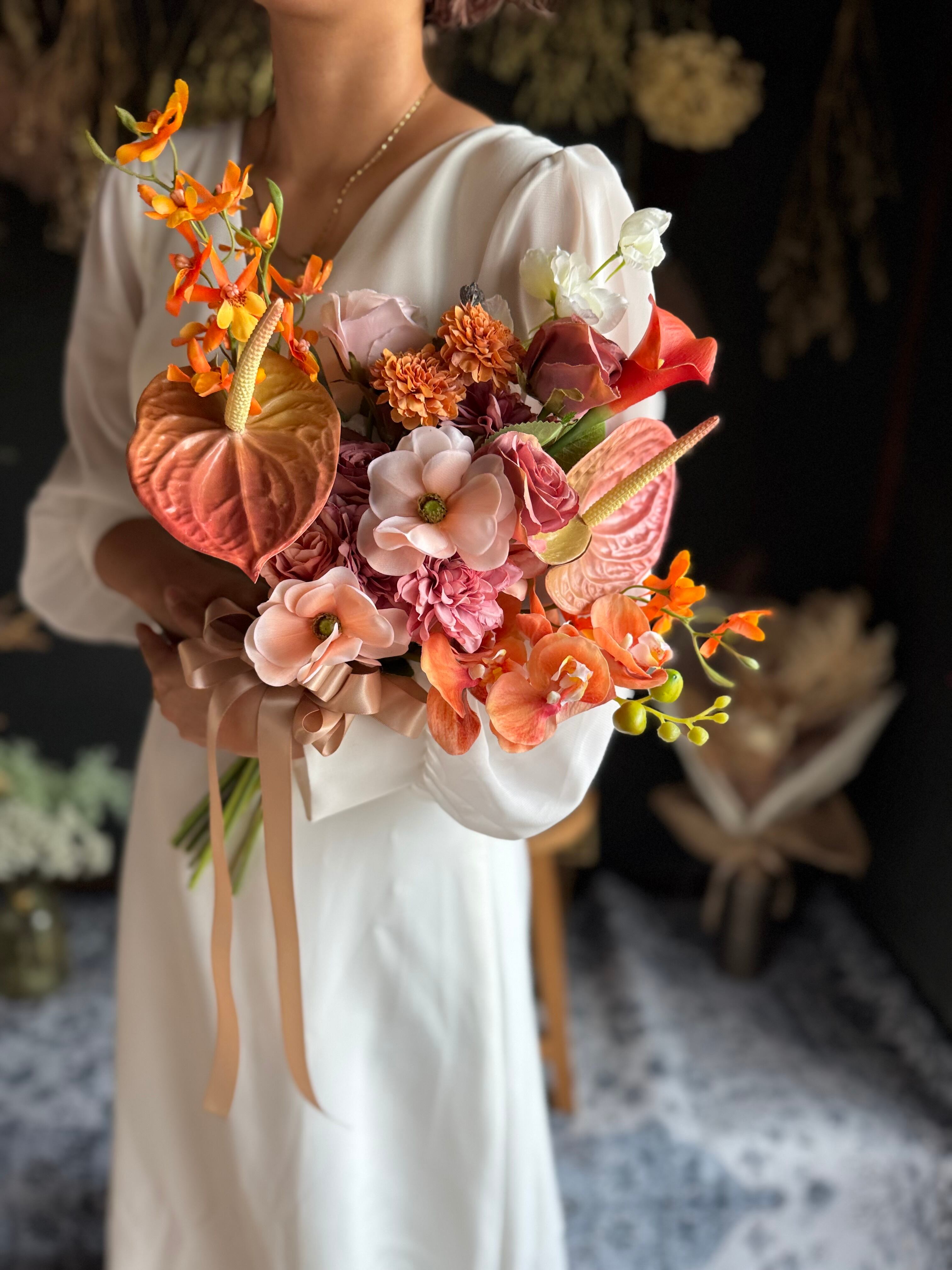 サーモンピンク、テラコッタ、オレンジと美しいコンビネーションが魅力のクラッチブーケです•*・グラデーションの色彩がブーケ全体を優雅に演出し高級感あるウェディングブーケに♪