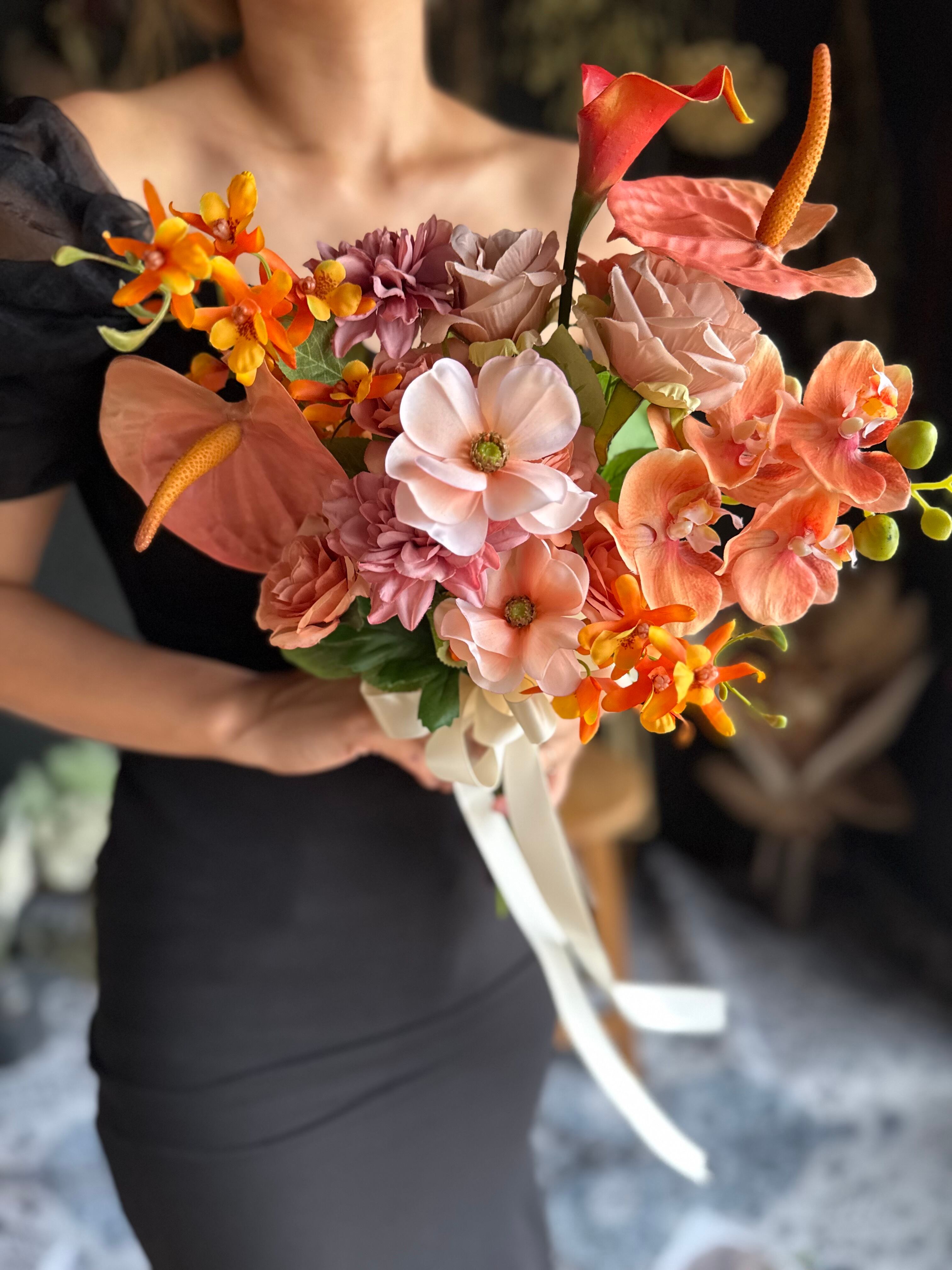 サーモンピンク、テラコッタ、オレンジと美しいコンビネーションが魅力のクラッチブーケです•*・グラデーションの色彩がブーケ全体を優雅に演出し高級感あるウェディングブーケに♪こちらのアンスリュームはメーカー廃盤になりましたので再販はできません•*・