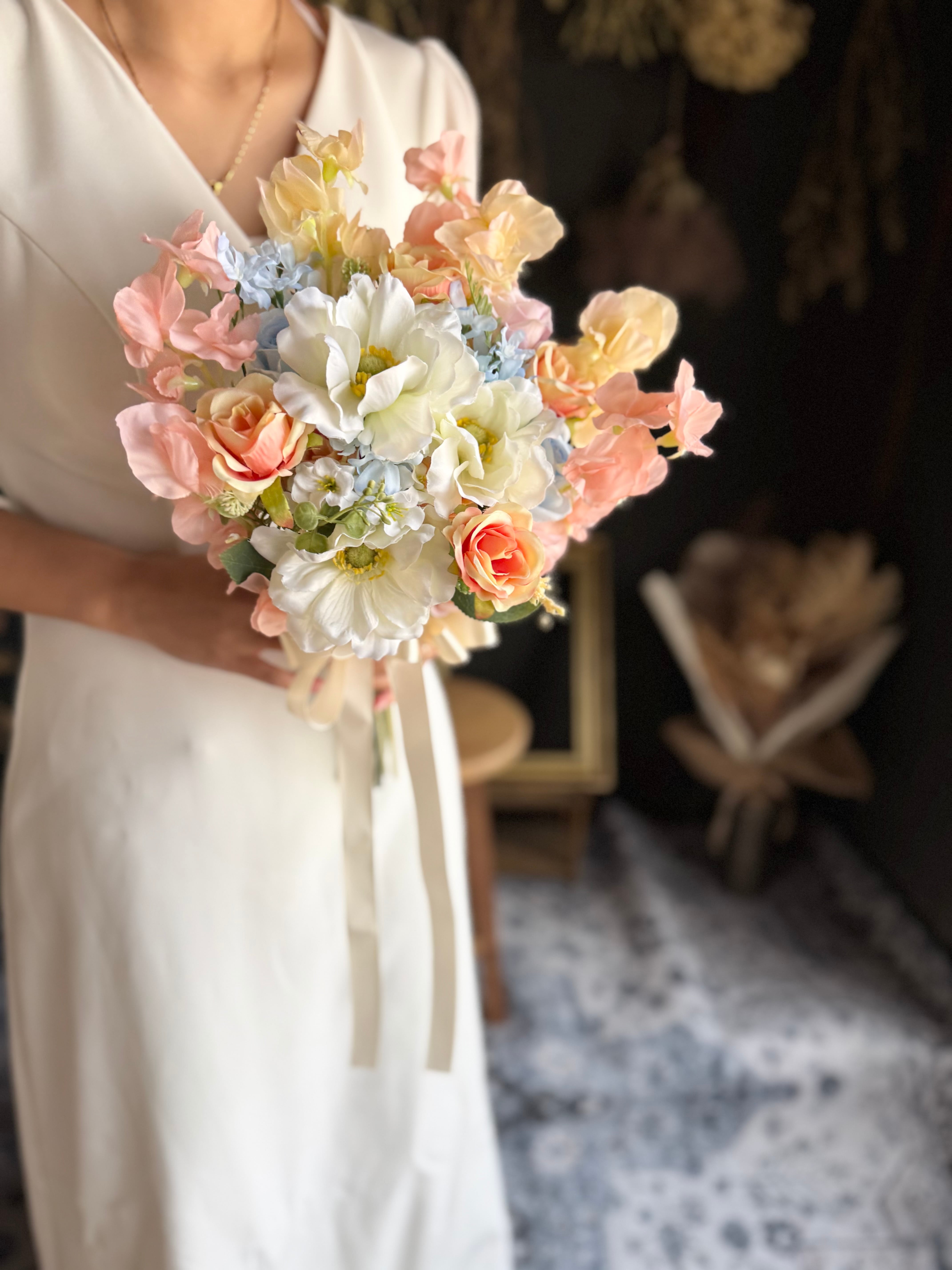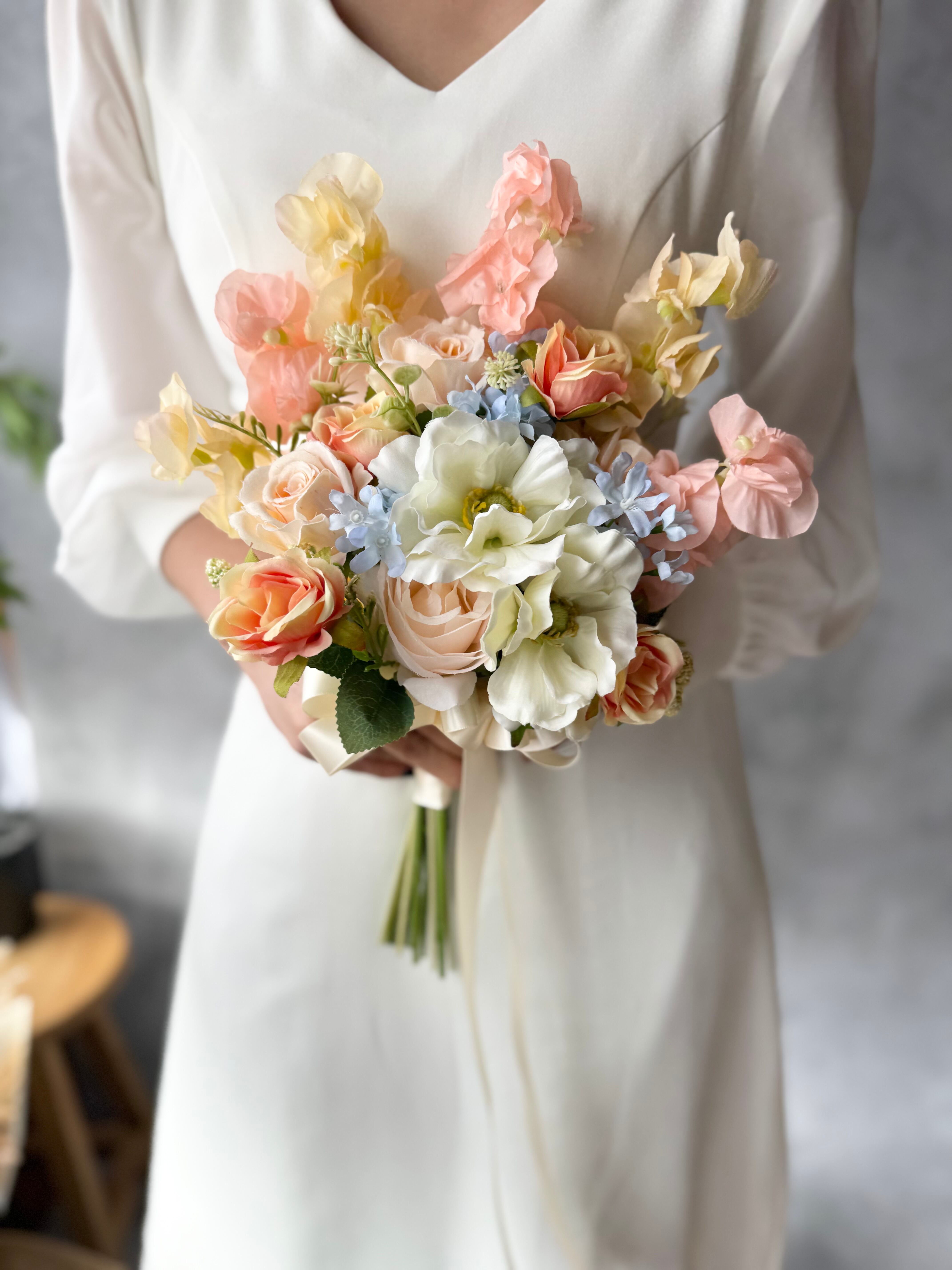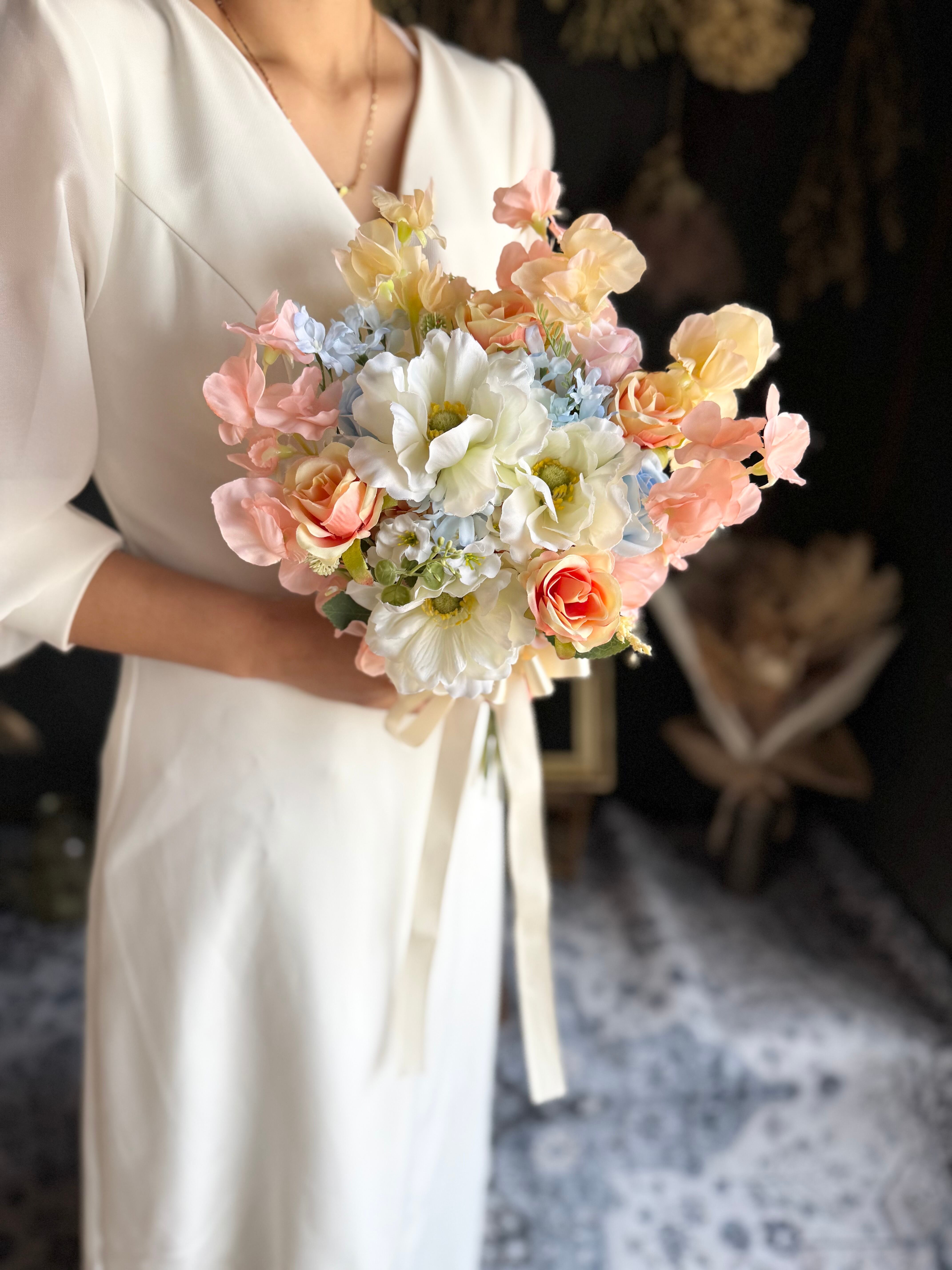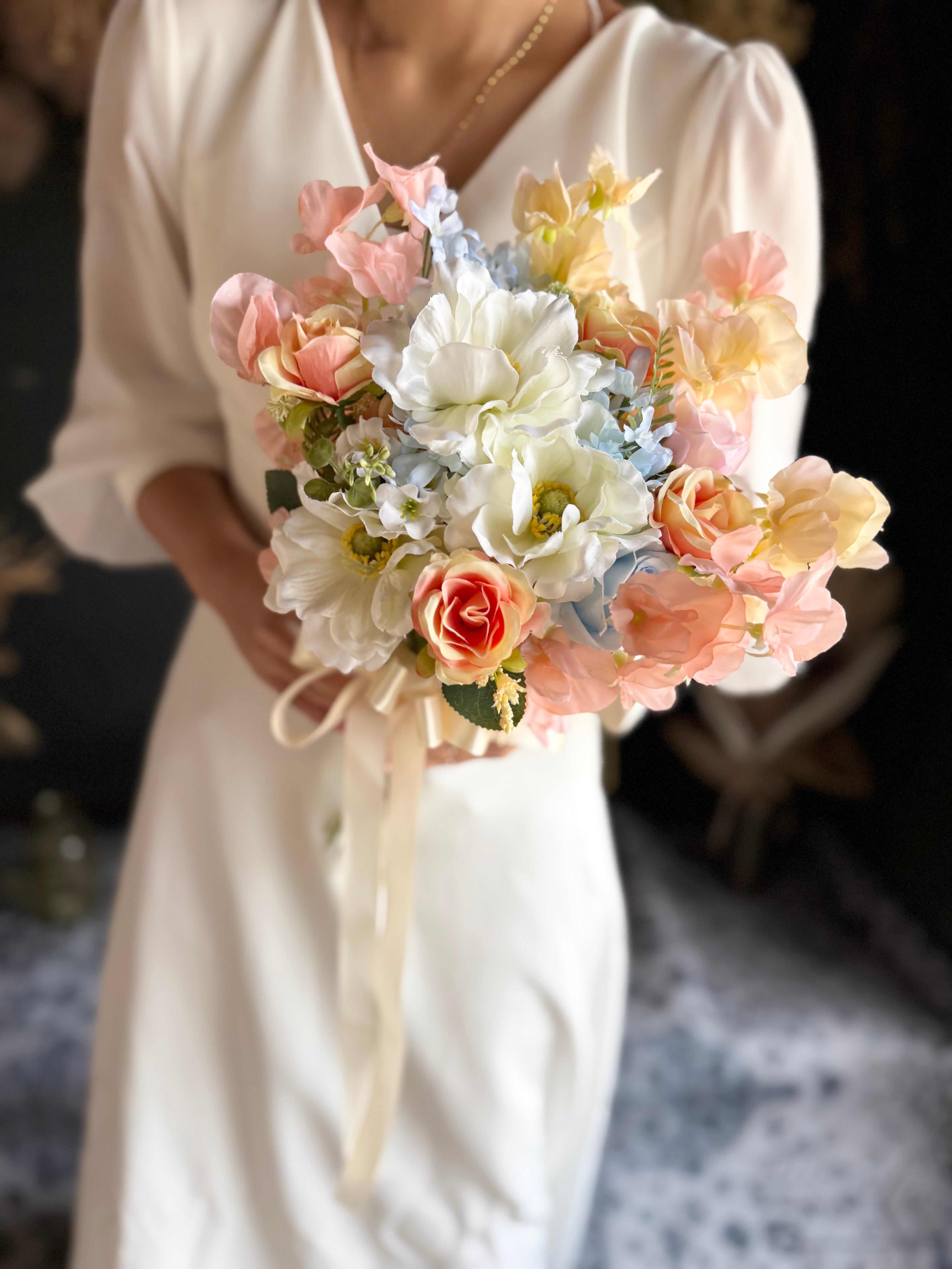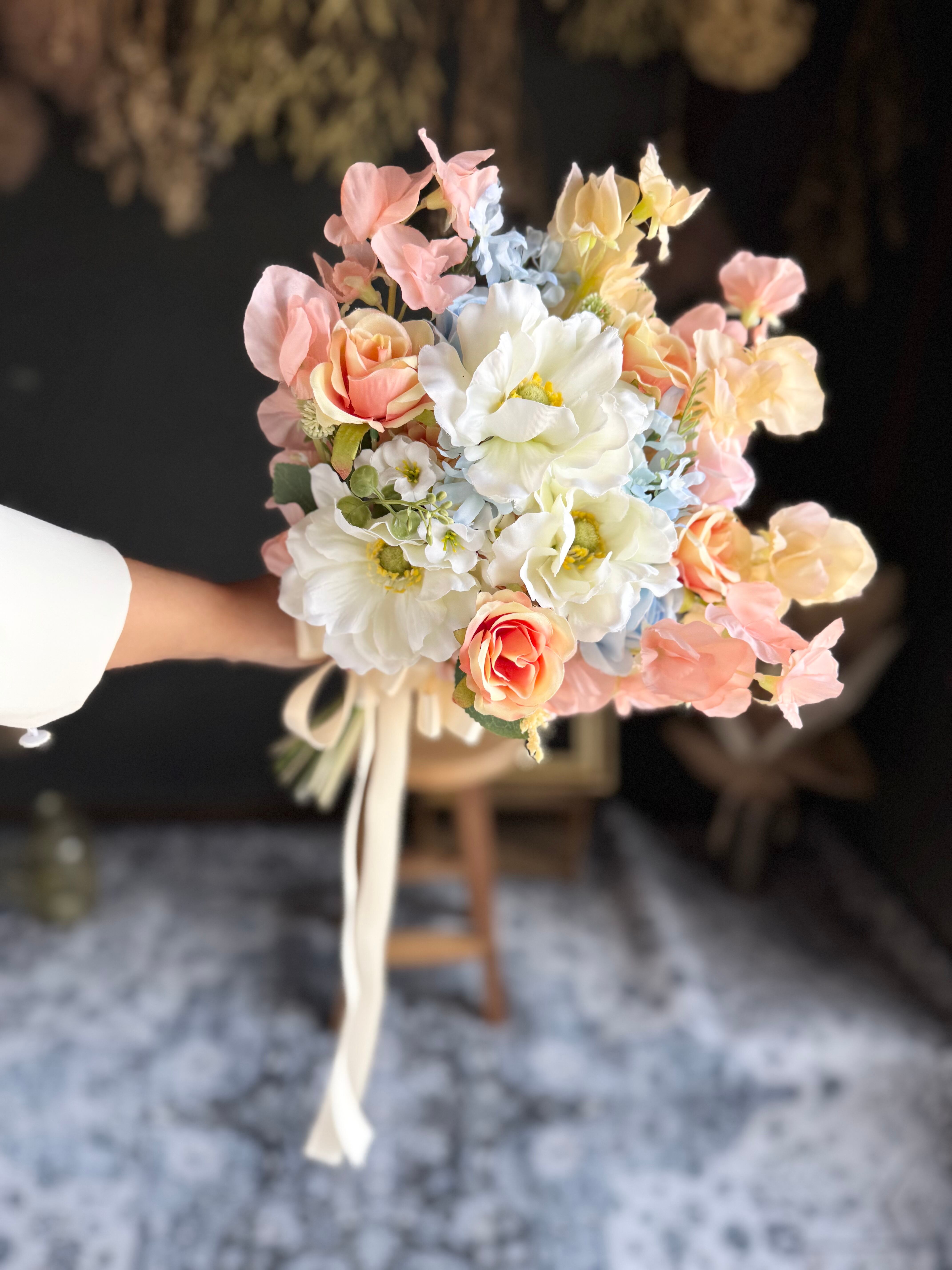 白の大輪アネモネと水色、サーモンピンクの小花を束ねたパステルカラーの可愛いクラッチブーケ•*・