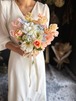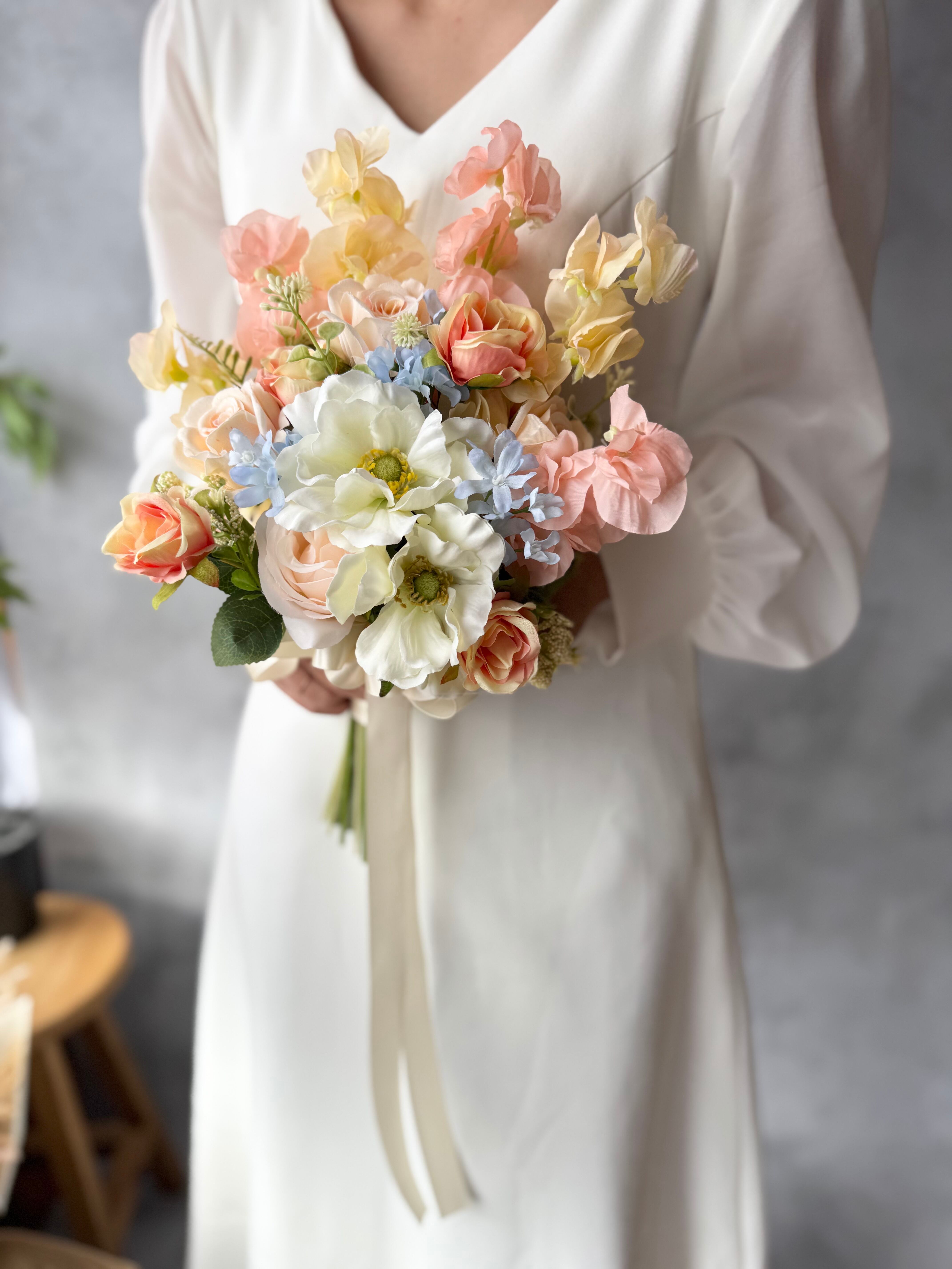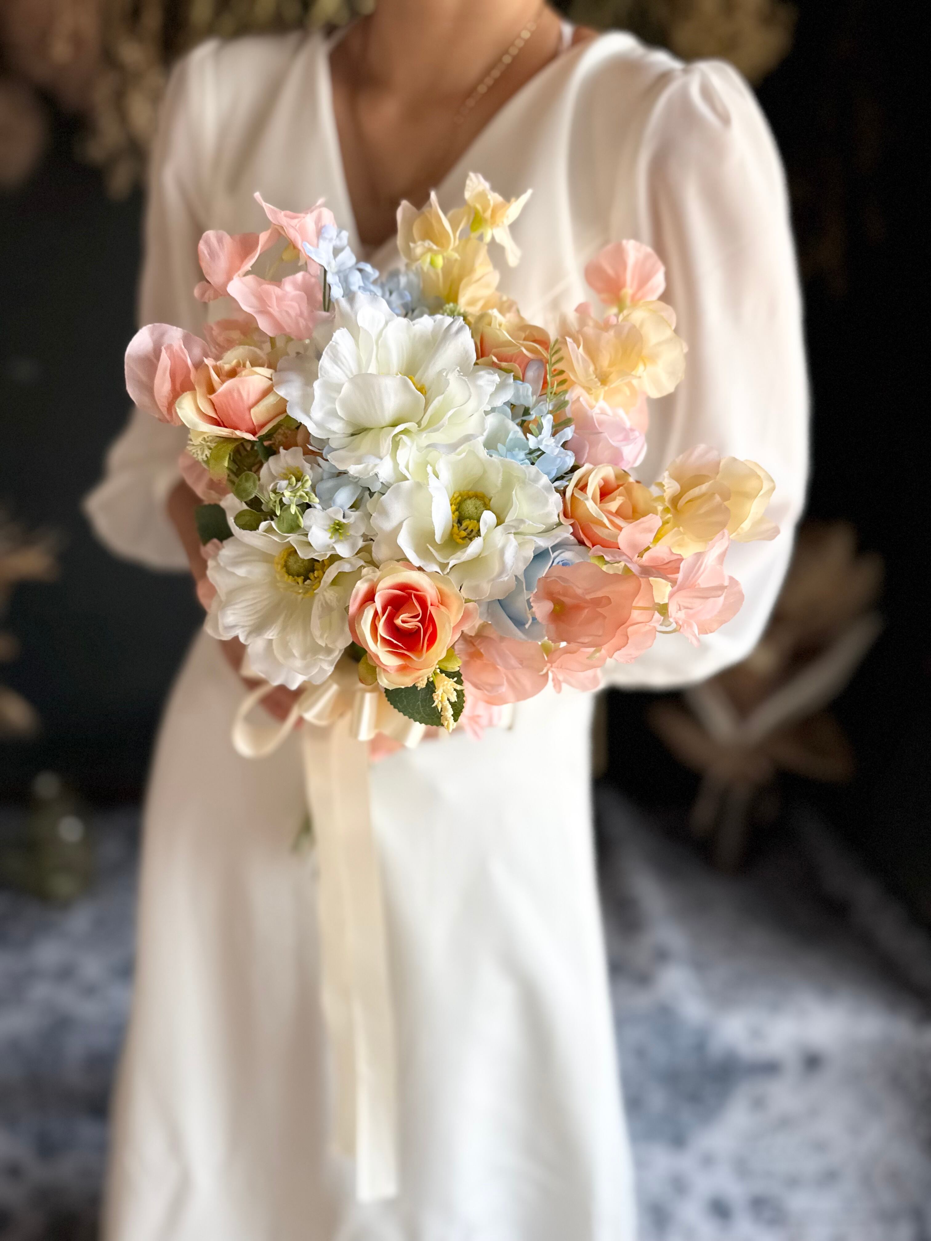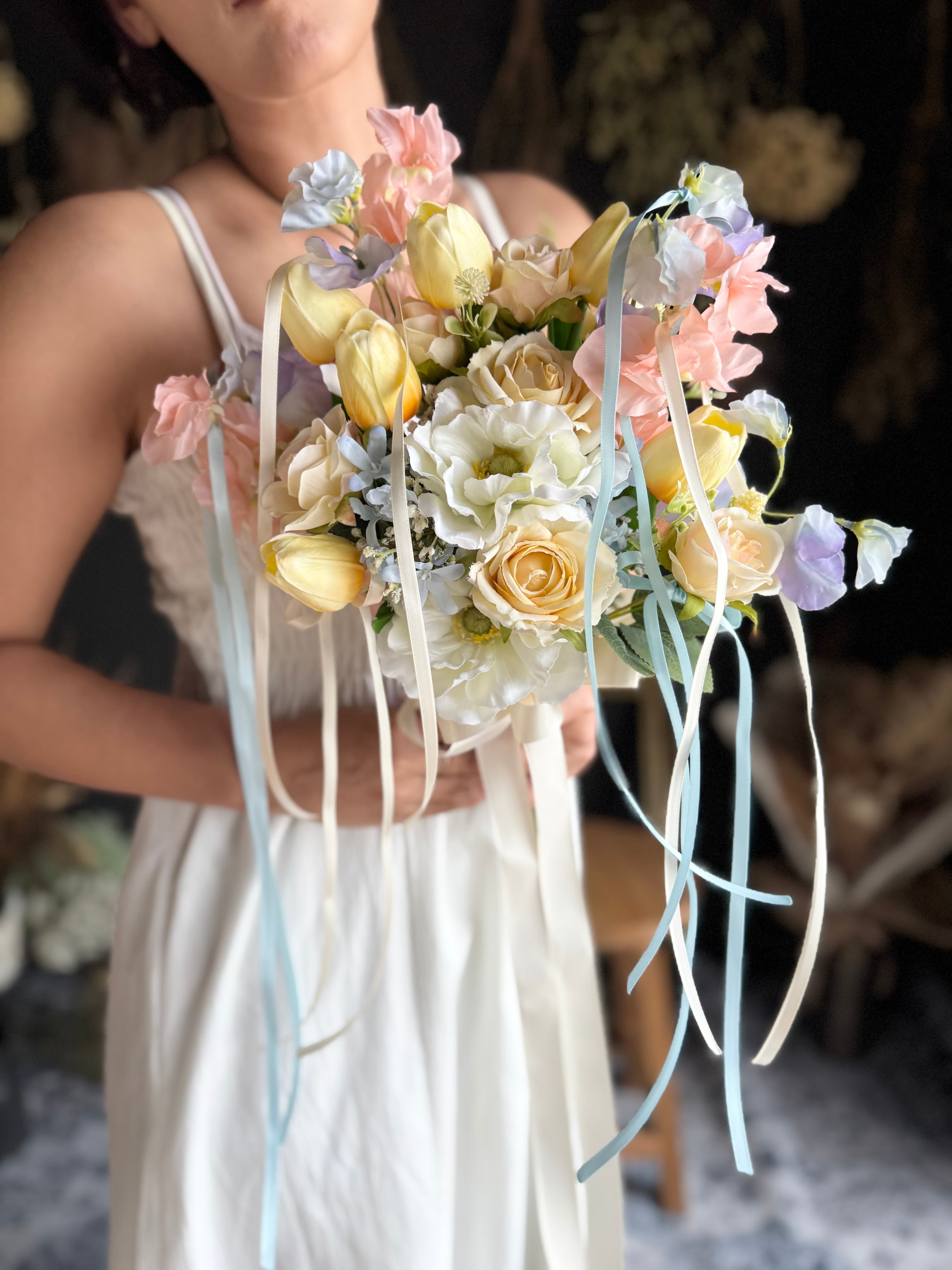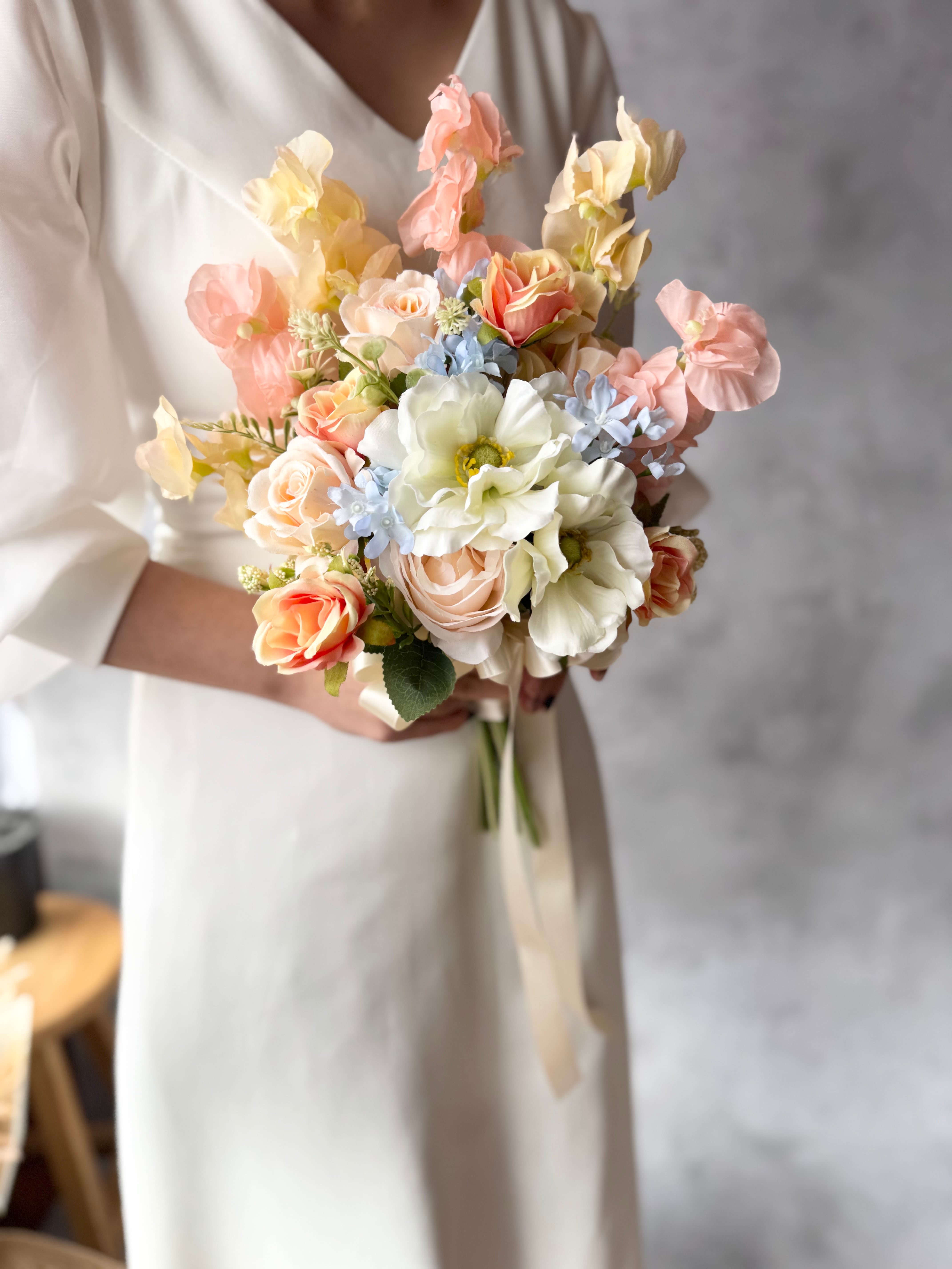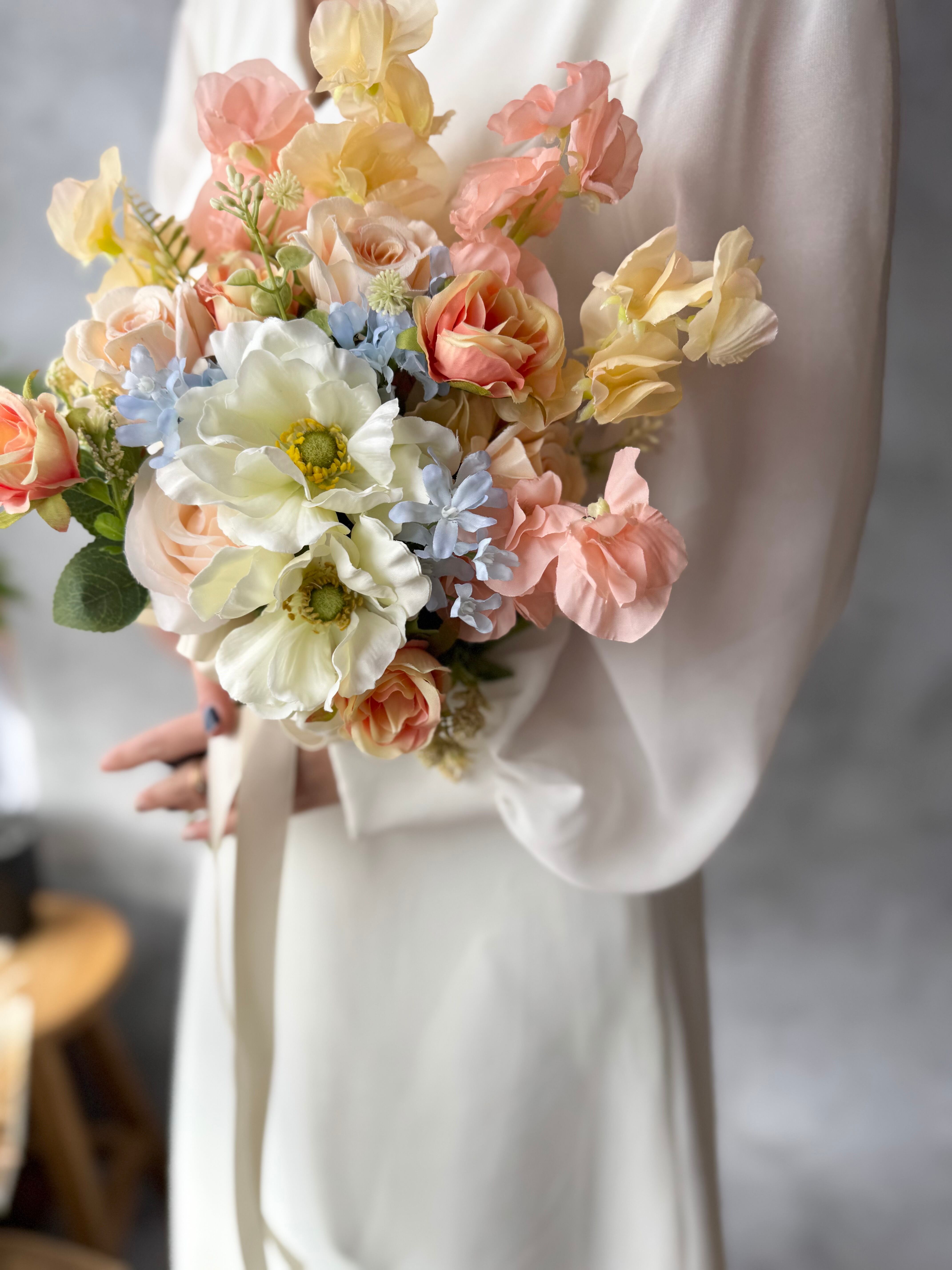 白の大輪アネモネと水色、サーモンピンクの小花を束ねたパステルカラーの可愛いクラッチブーケ•*・