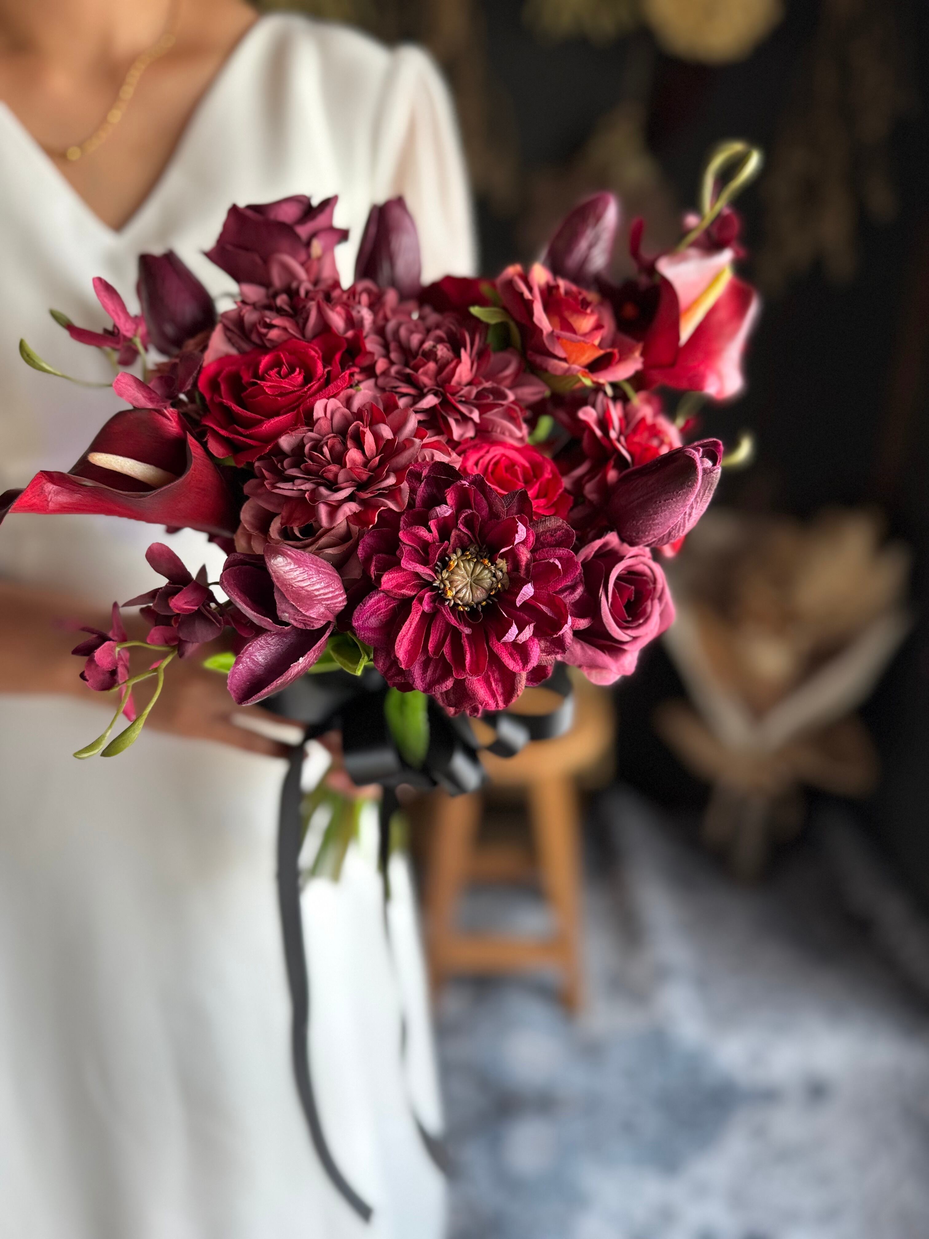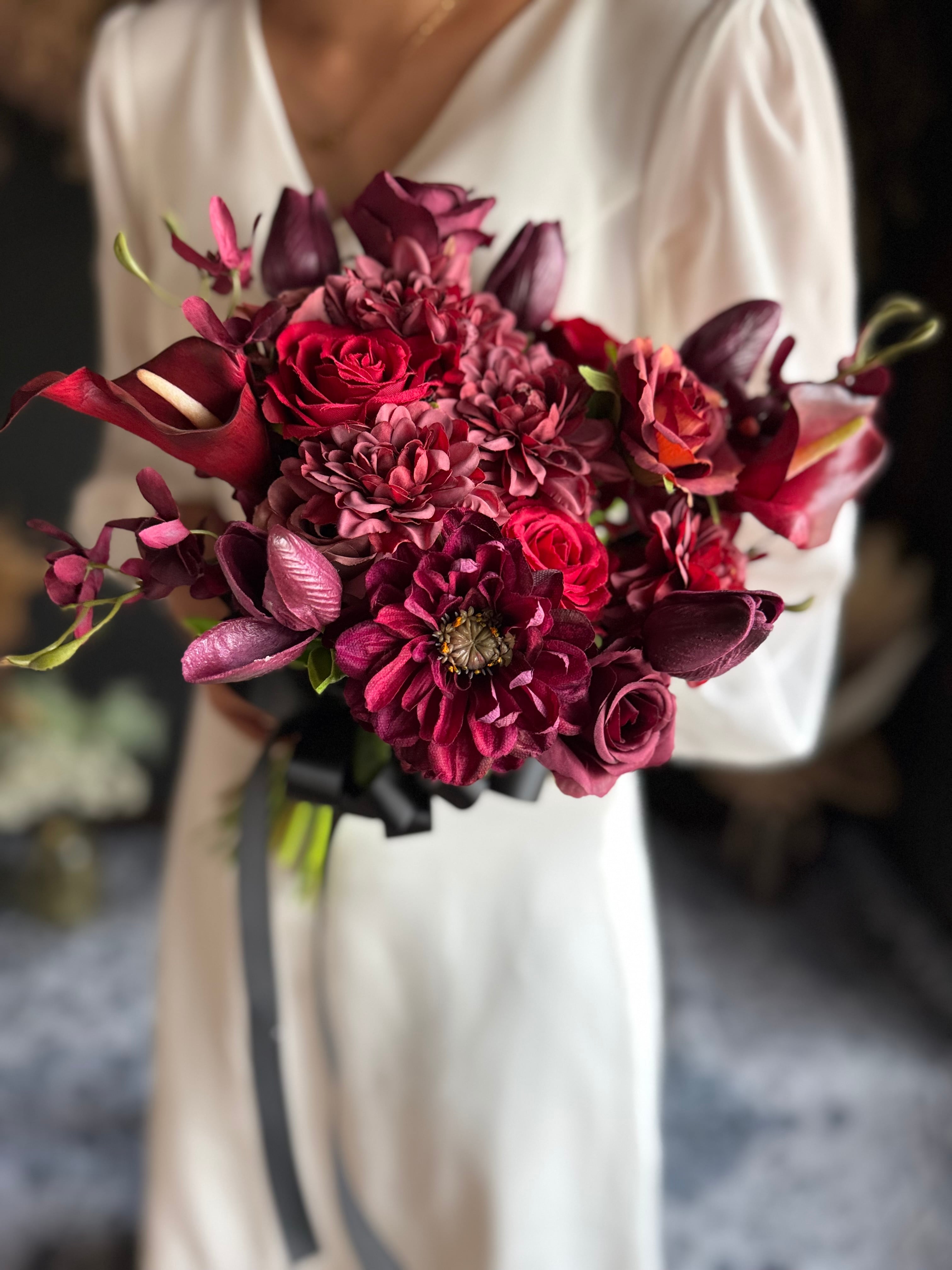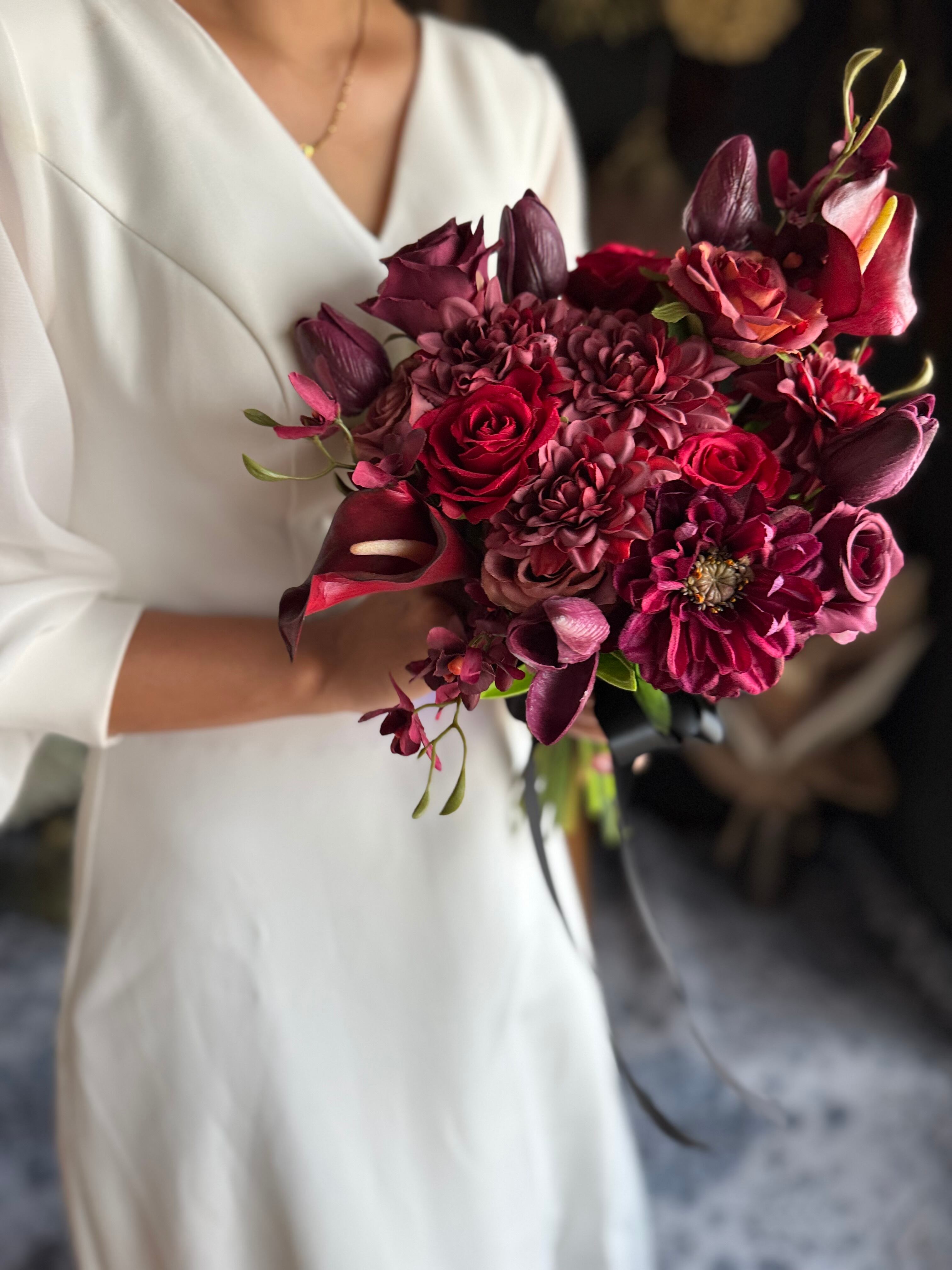 赤いバラを中心に、ダリアやカラーを組み合わせた上品なブーケ•*・リボン色の変更も可能です•*・ドレスに合わせてネイビーや黒リボンも似合います•*・