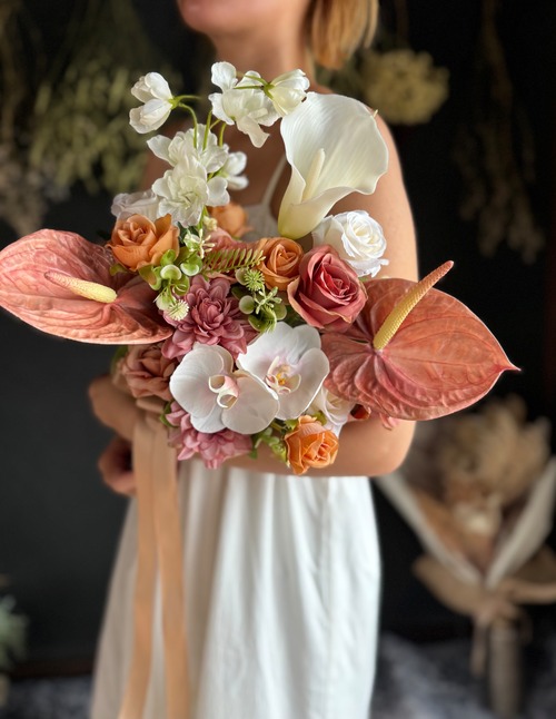 落ち着いたテラコッタカラーに、ホワイト系の花材を加えて大人っぽくも華やかな印象に