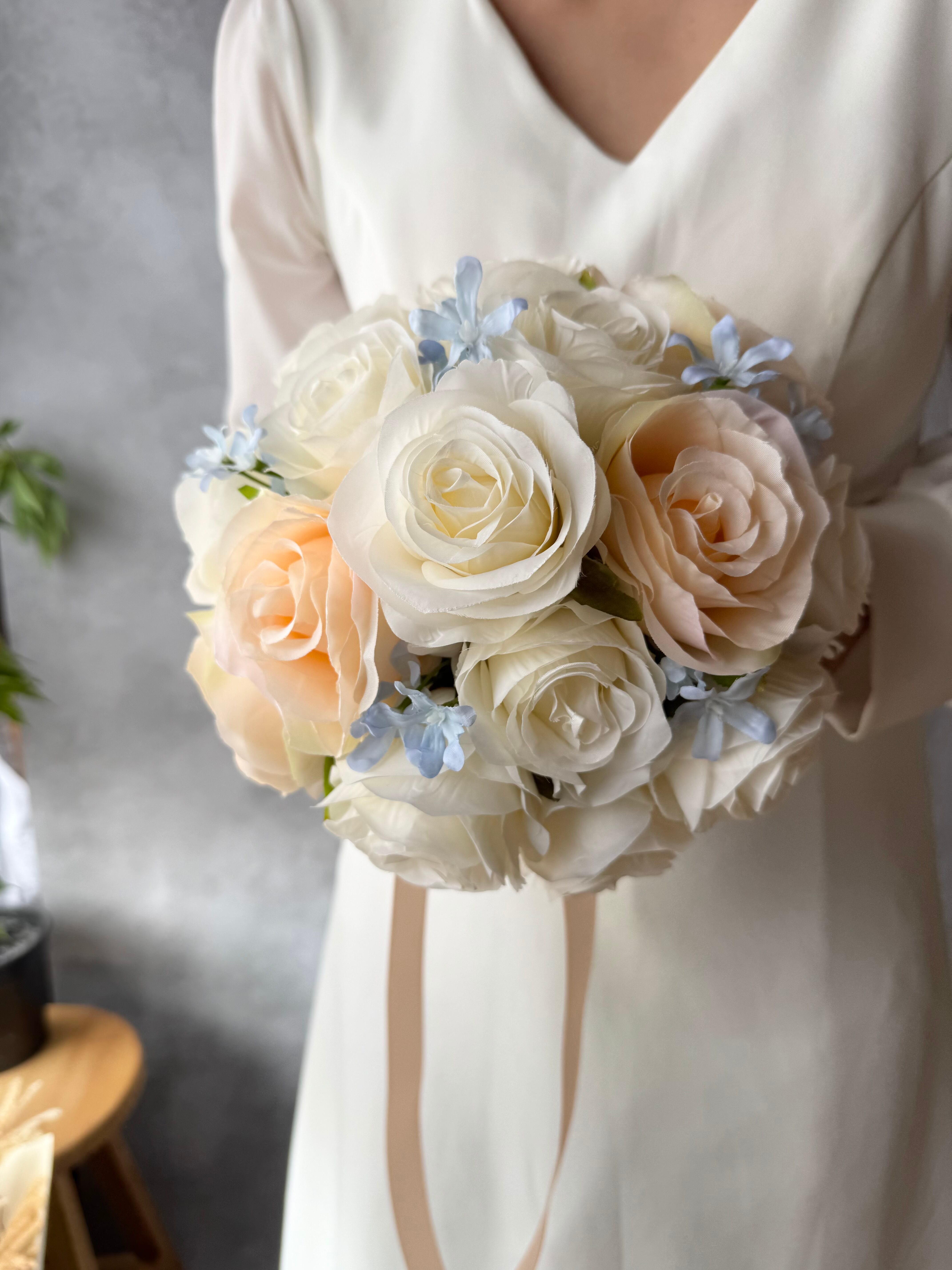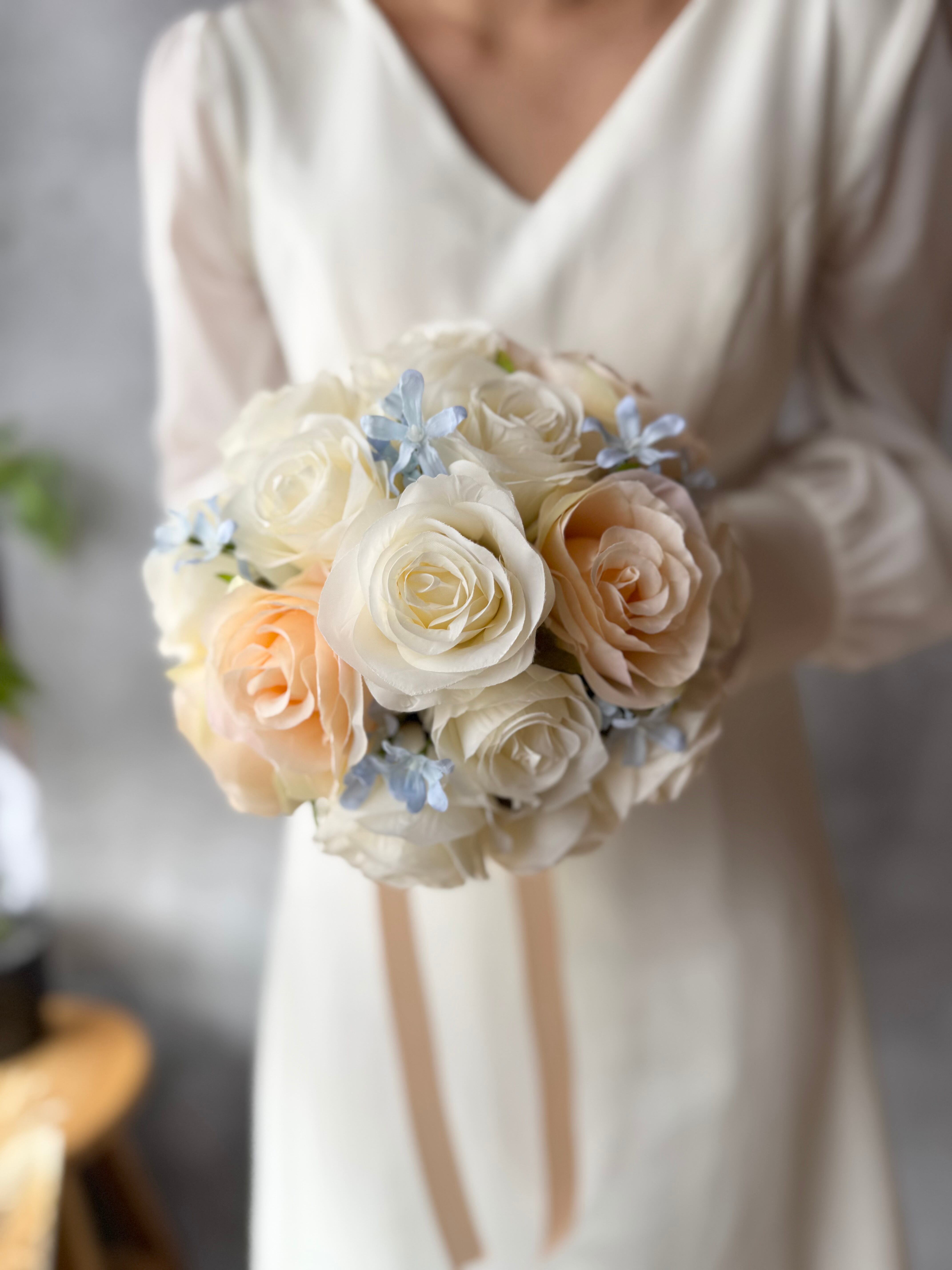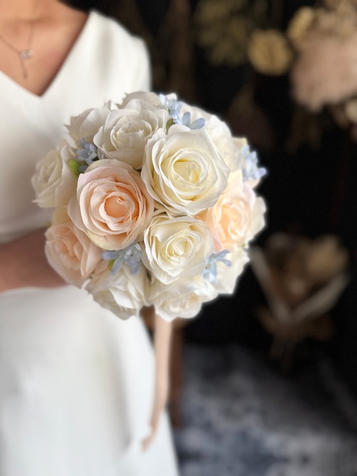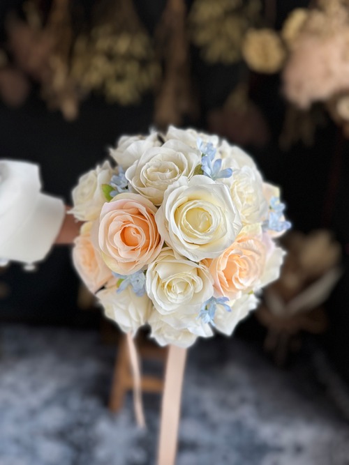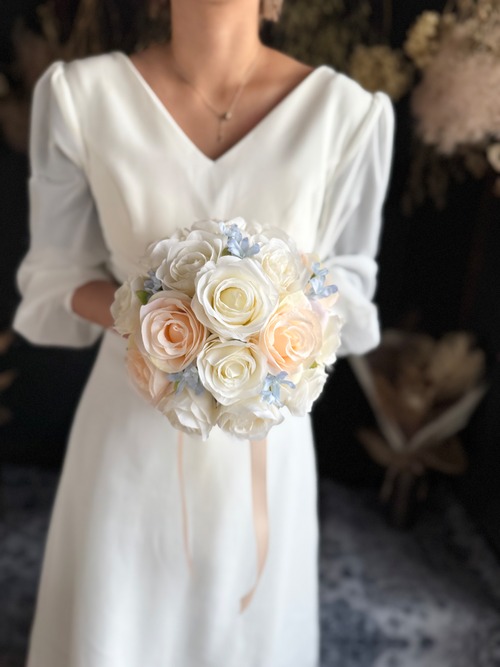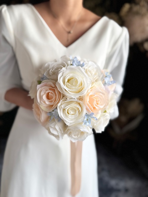 アイボリー、淡いオレンジ、ブルーといろんなドレスに合わせやすいデザイン•*・花嫁様を彩る特別なブーケ•*・