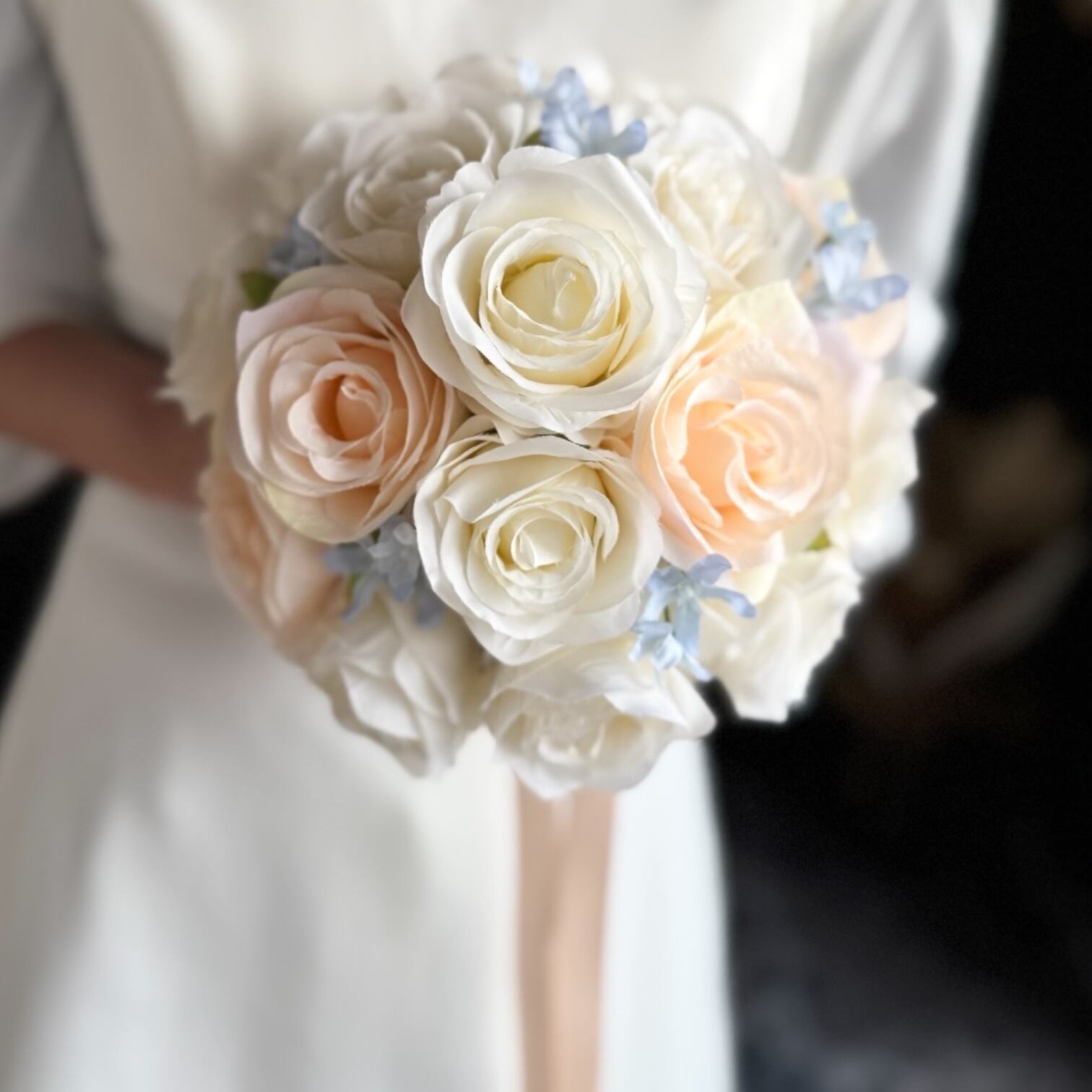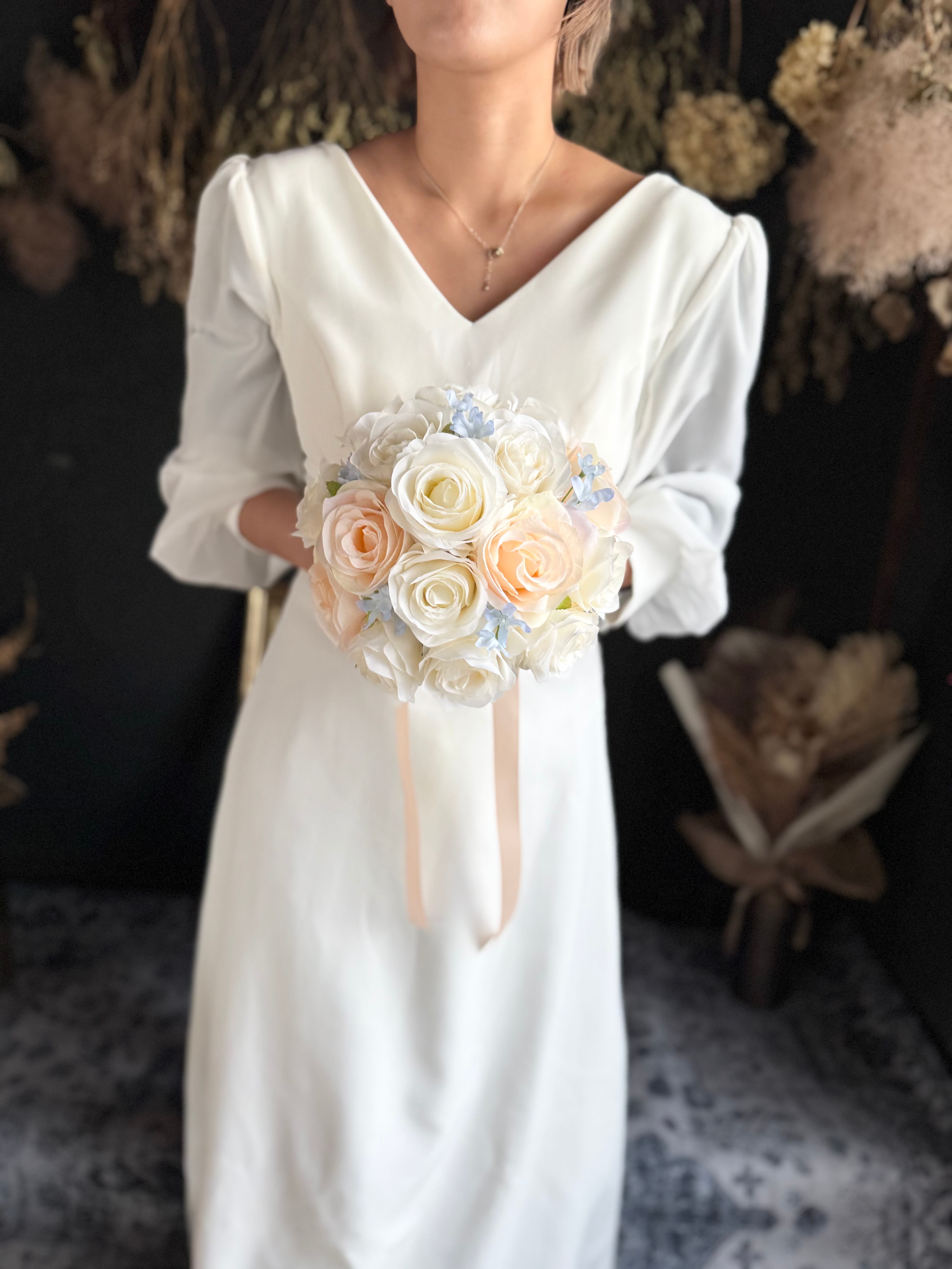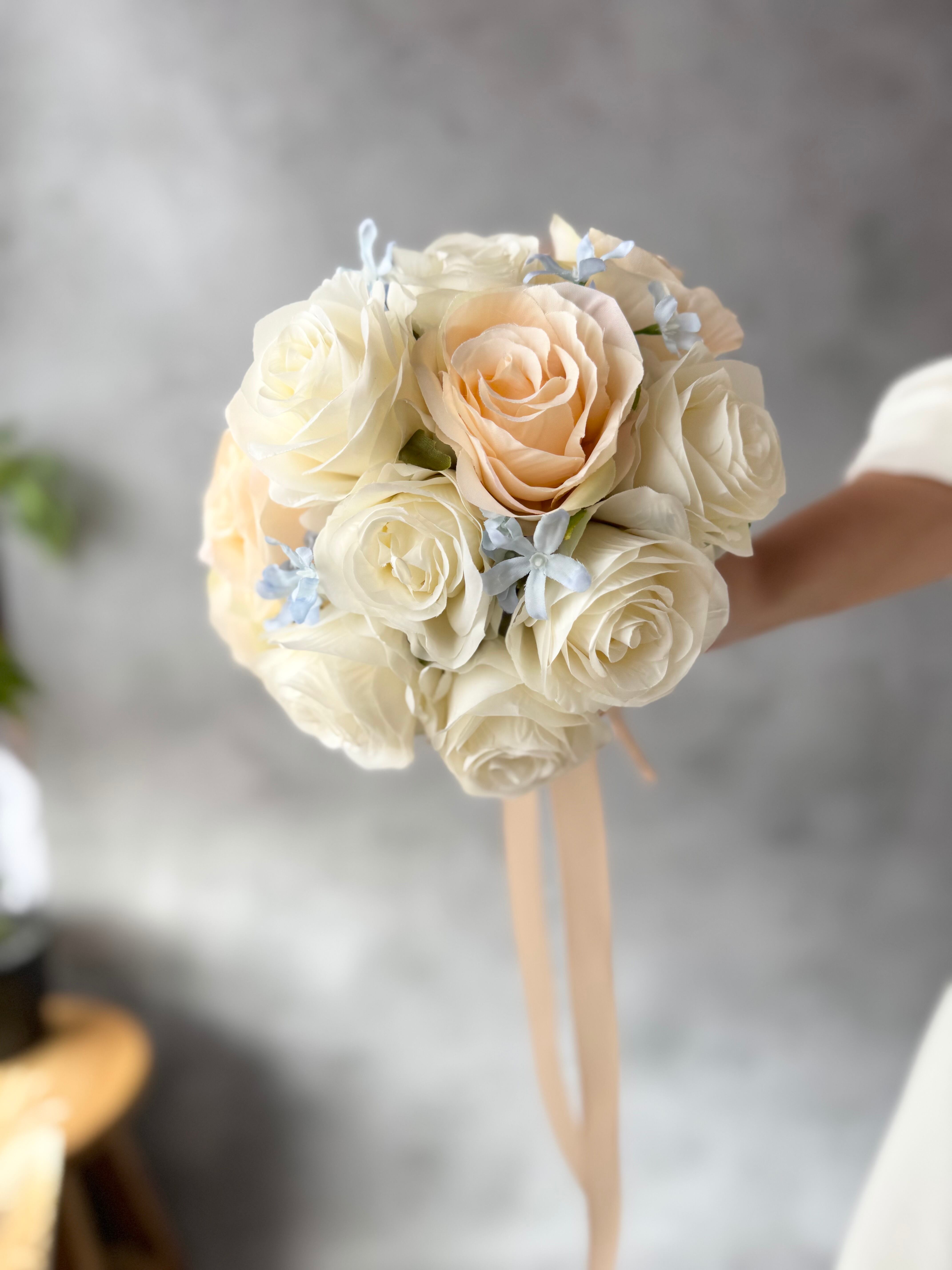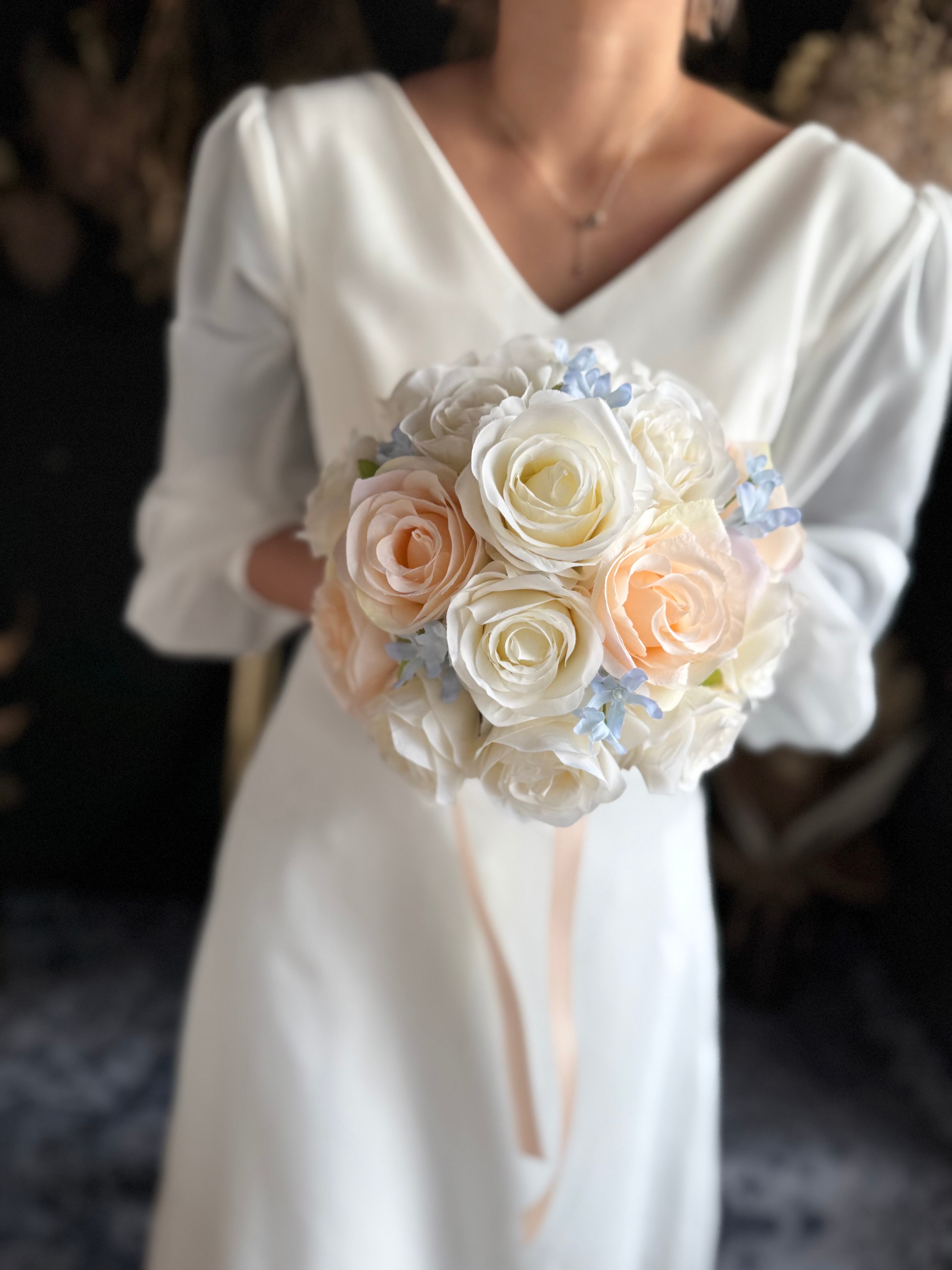アイボリー、淡いオレンジ、ブルーといろんなドレスに合わせやすいデザイン•*・花嫁様を彩る特別なブーケ•*・