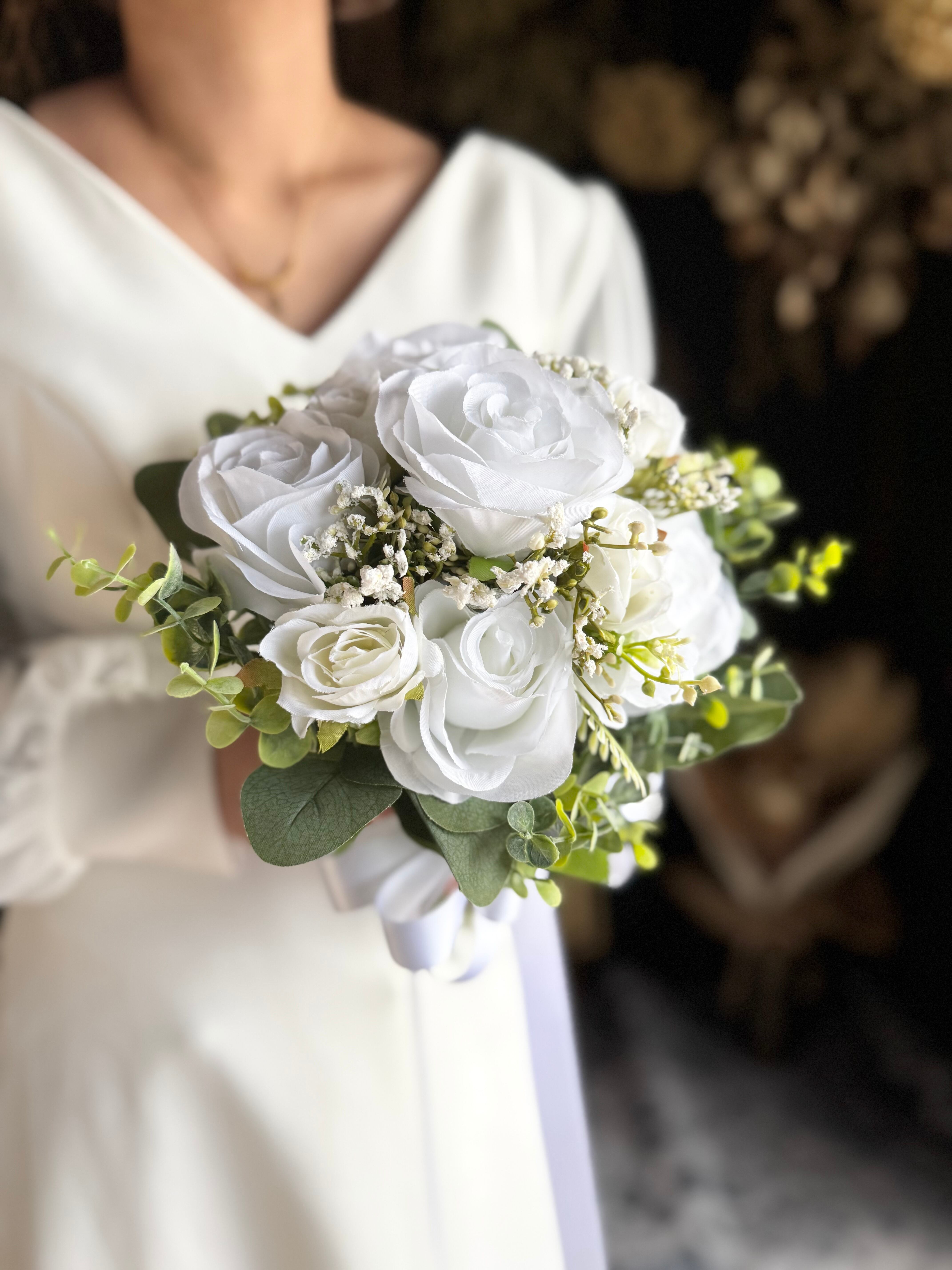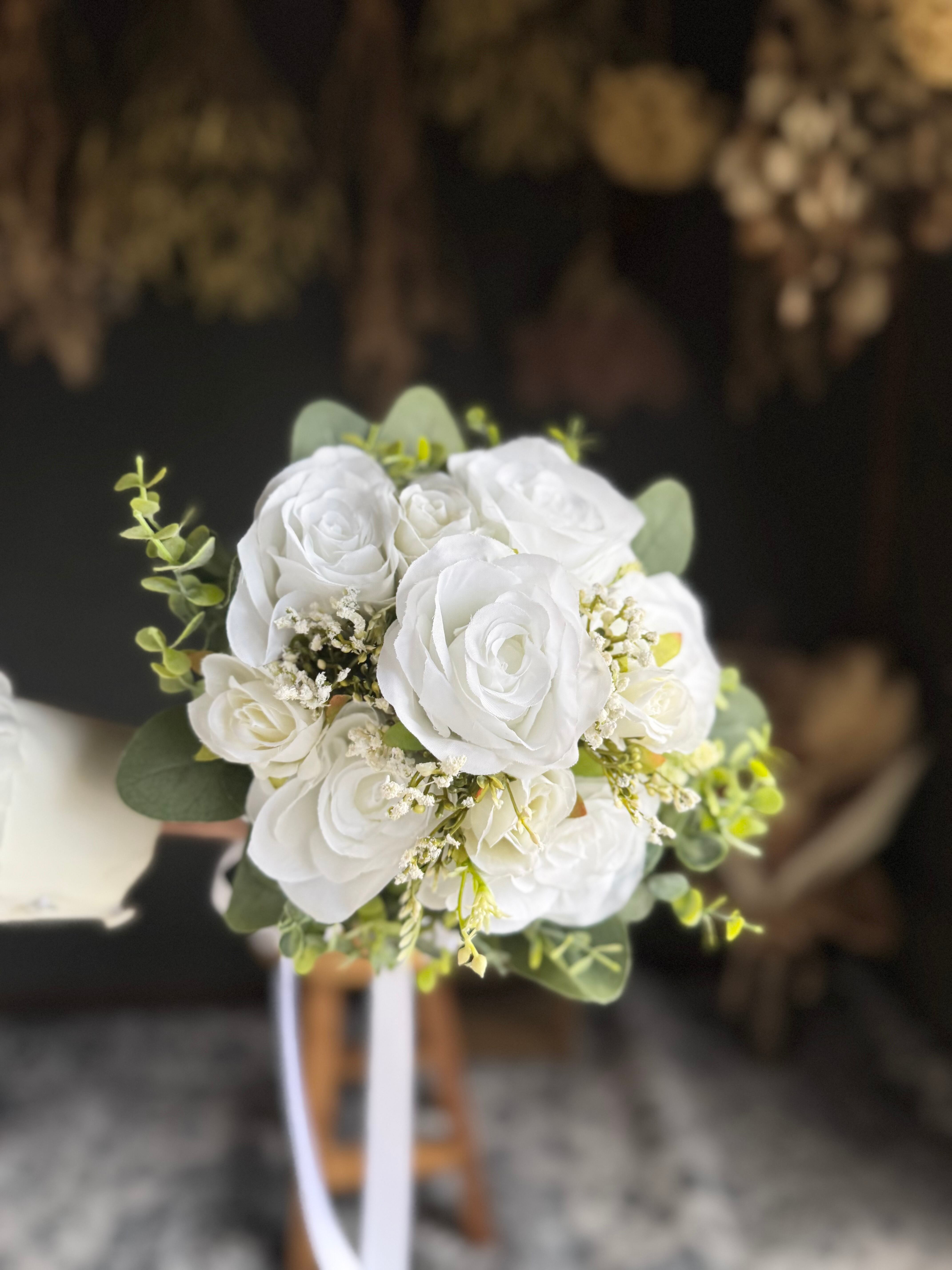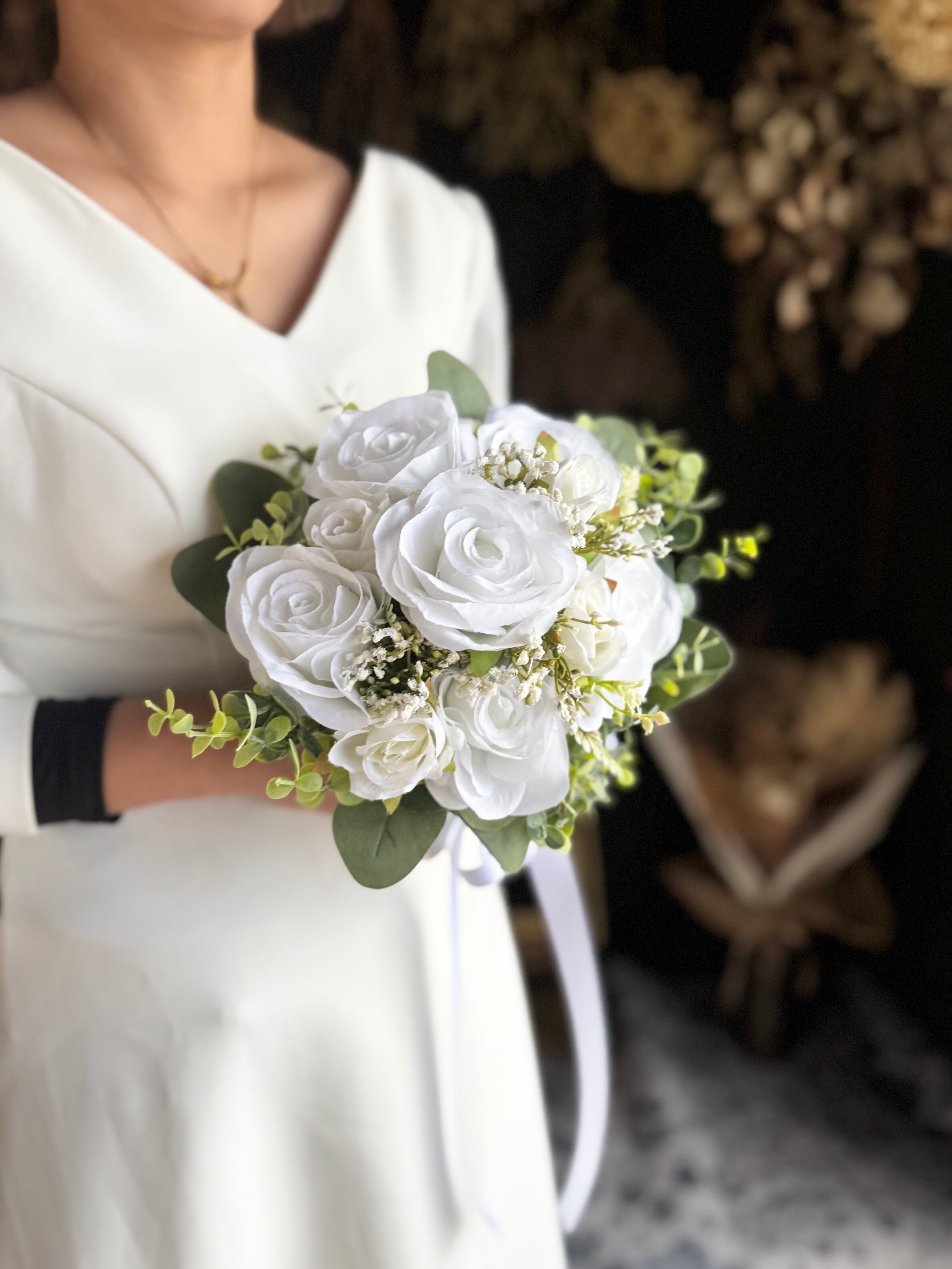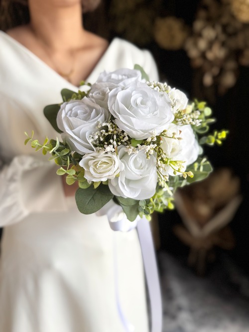 ナチュラルで合わせやすいクラッチブーケです♡ 白バラの華やかさが、華やかな雰囲気を引き立ててくれます♪可愛いらしく手元に持ちやすいサイズ感で、生花よりも軽く持ちやすく、気軽に持ち歩くことができます♪