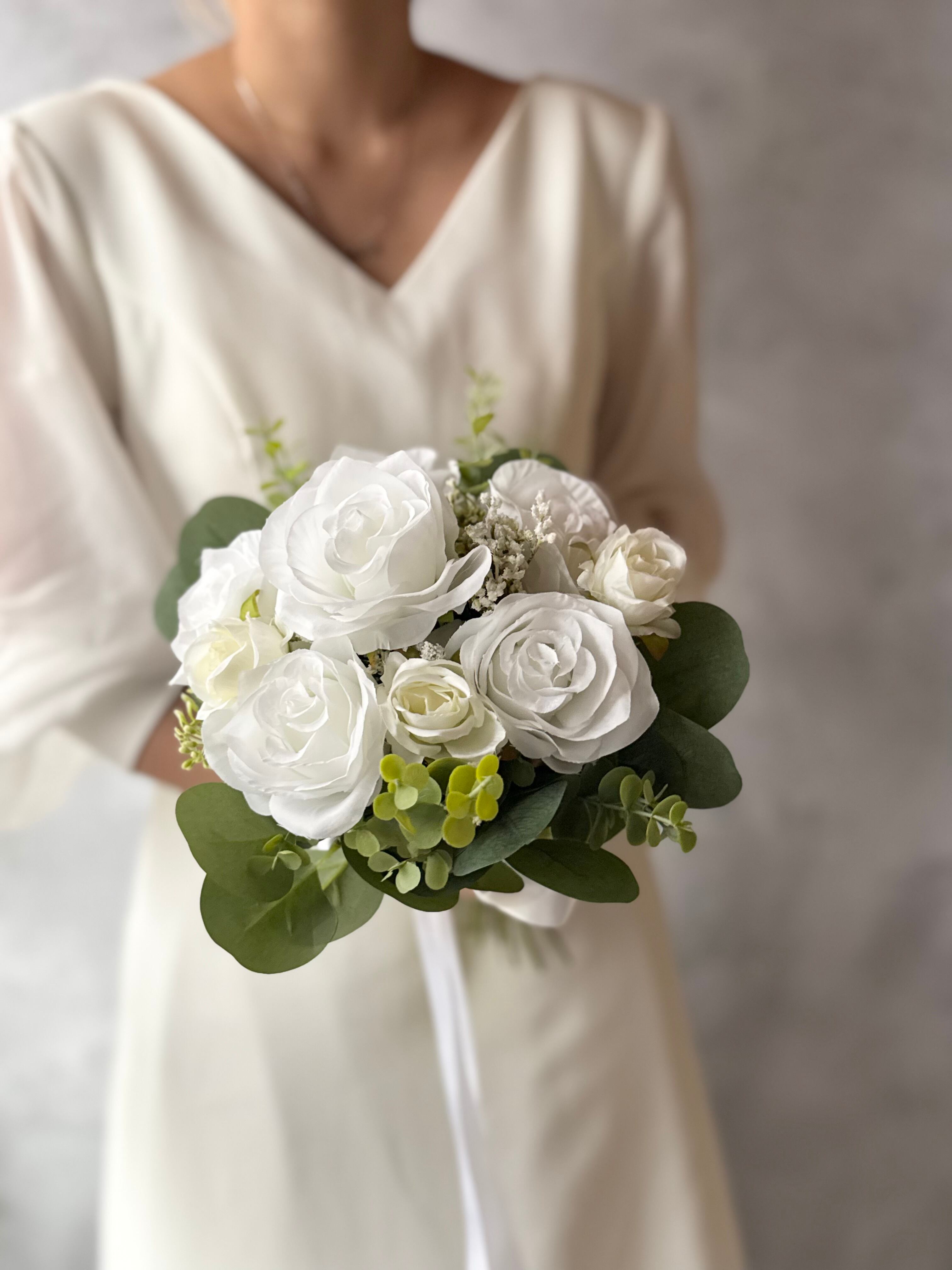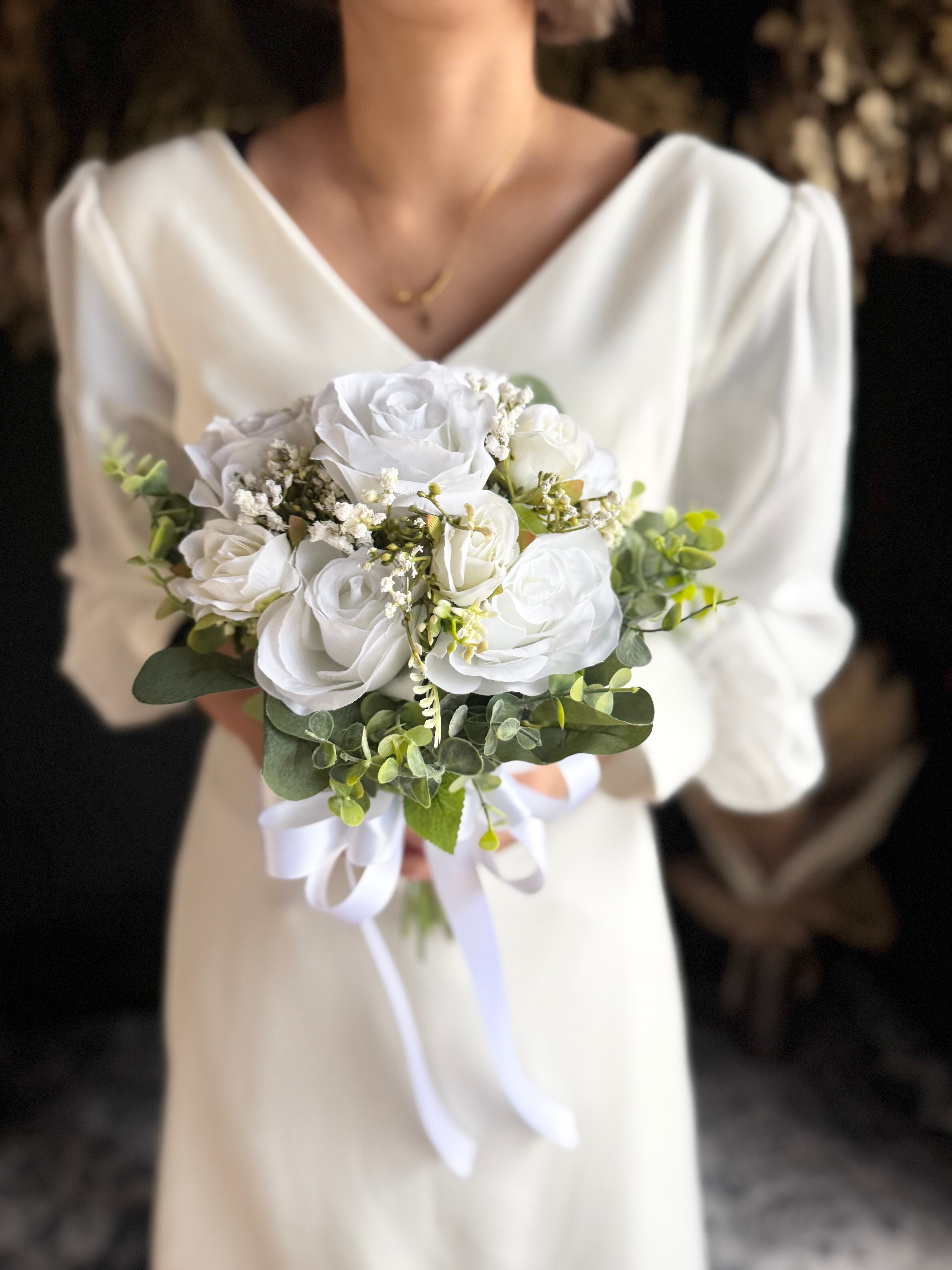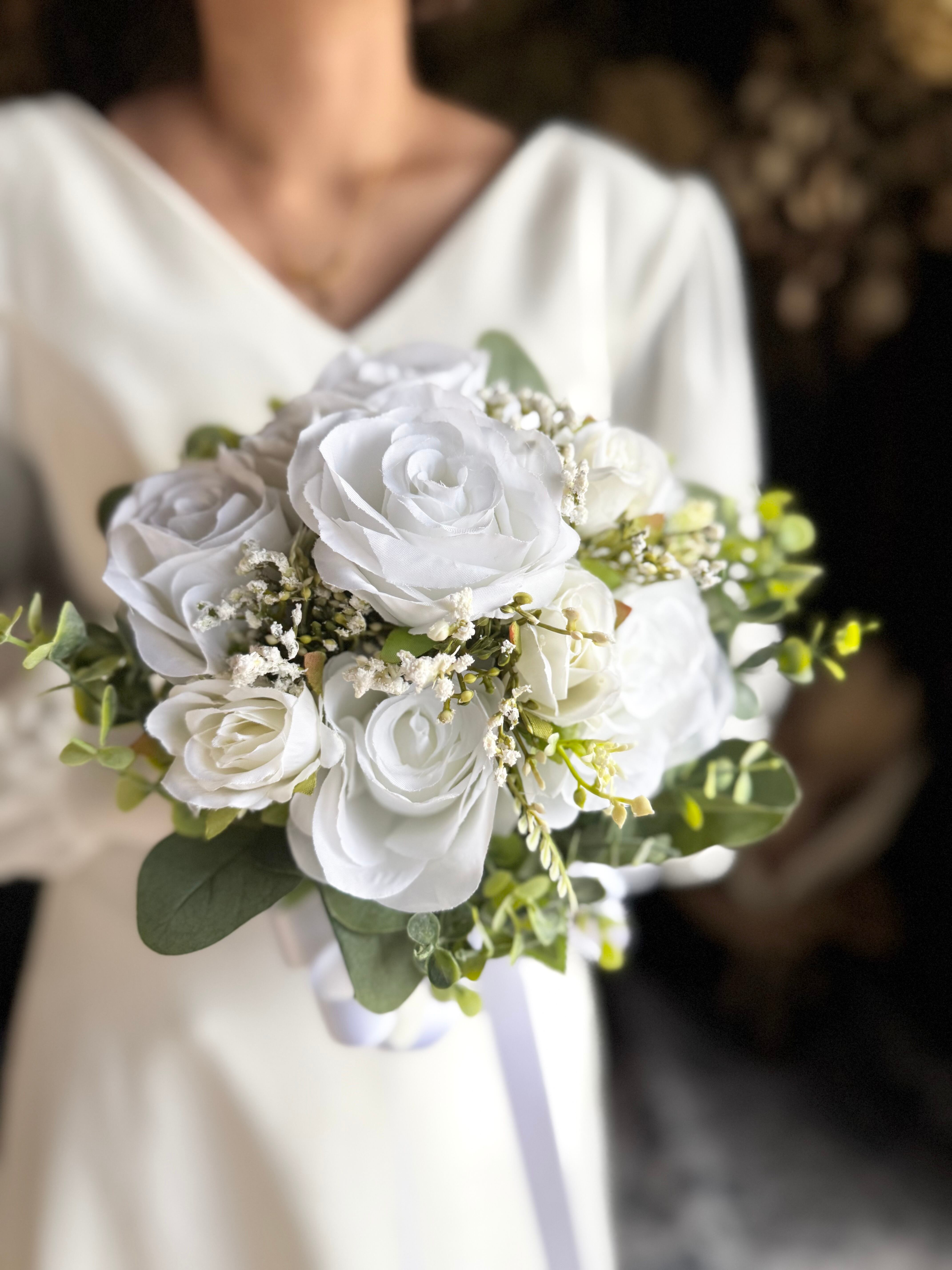 ナチュラルで合わせやすいクラッチブーケです♡ 白バラの華やかさが、華やかな雰囲気を引き立ててくれます♪可愛いらしく手元に持ちやすいサイズ感で、生花よりも軽く持ちやすく、気軽に持ち歩くことができます♪