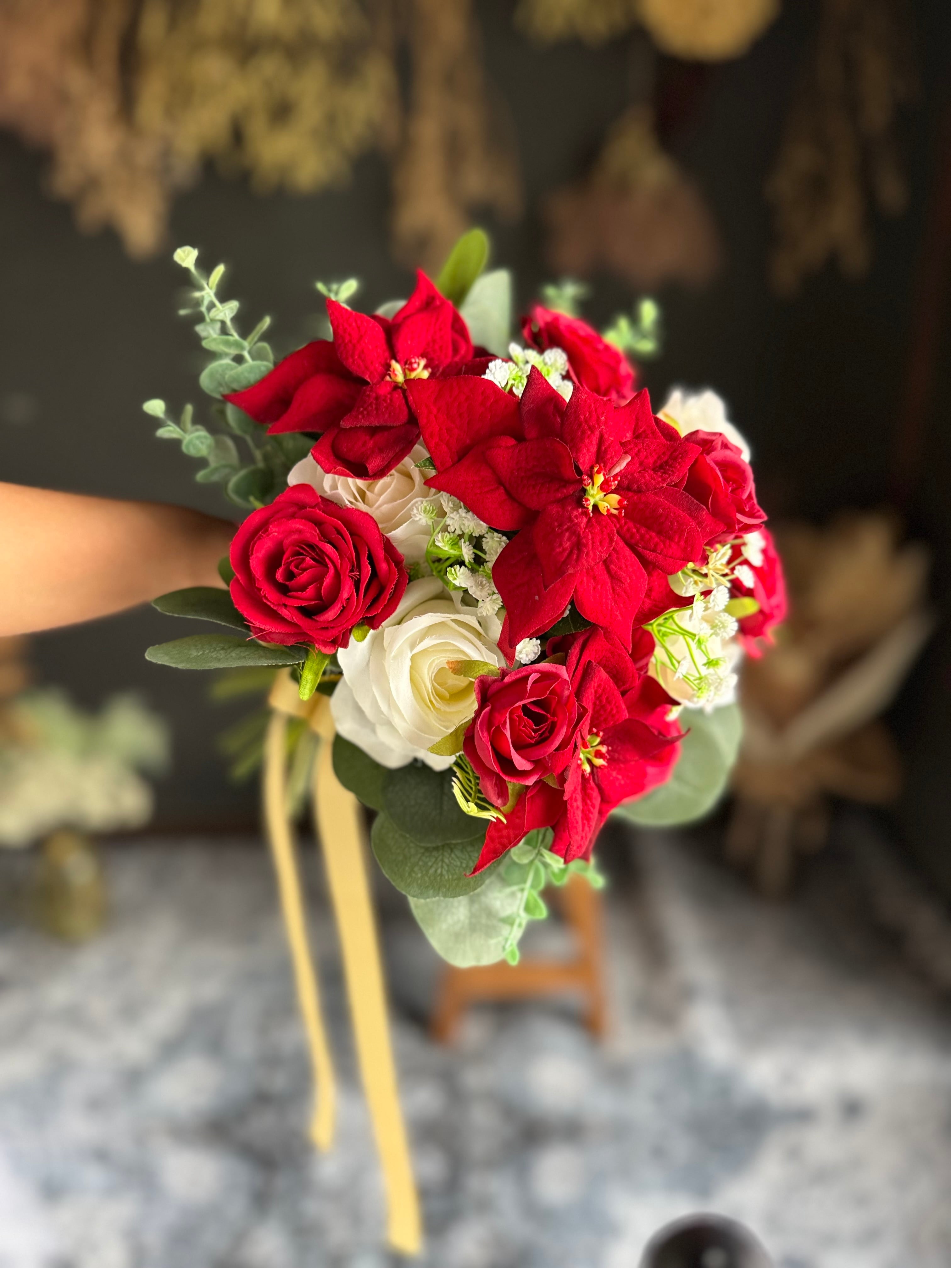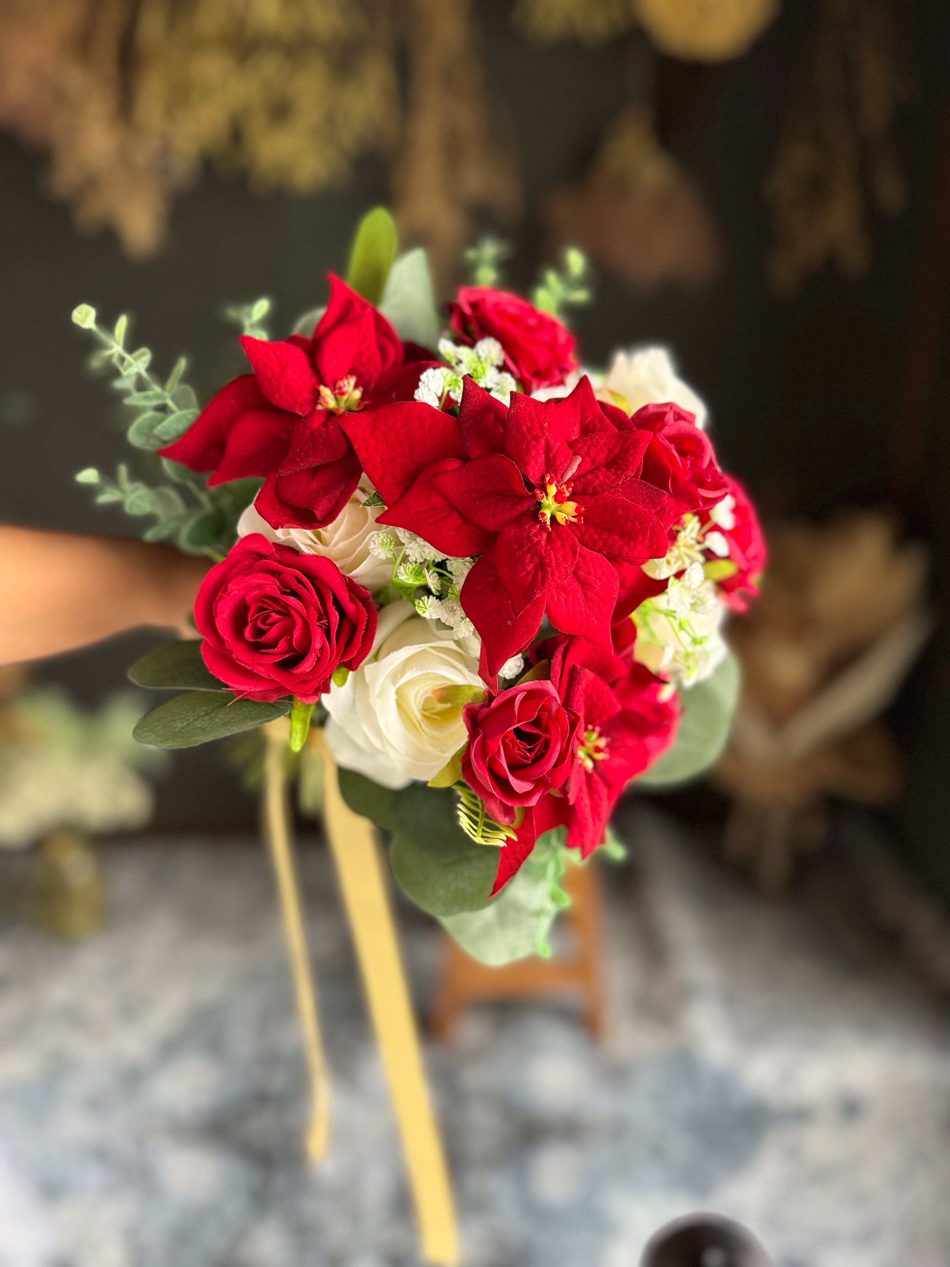 深紅のポインセチアとローズをメインに、白いローズを合わせた華やかなブーケです。
