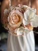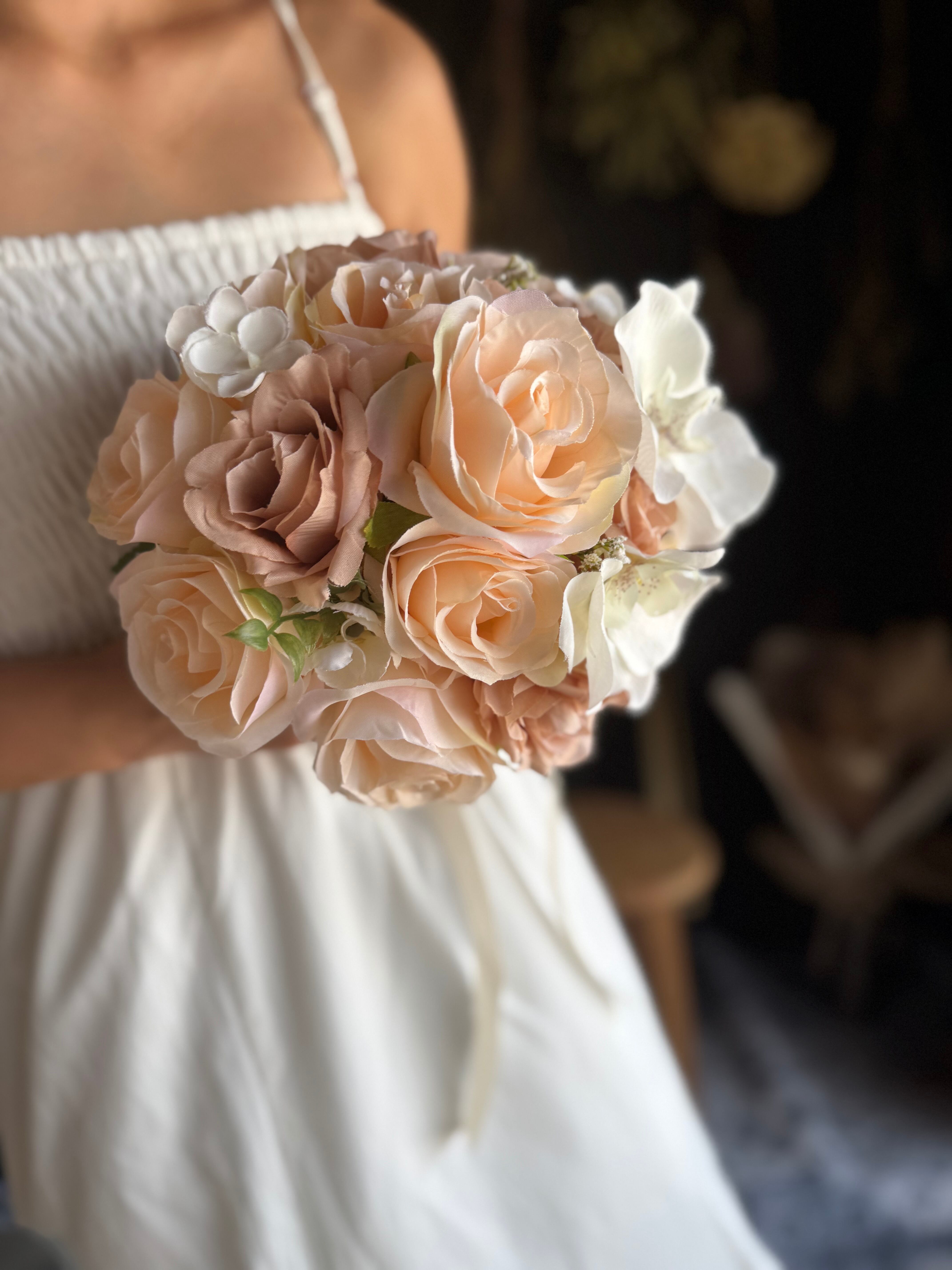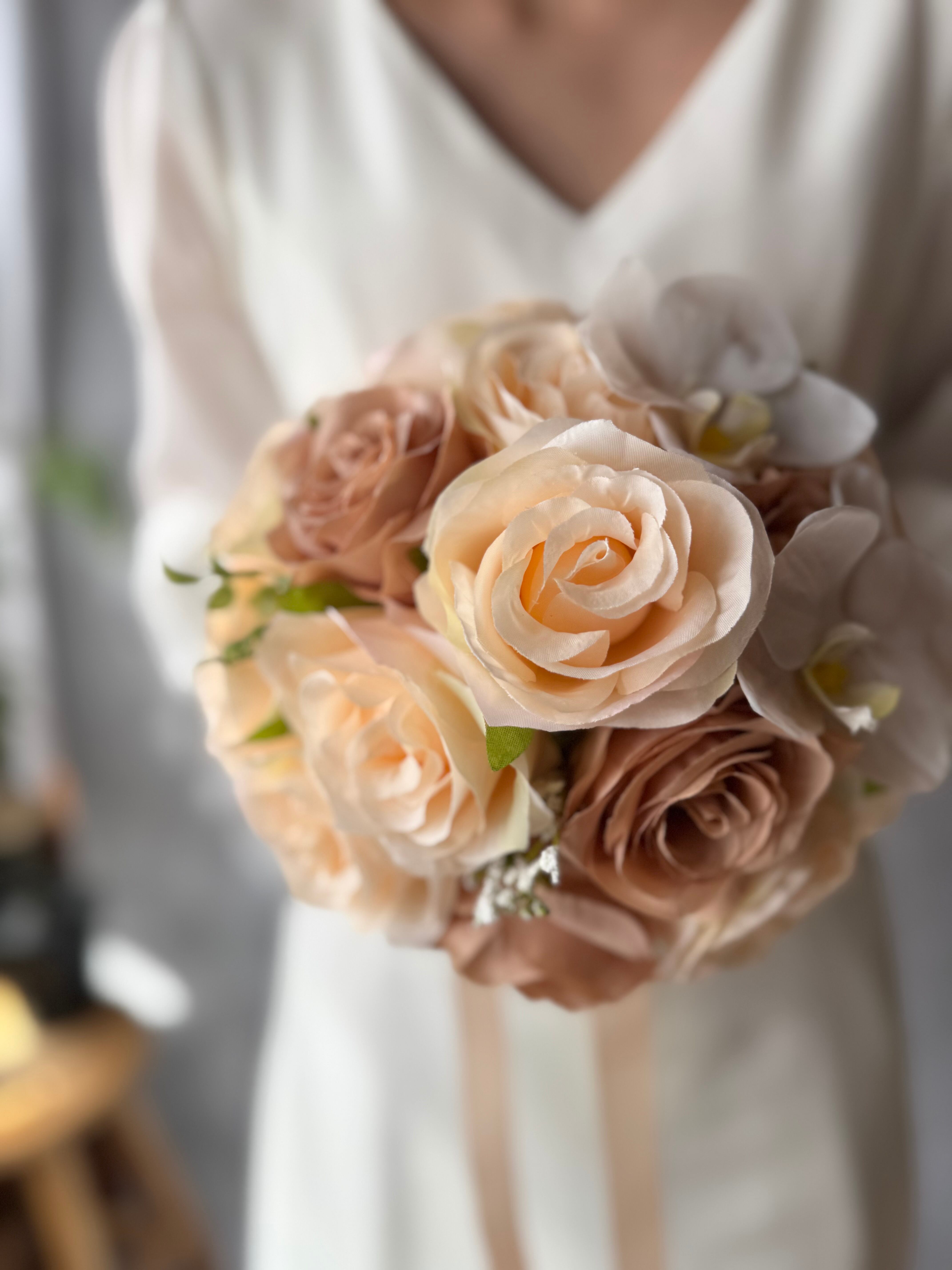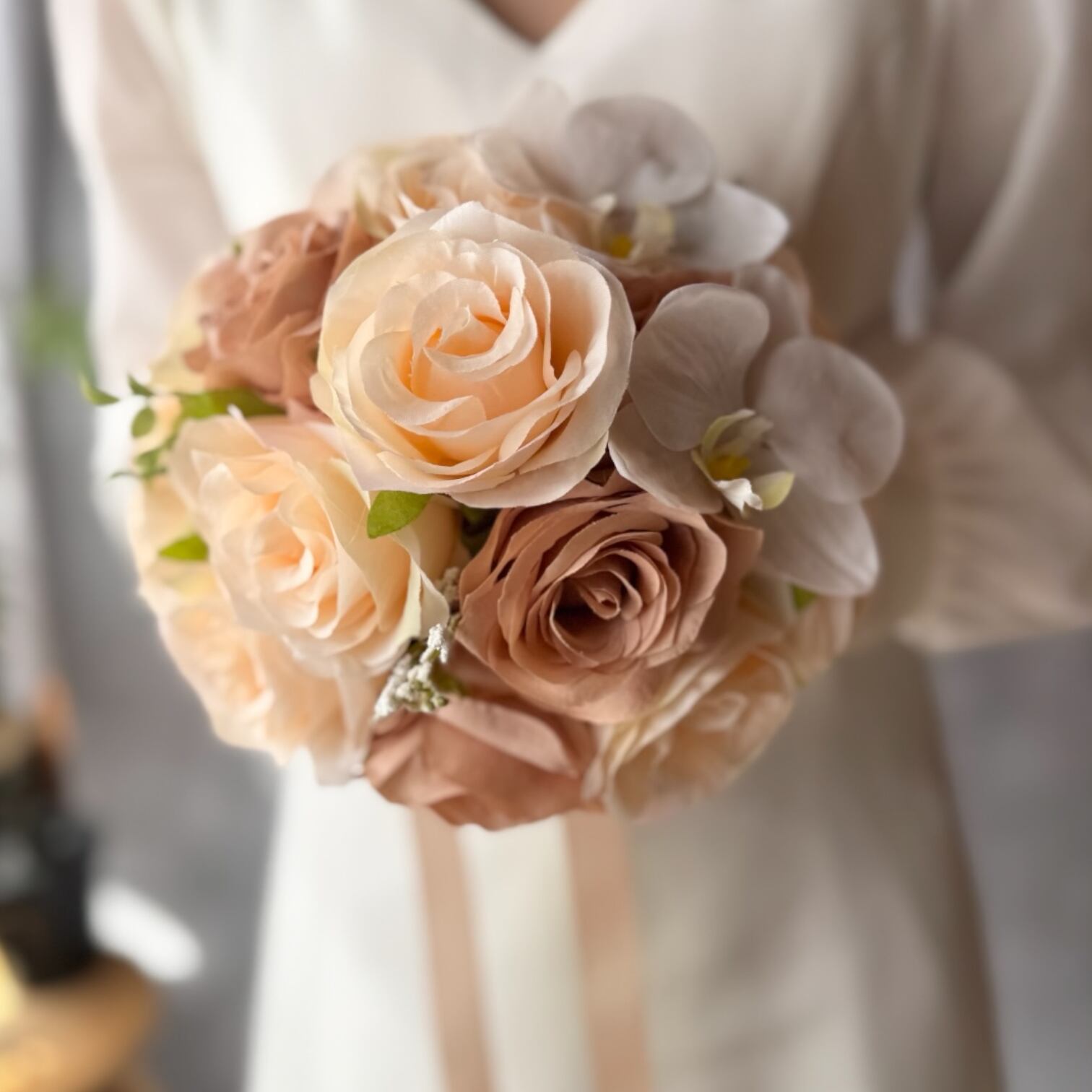 やわらかなピーチやベージュのバラに、ホワイトの胡蝶蘭を合わせたエレガントなブーケ。