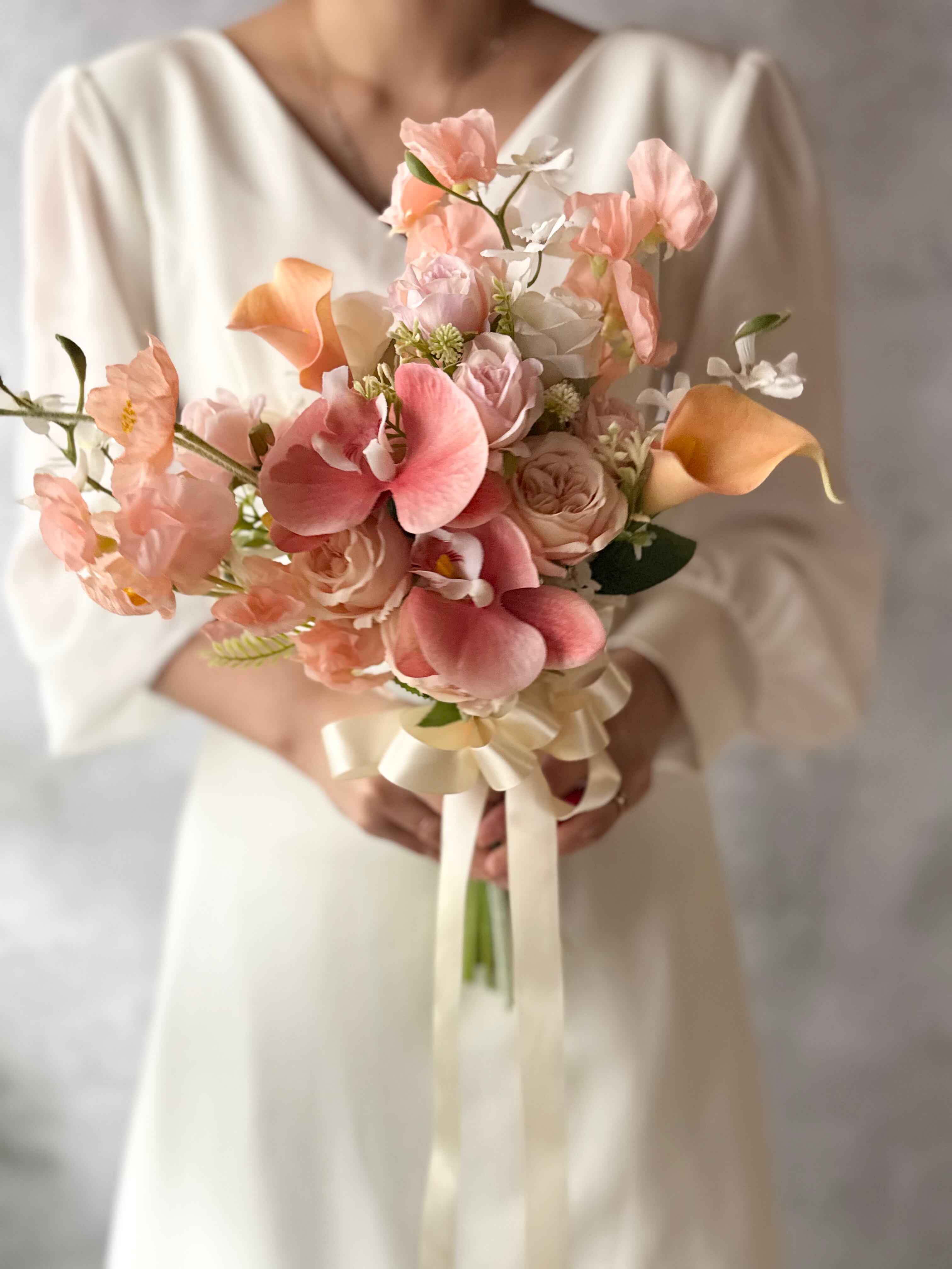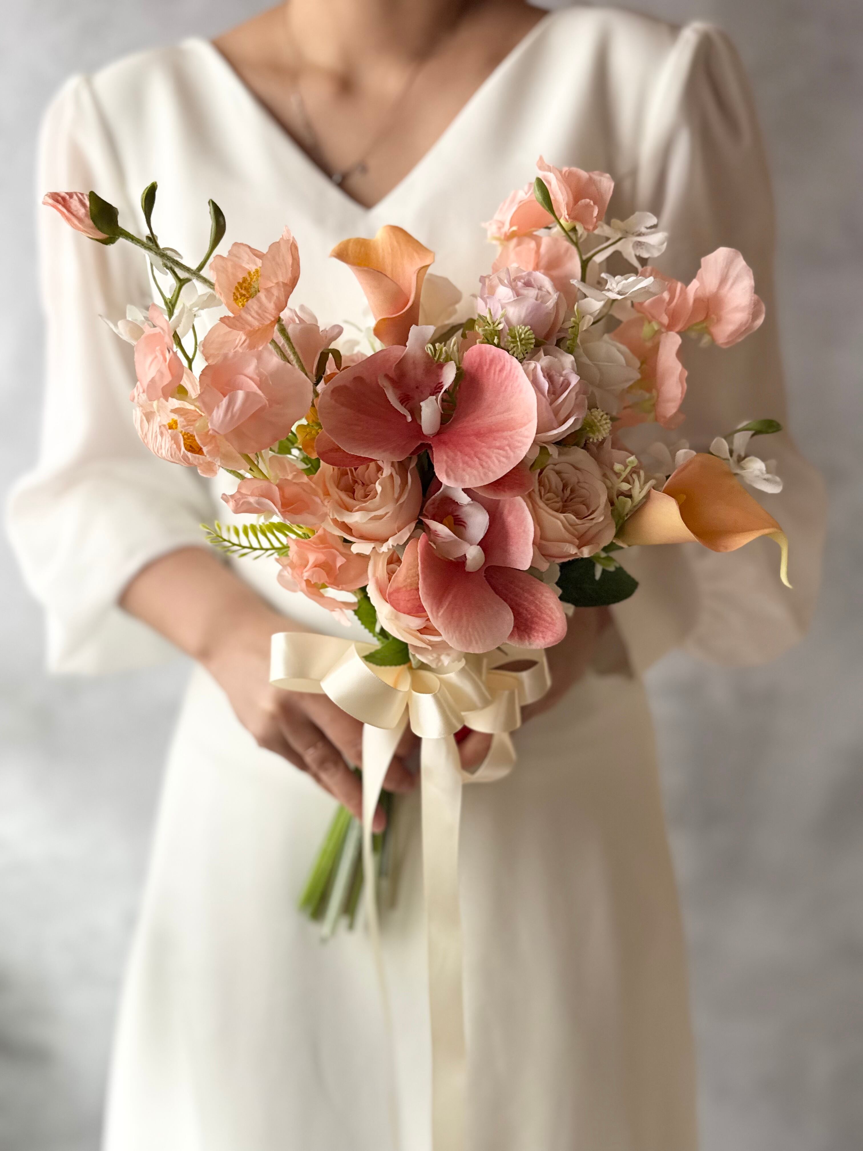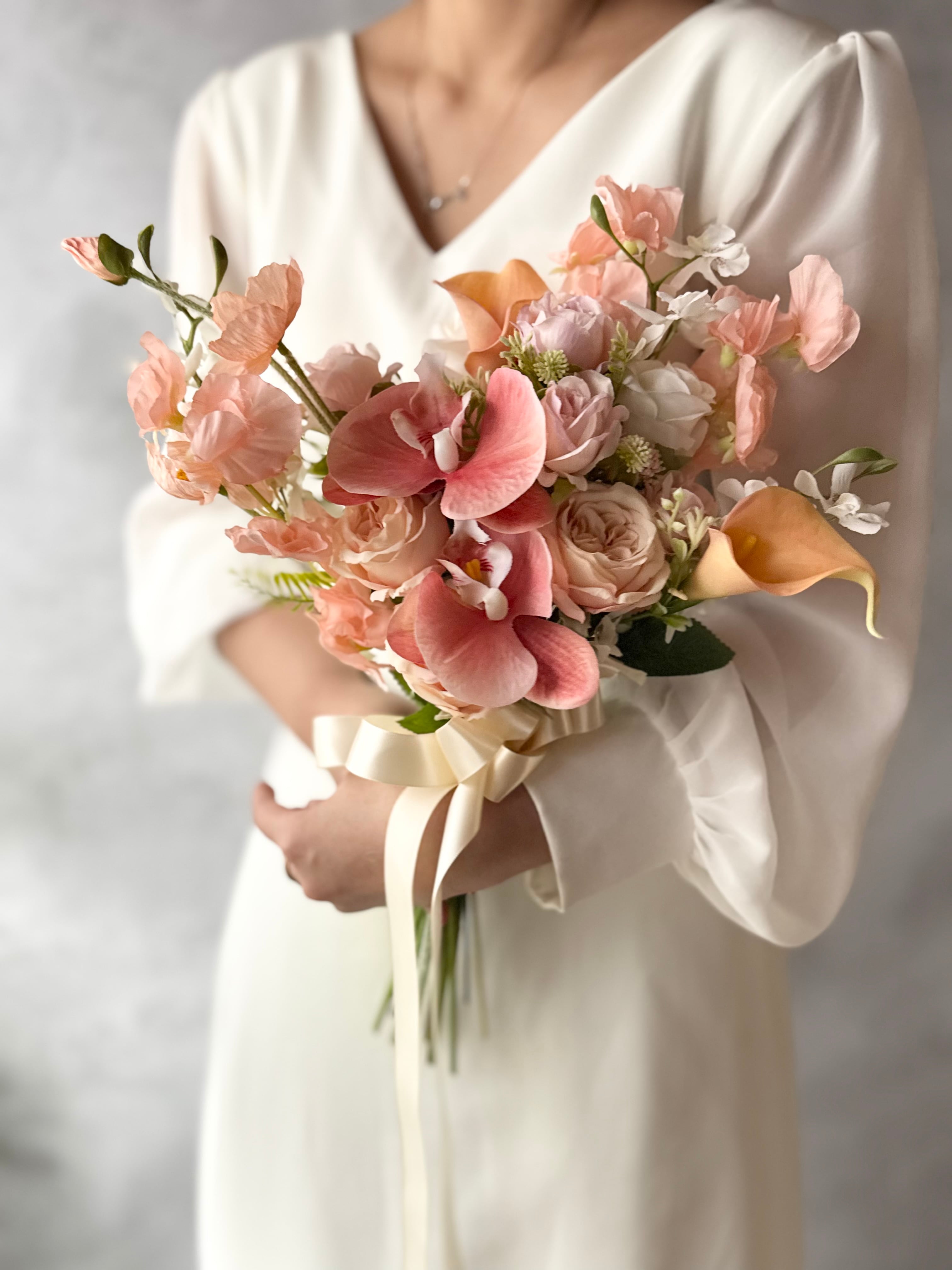 やわらかなピンク〜アプリコットカラーを基調に、胡蝶蘭やカラー、ローズを贅沢に束ねた上品なクラッチブーケ。