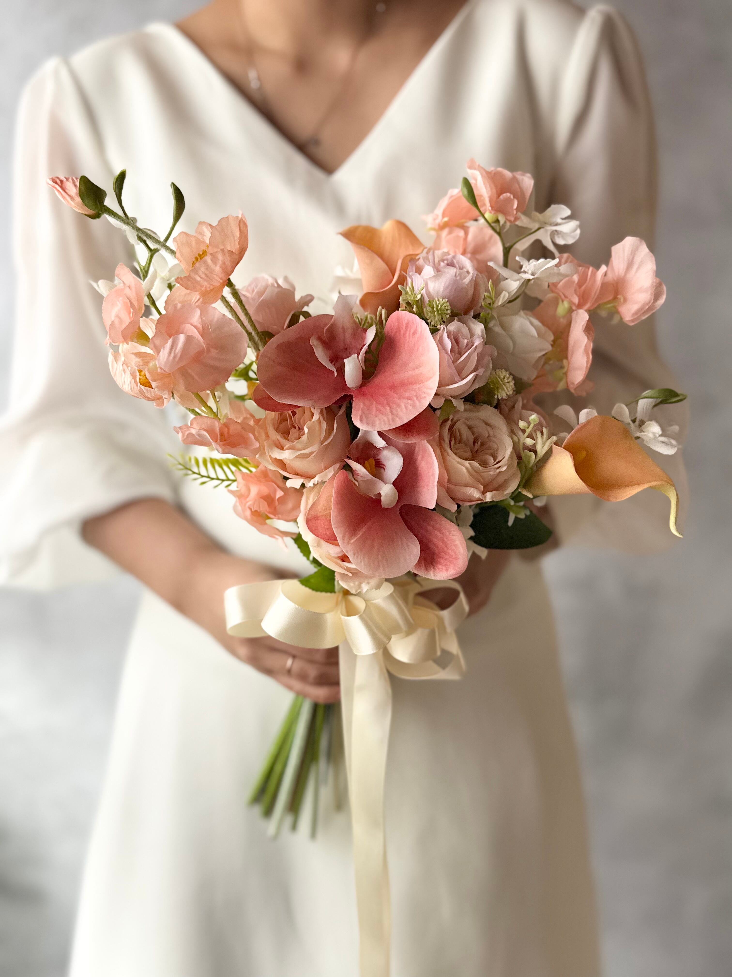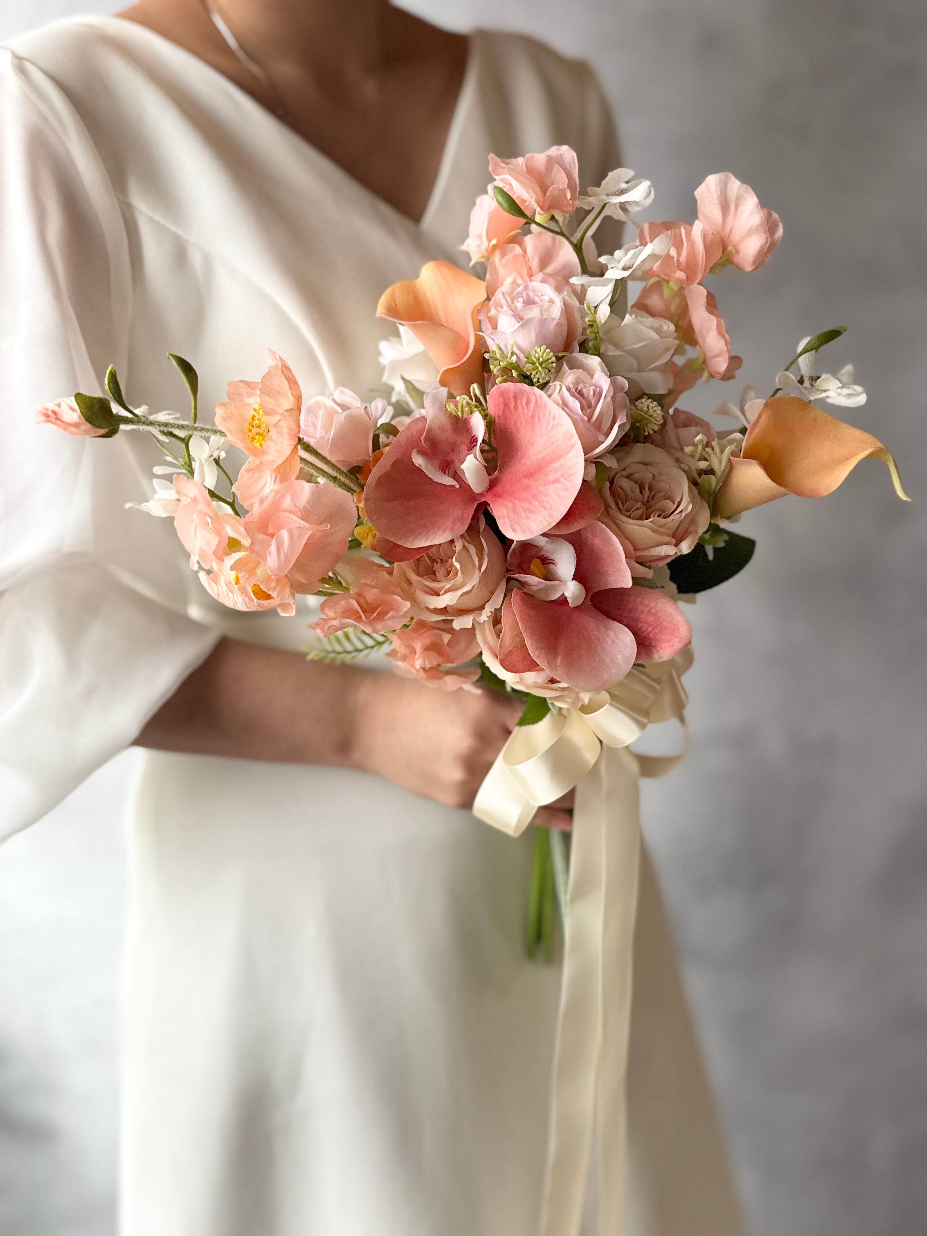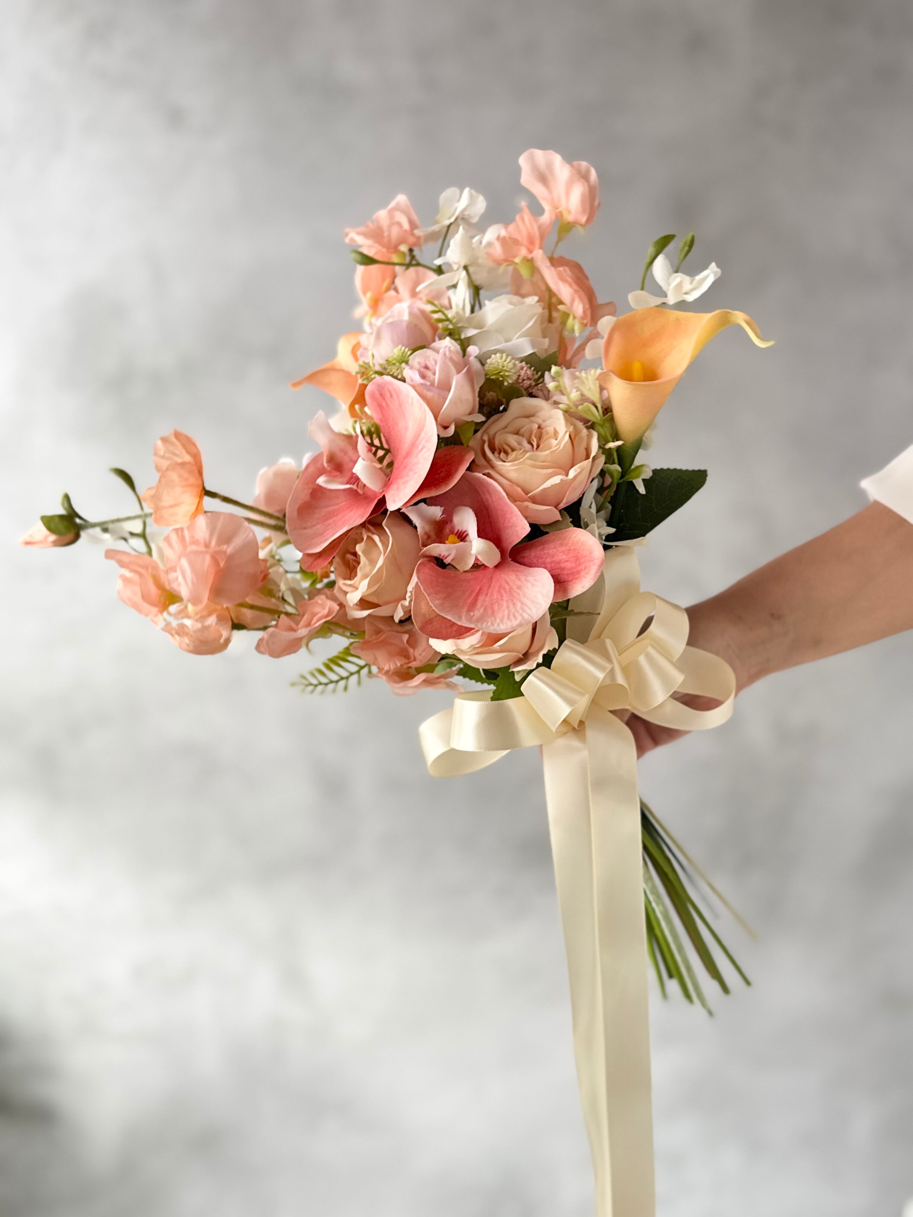 やわらかなピンク〜アプリコットカラーを基調に、胡蝶蘭やカラー、ローズを贅沢に束ねた上品なクラッチブーケ。