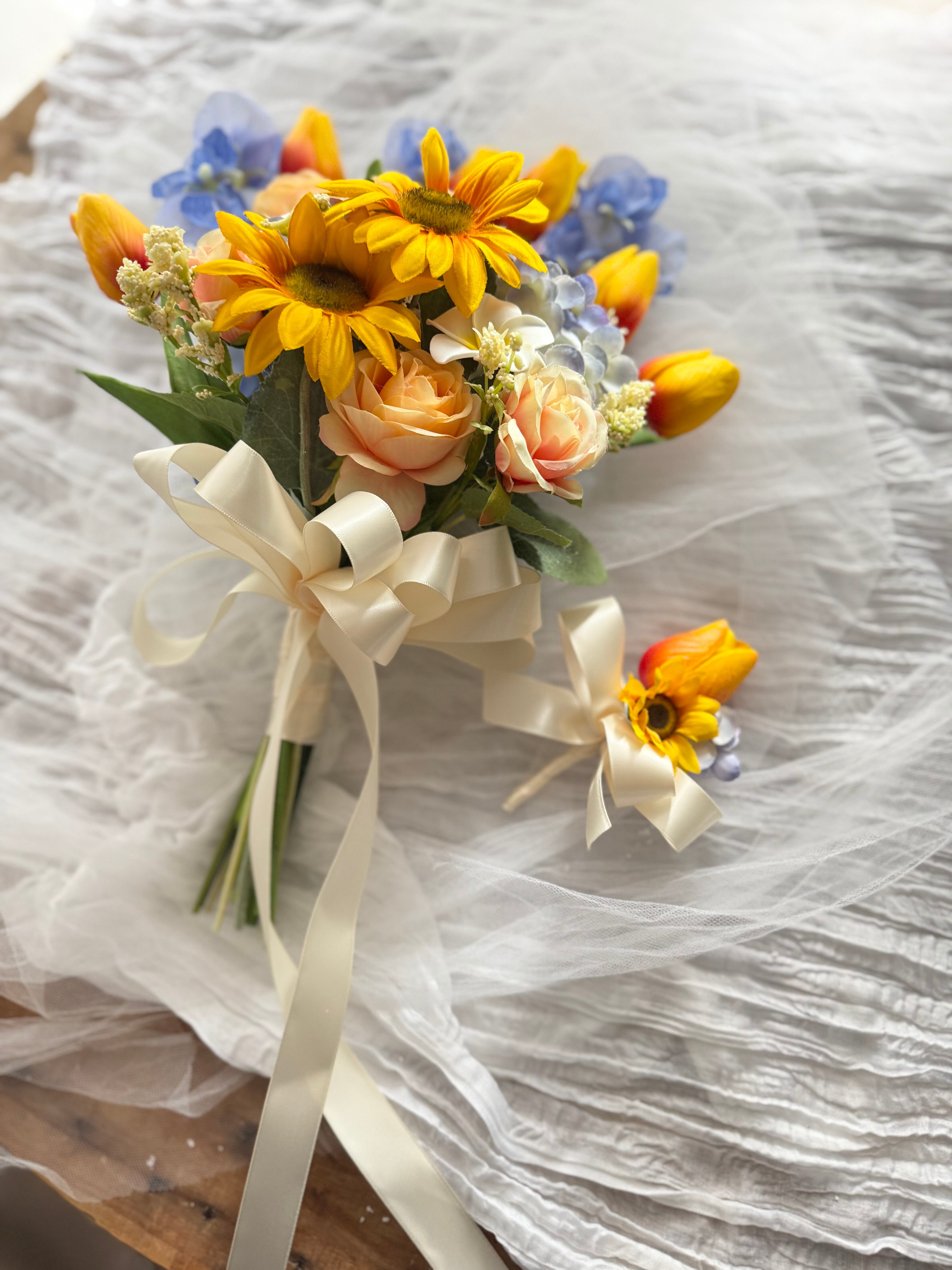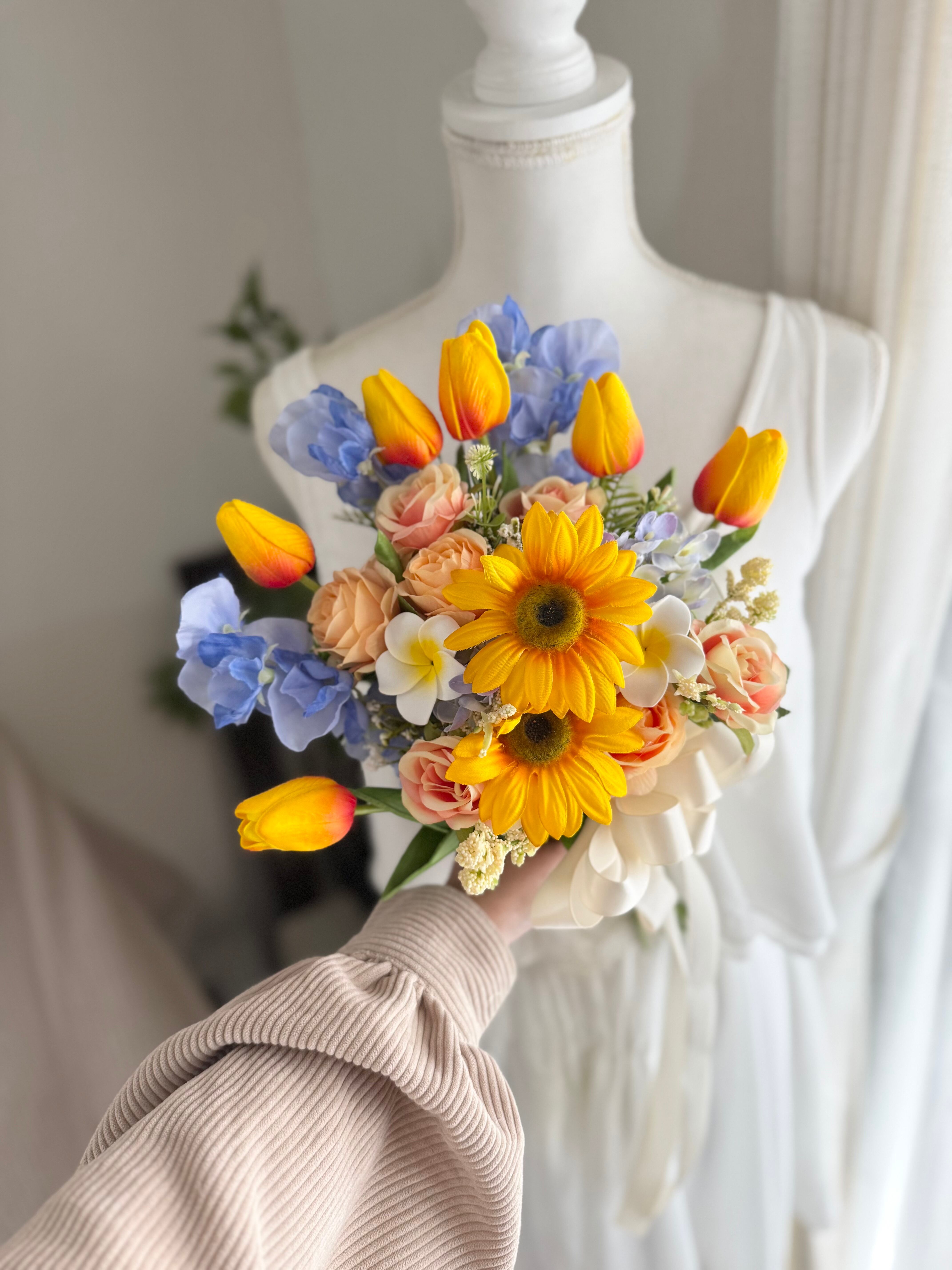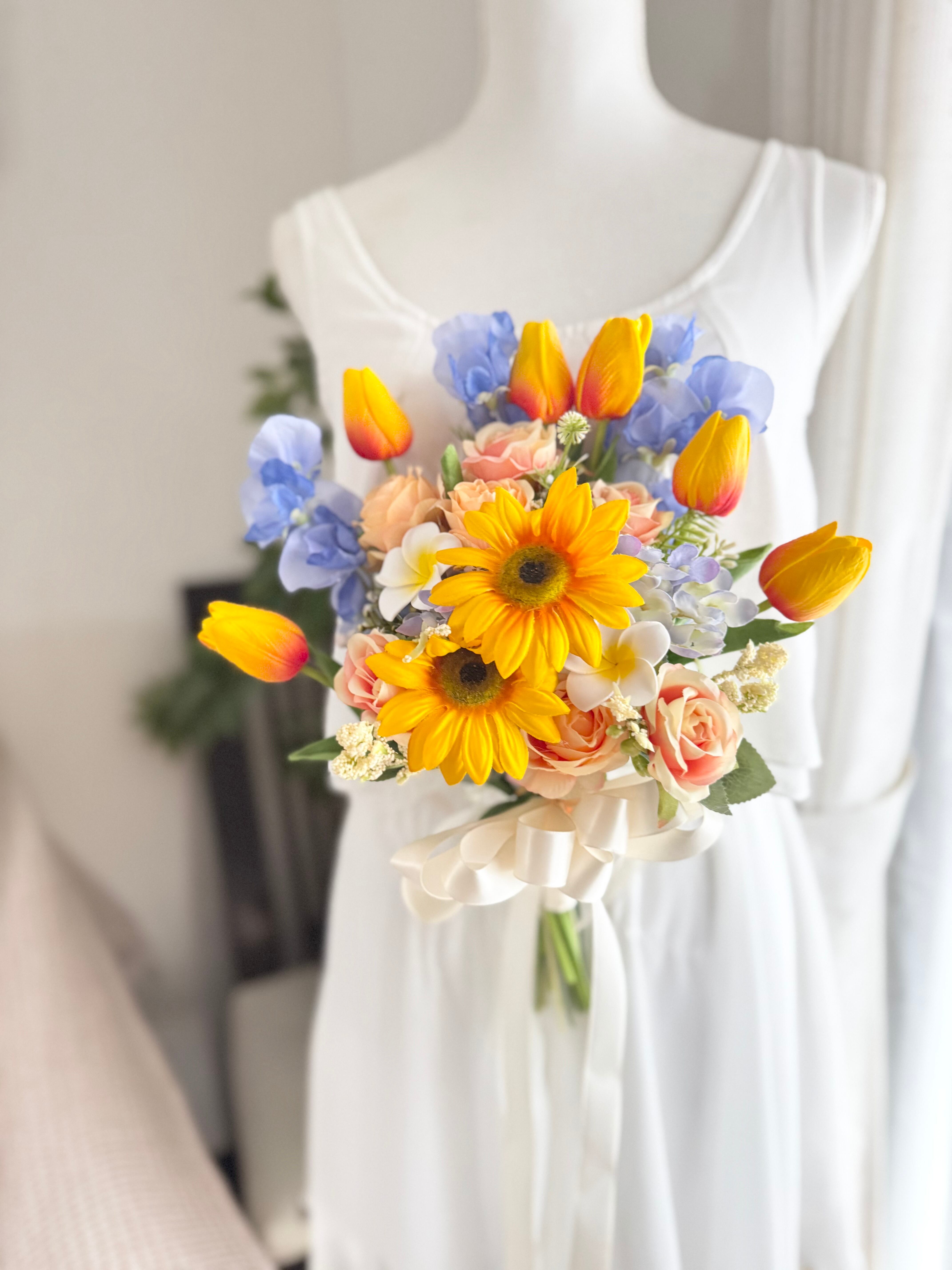 人気のひまわりとオレンジチューリップ、鮮やかなブルーとの色合いの花材で、