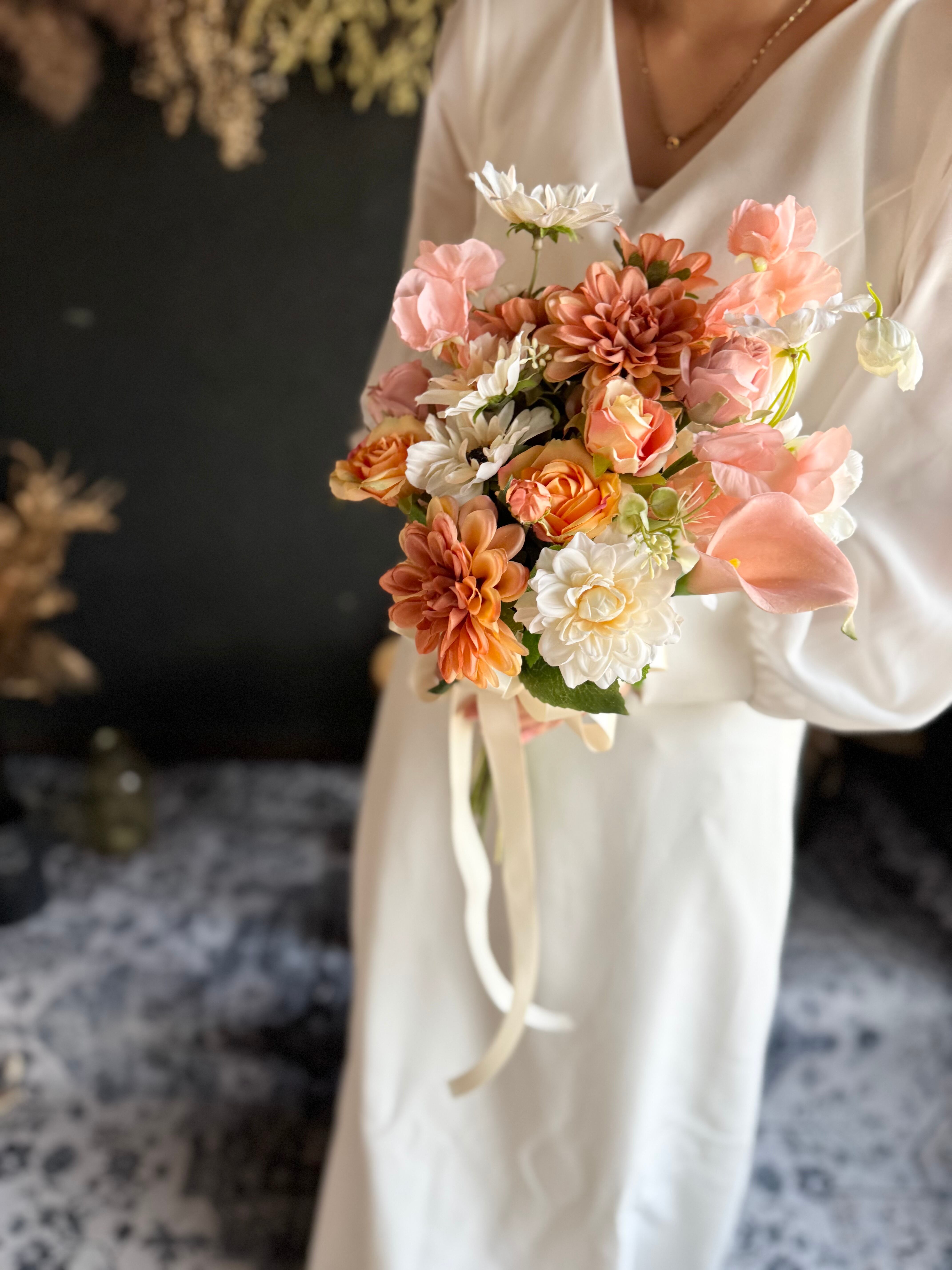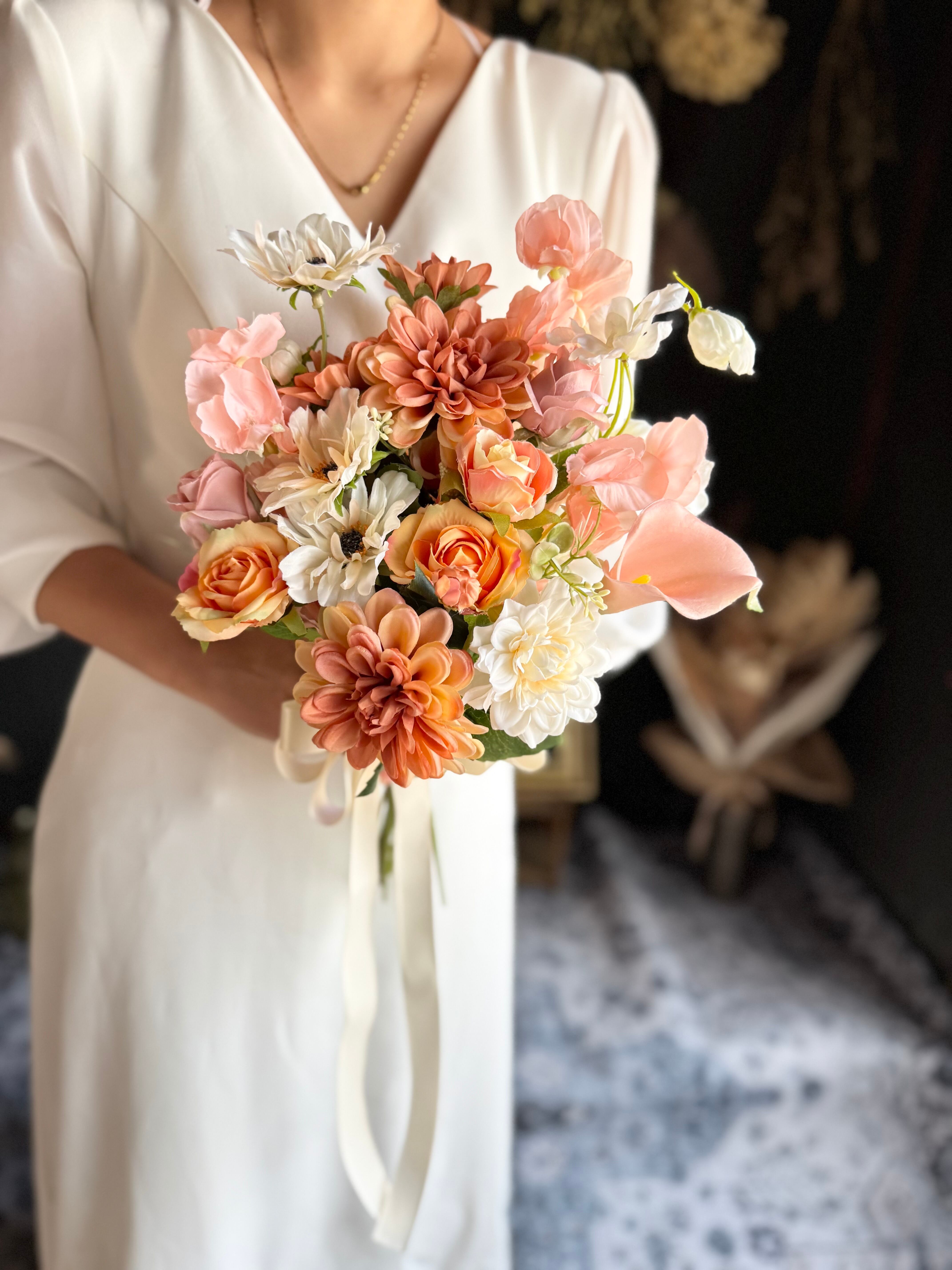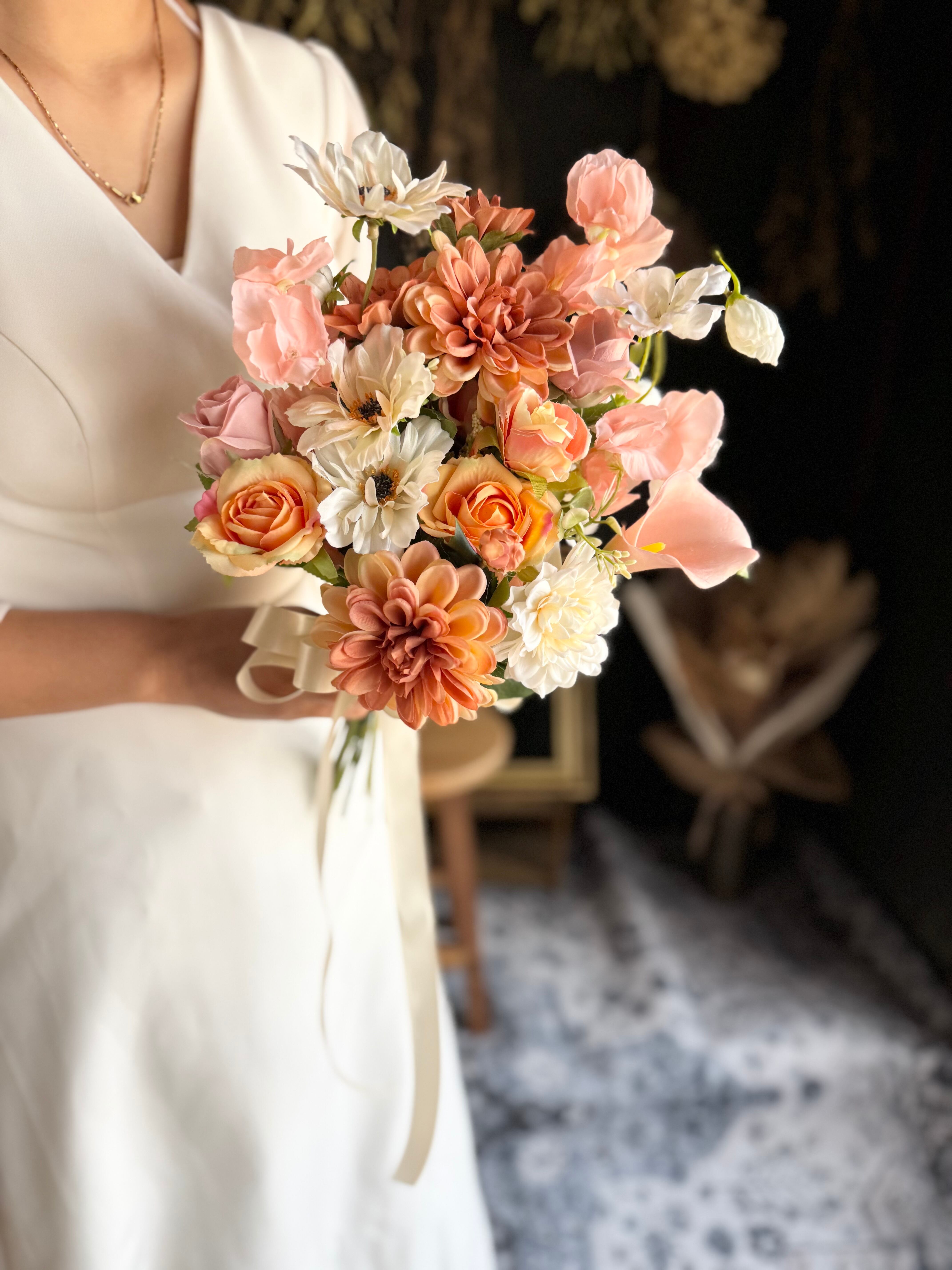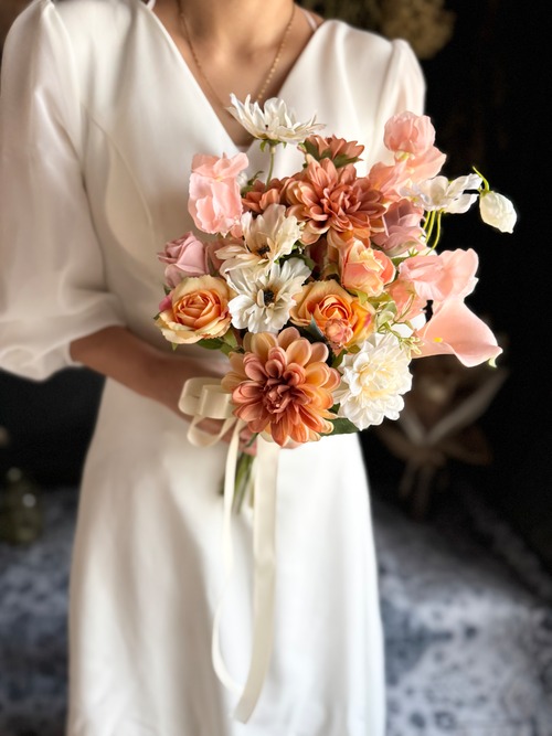 くすんだオレンジダリアをメインに、優しいサーモンピンク系の花々を合わせて、お作り致しました•*・ ブートニアもセットになっております•*・