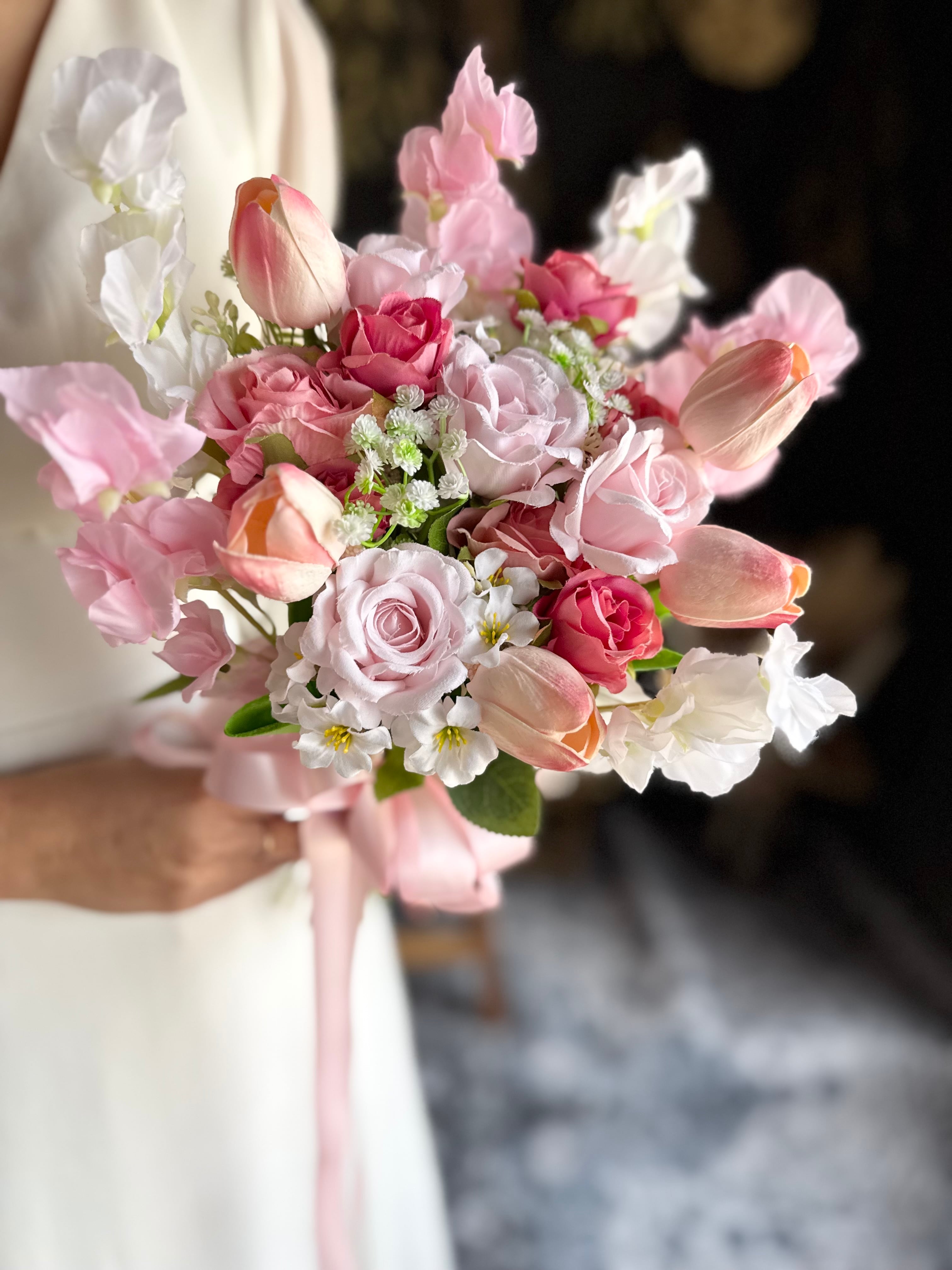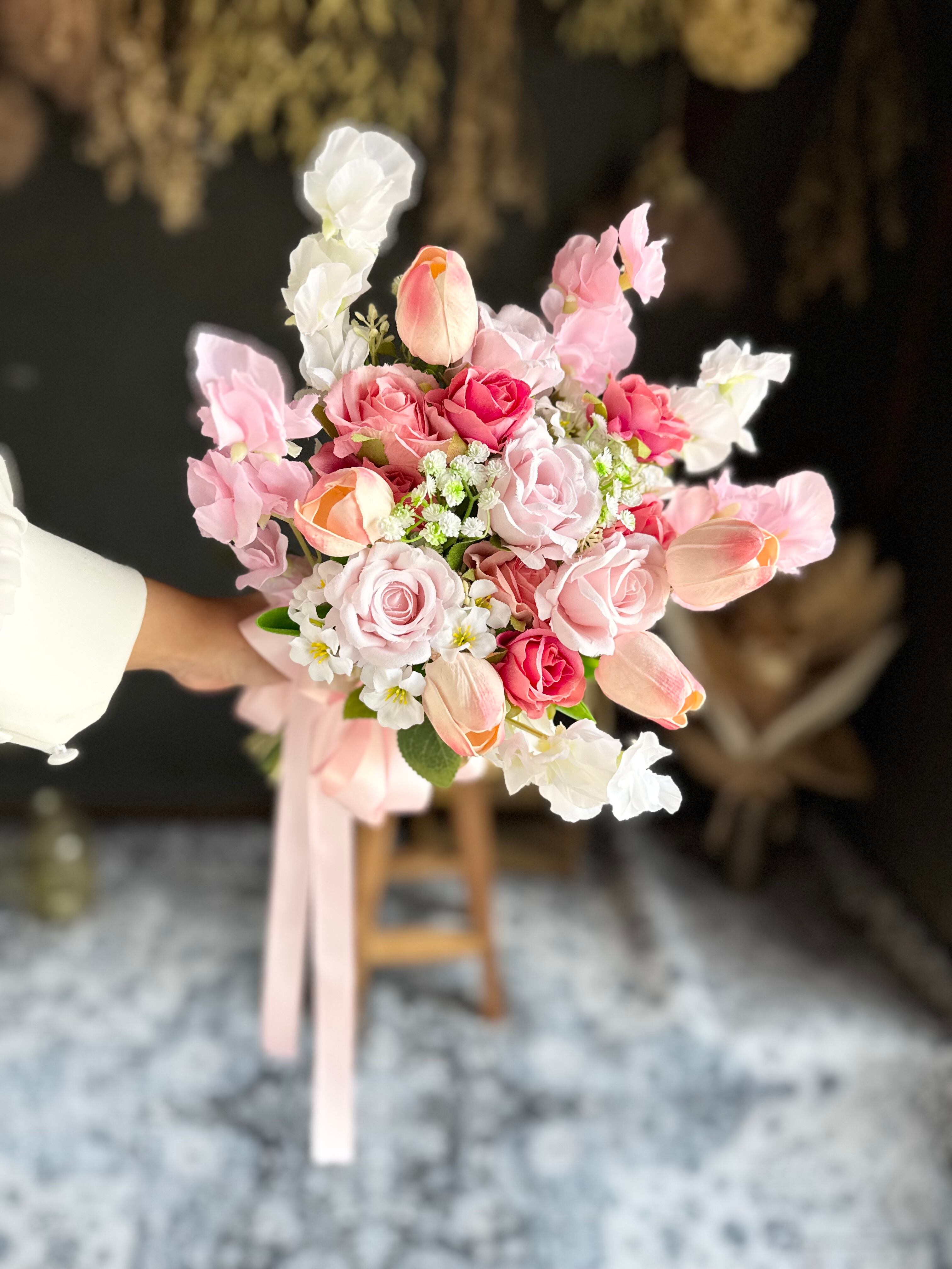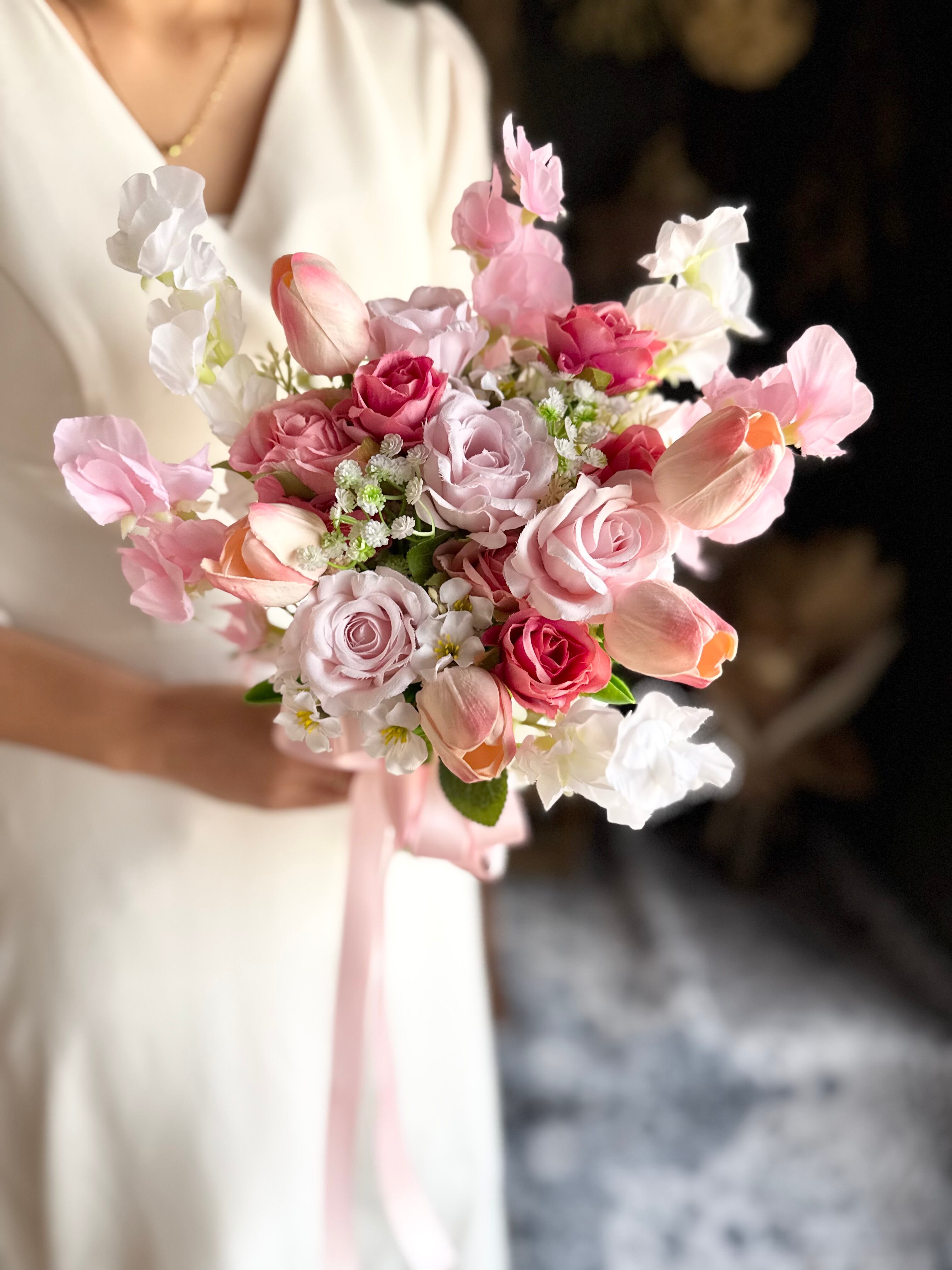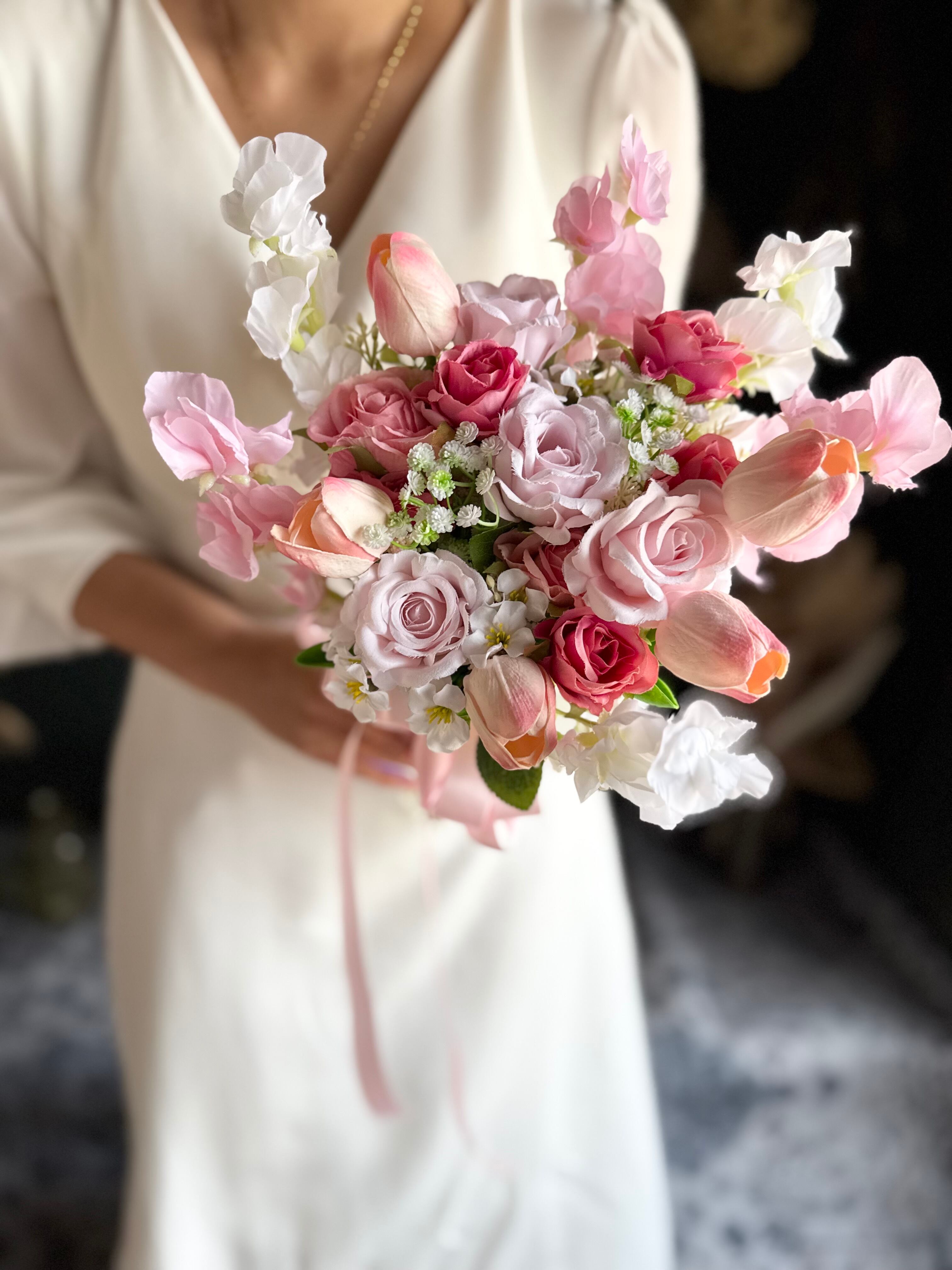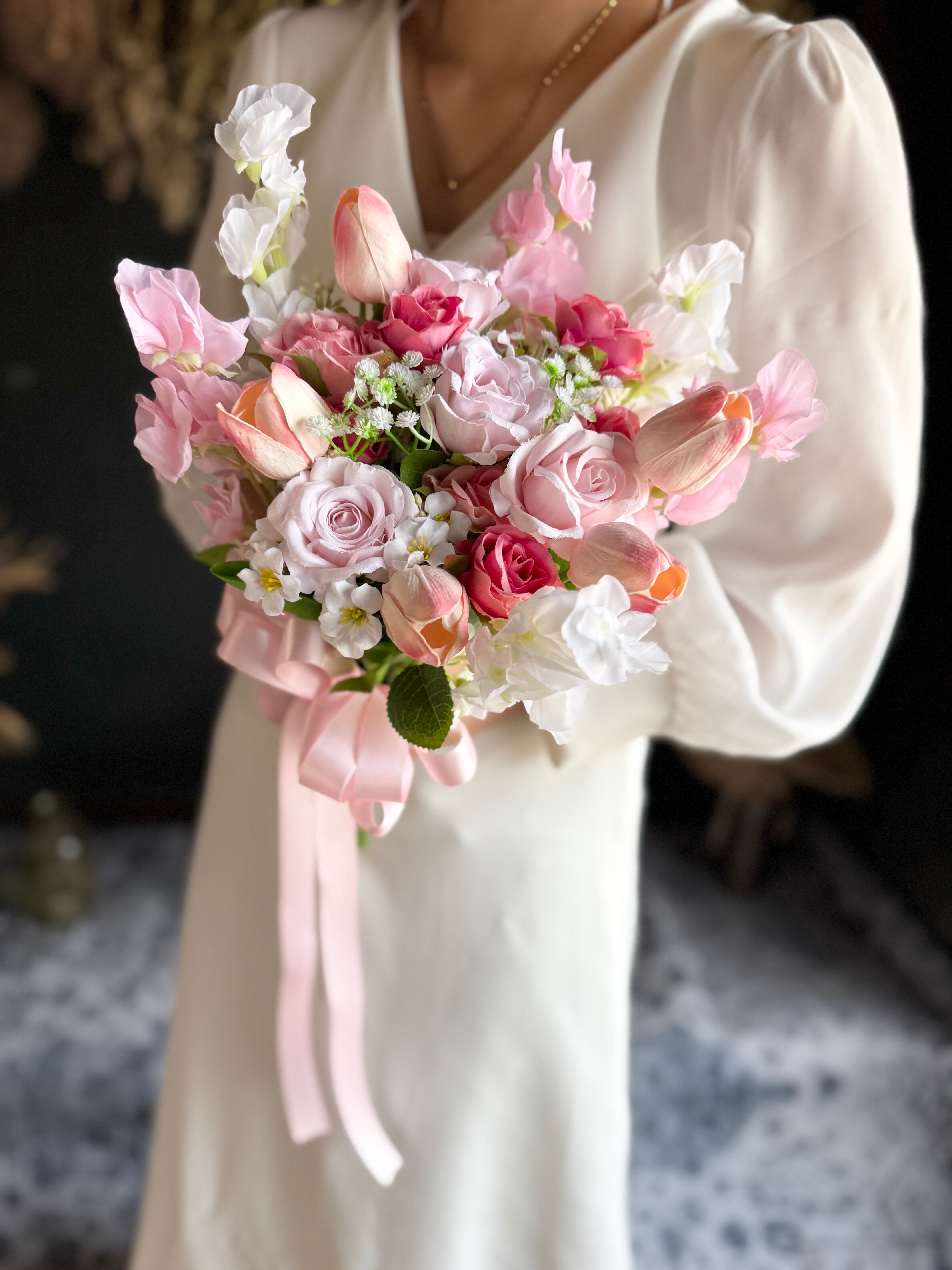 ピンクチューリップとスイートピーの絶妙な組み合わせが魅力的なブーケです•*・可愛らしい雰囲気を醸し出し、どんなスタイルのウェディングにもぴったりです•*・