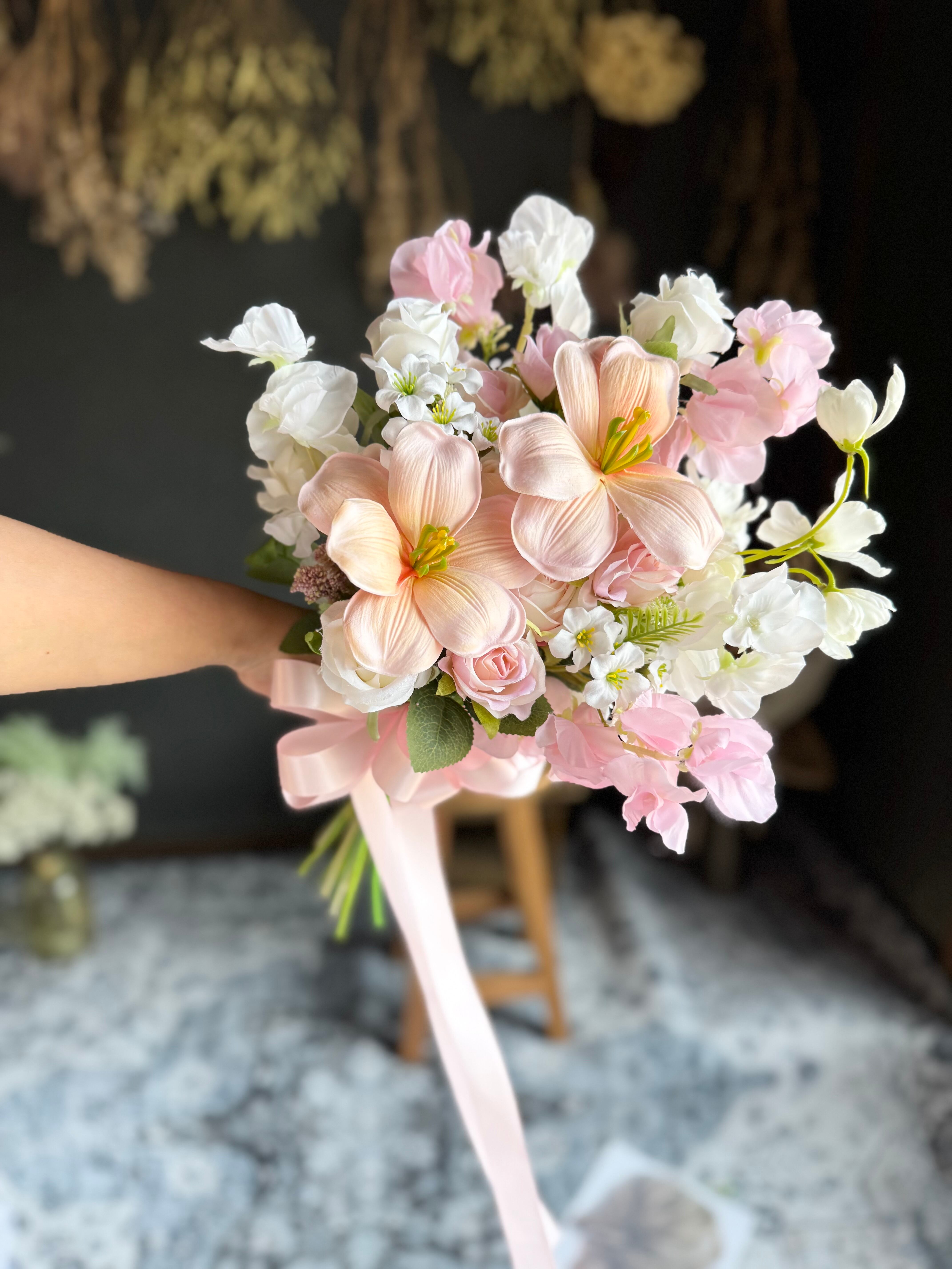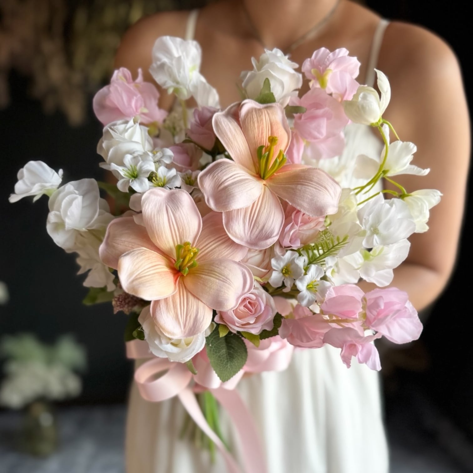 ピンクチューリップとホワイトクラッチの絶妙な組み合わせが魅力的なブーケです•*・エレガントな雰囲気を醸し出し、どんなスタイルのウェディングにもぴったりです•*・