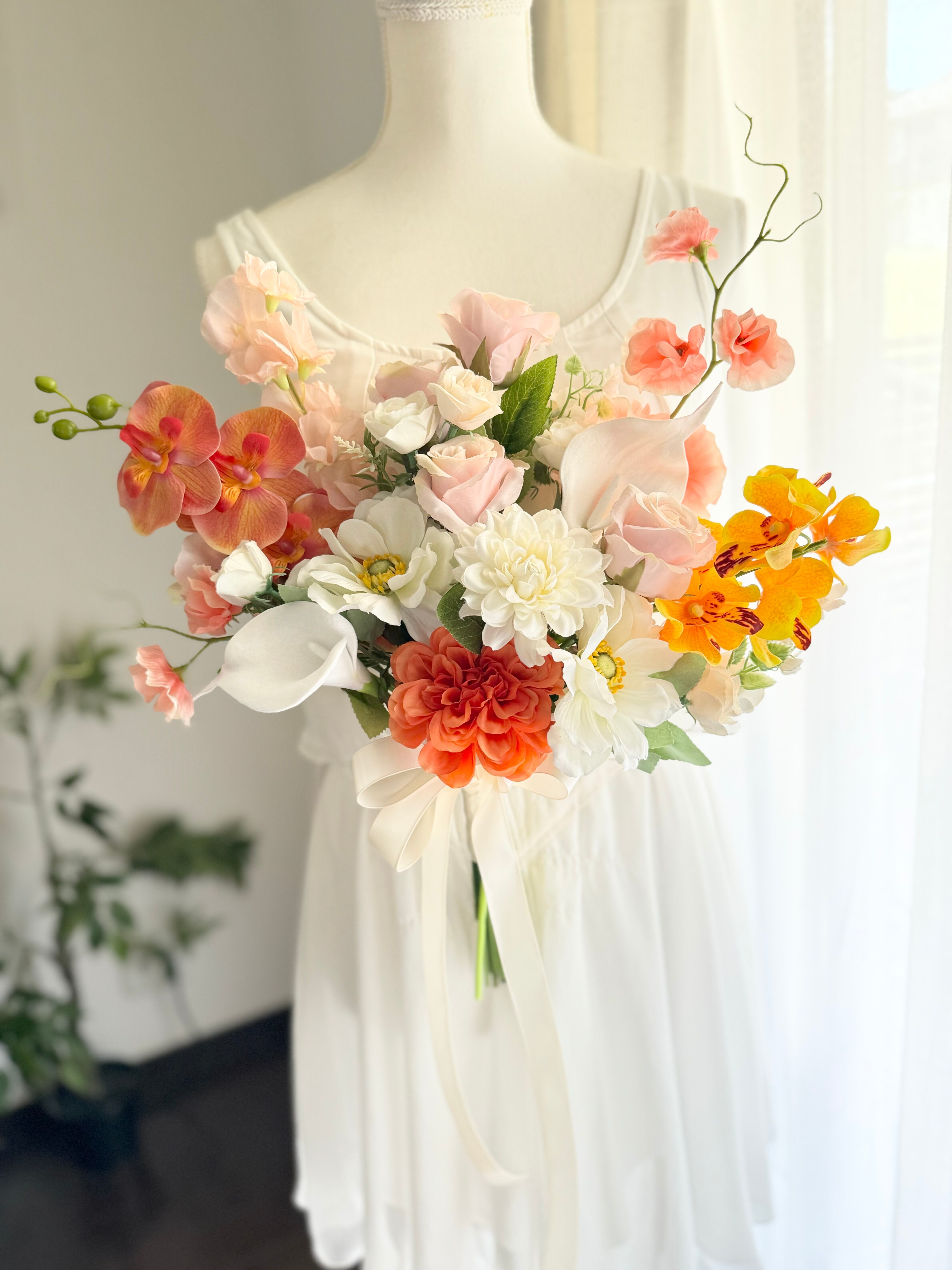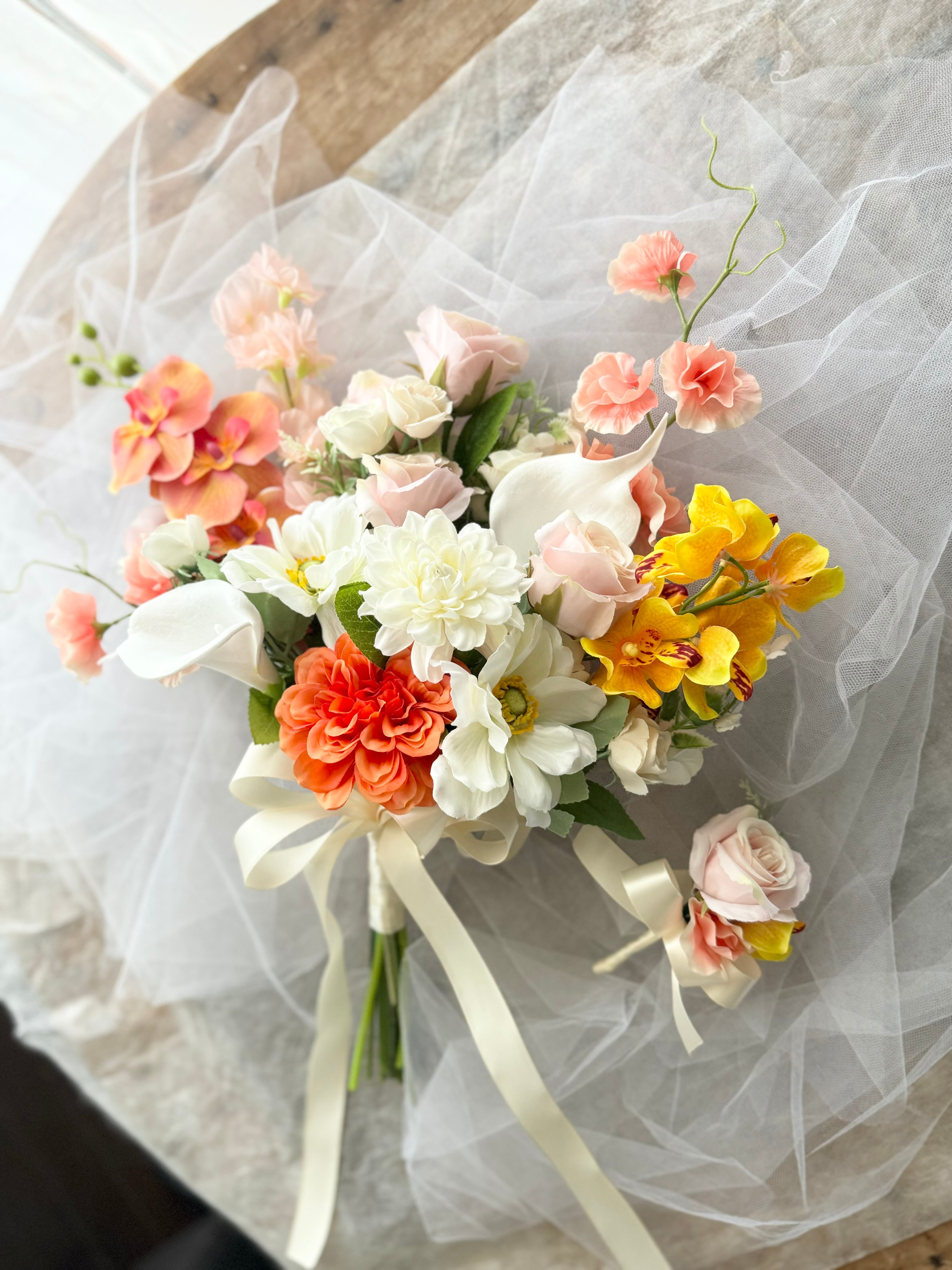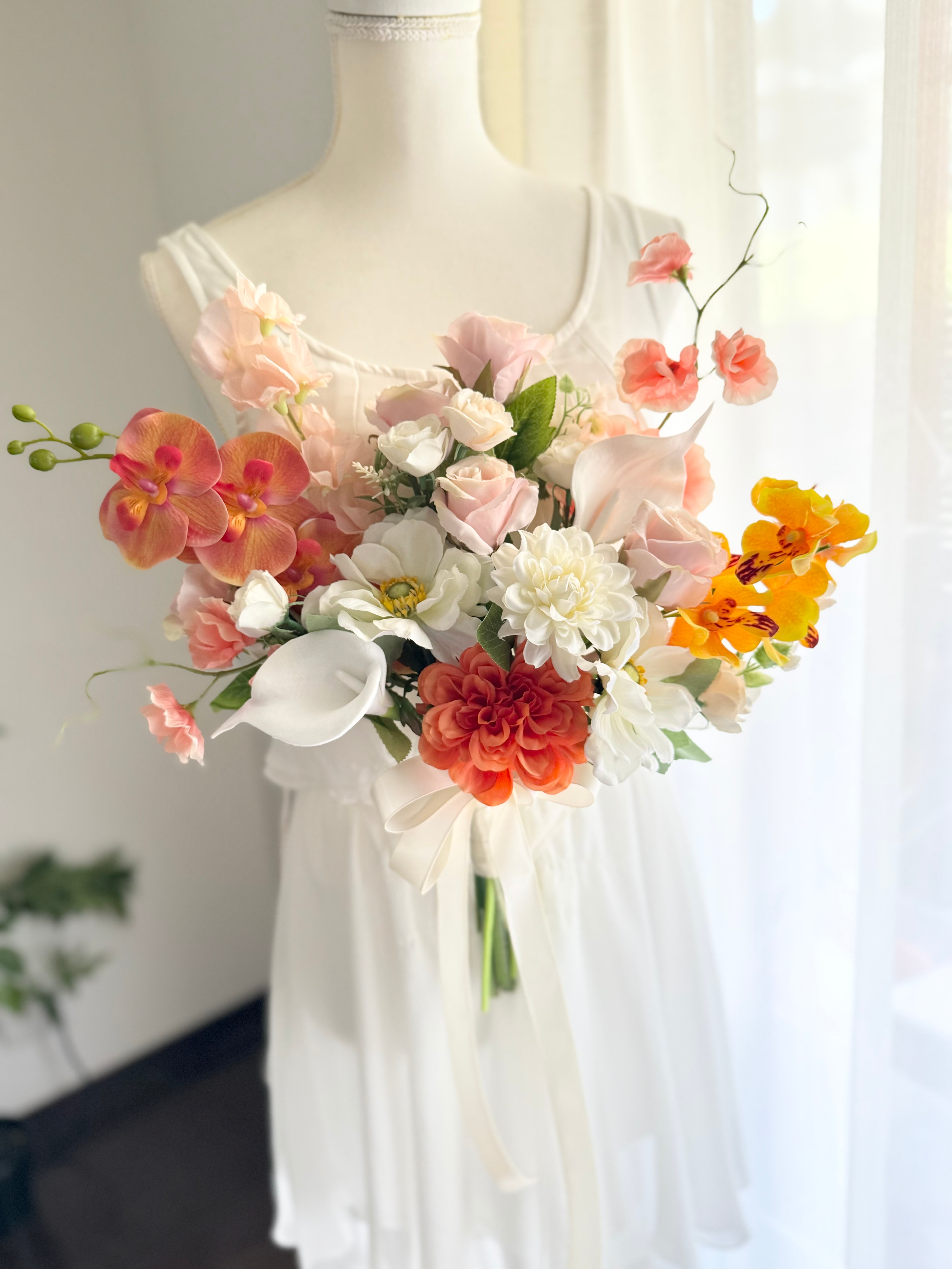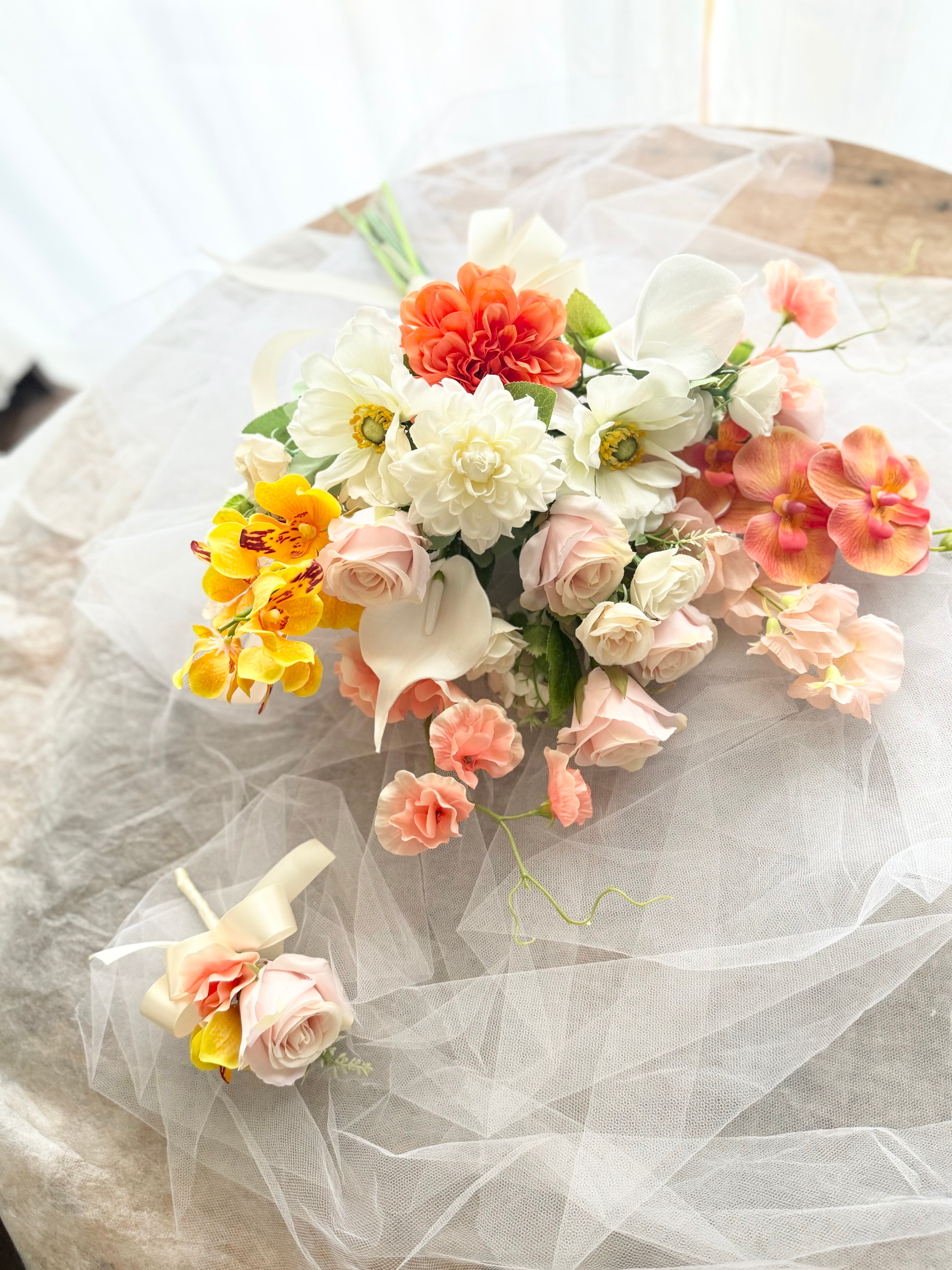 オレンジ、白といった可愛いお花たちを上品に束ねた特別なウェディングブーケ•*・
