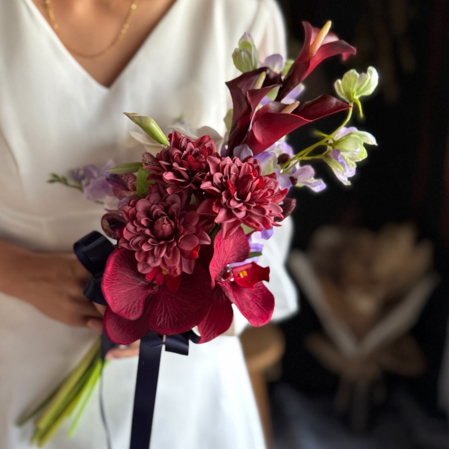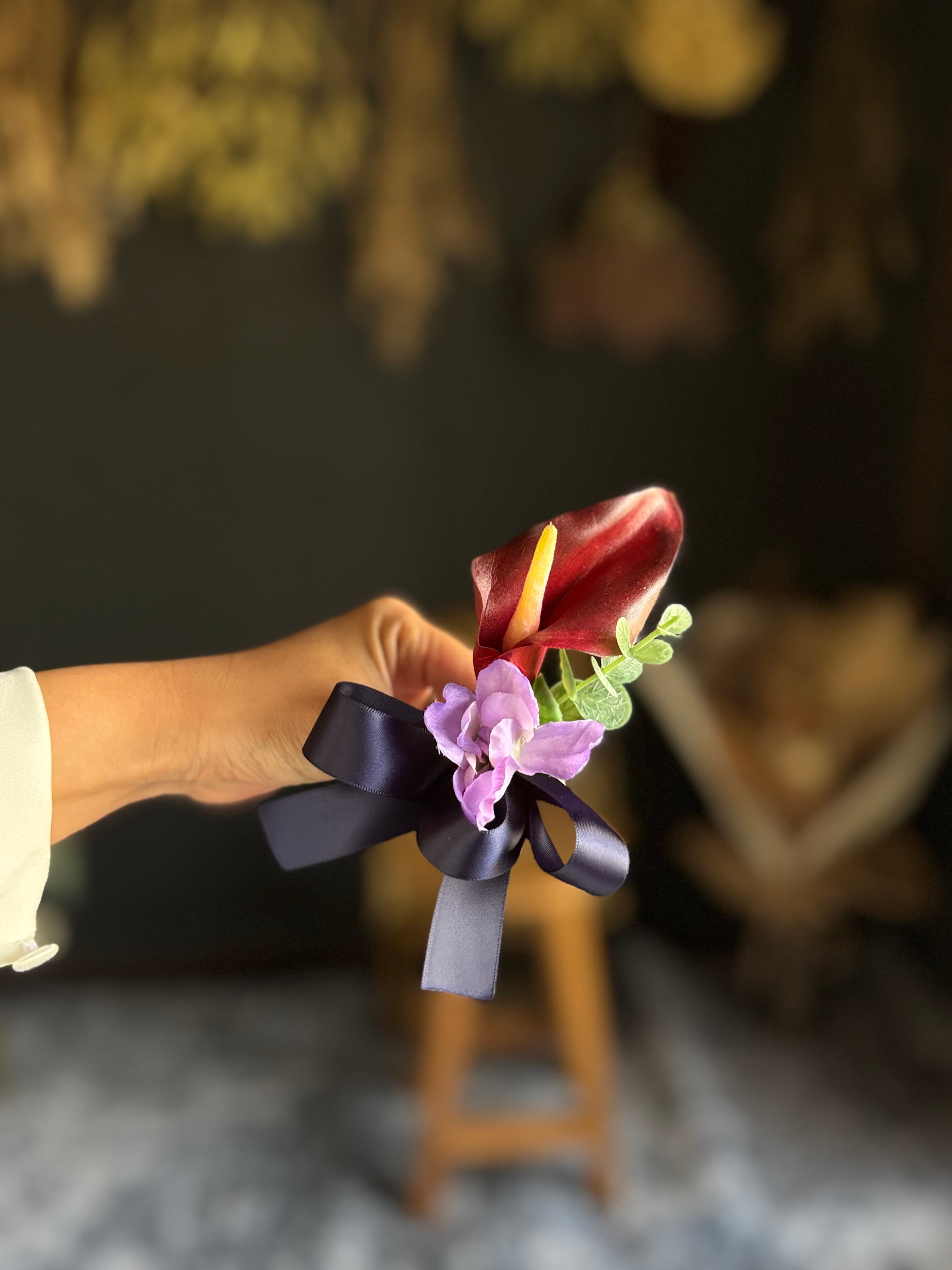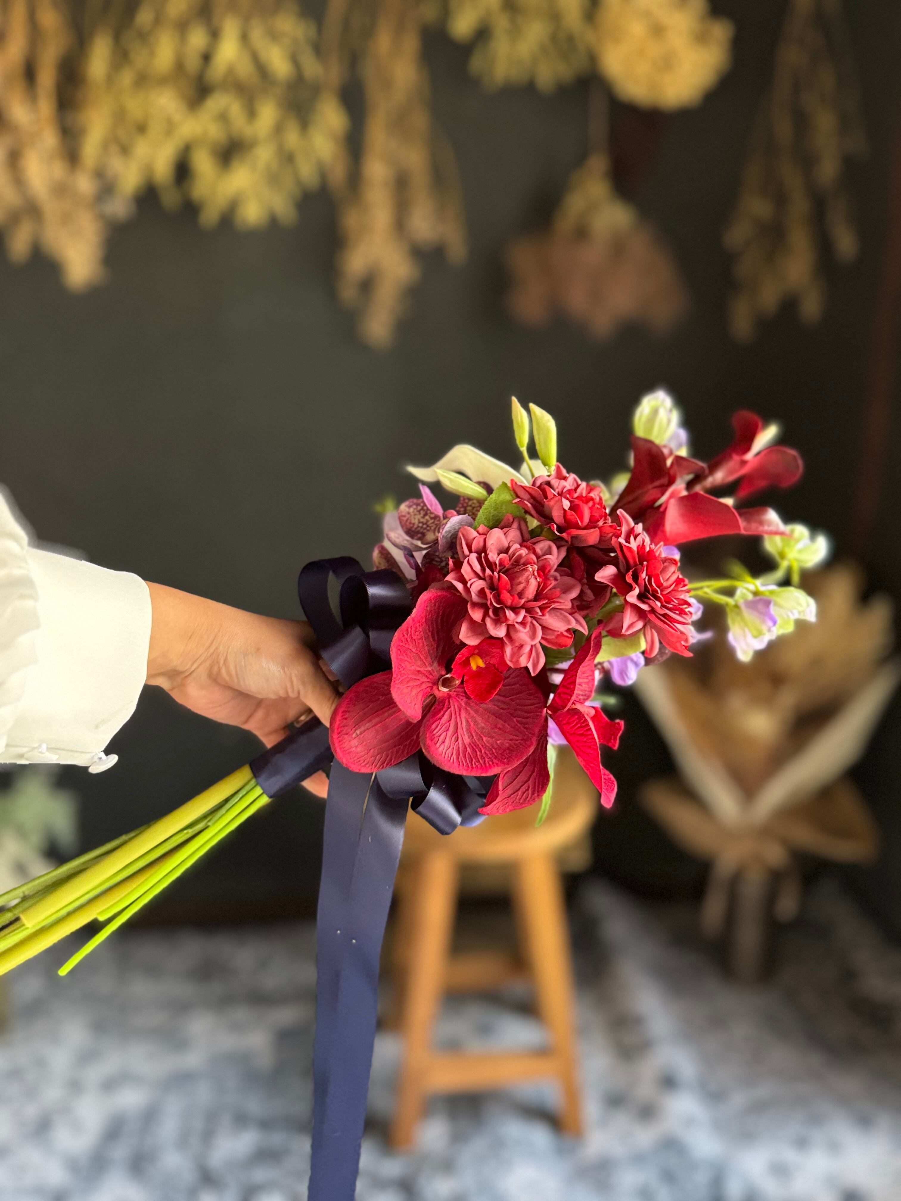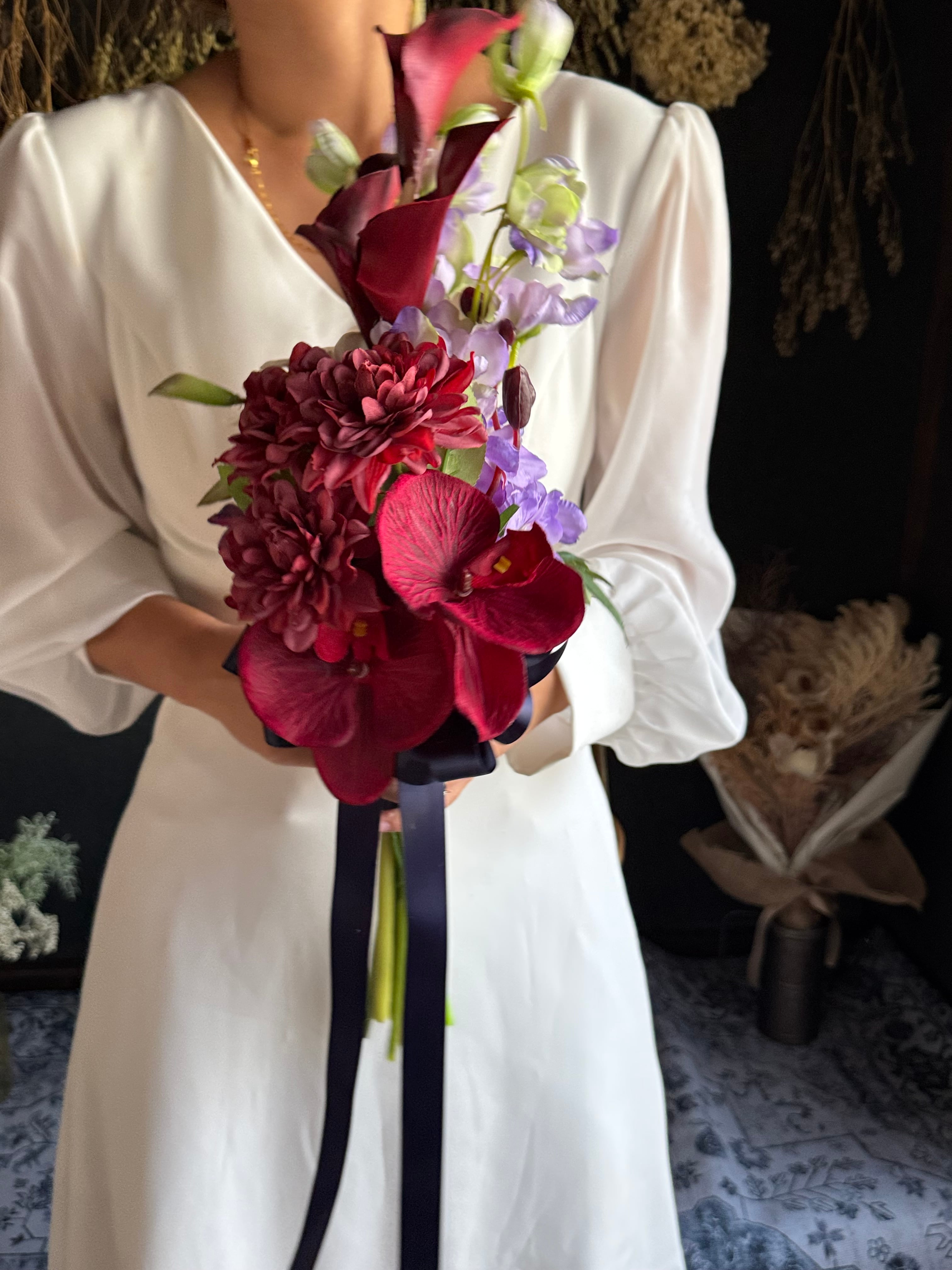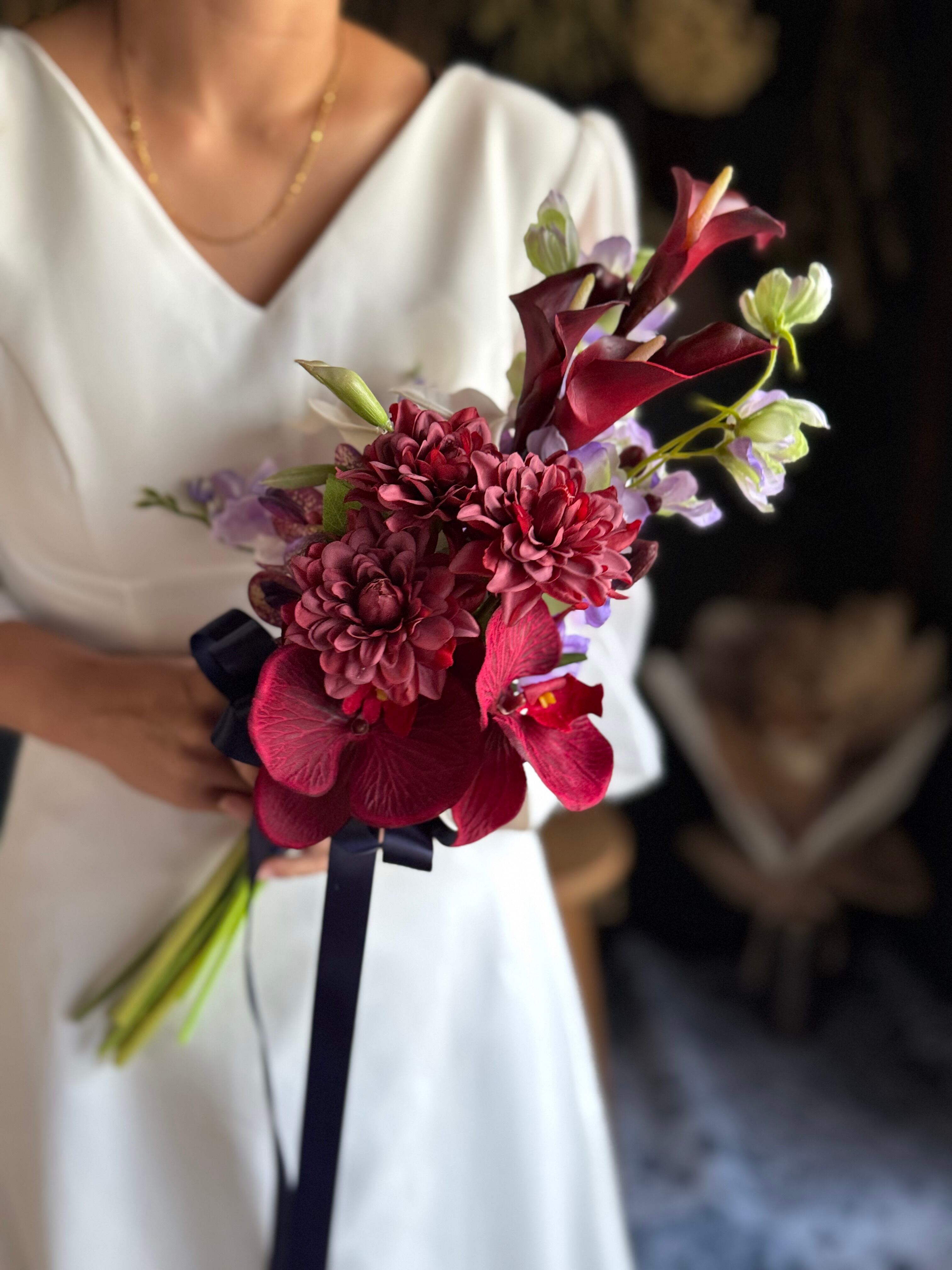 大人カッコいいワインレッドのカラーを使用したアームブーケ•*・縦に長くスタイリッシュなアームブーケは上品かつおしゃれな印象に•*・リボン色の変更も可能です•*・