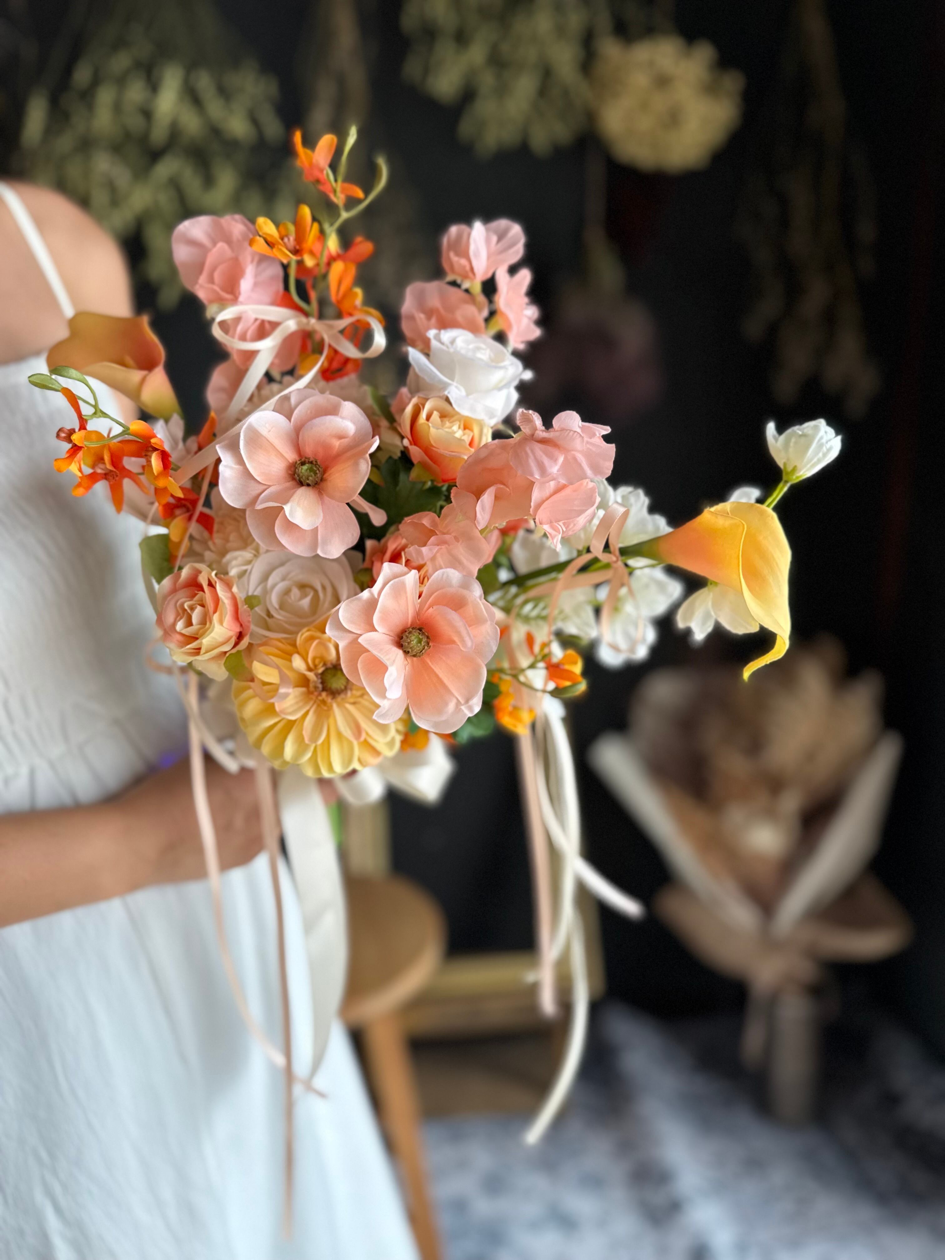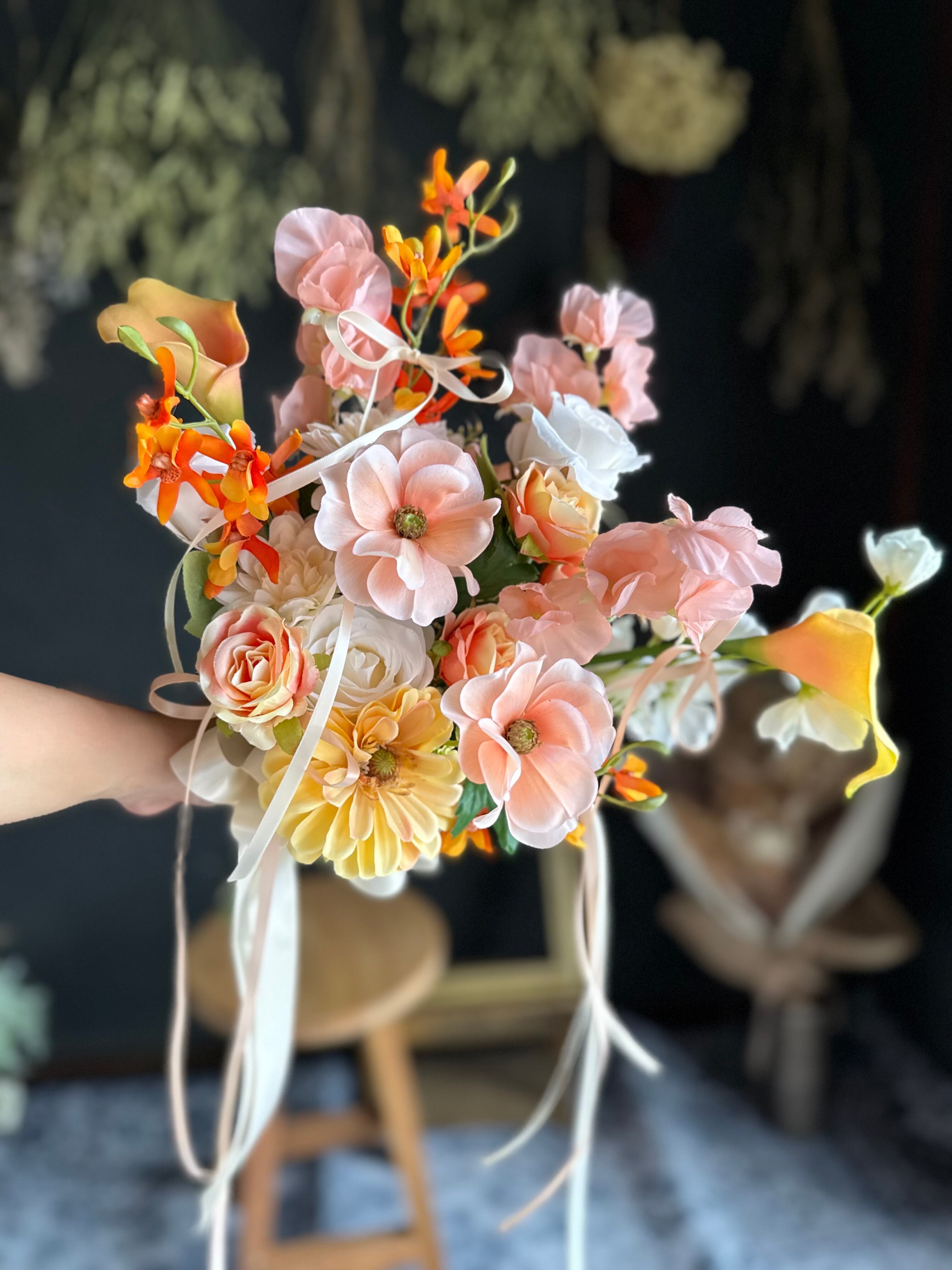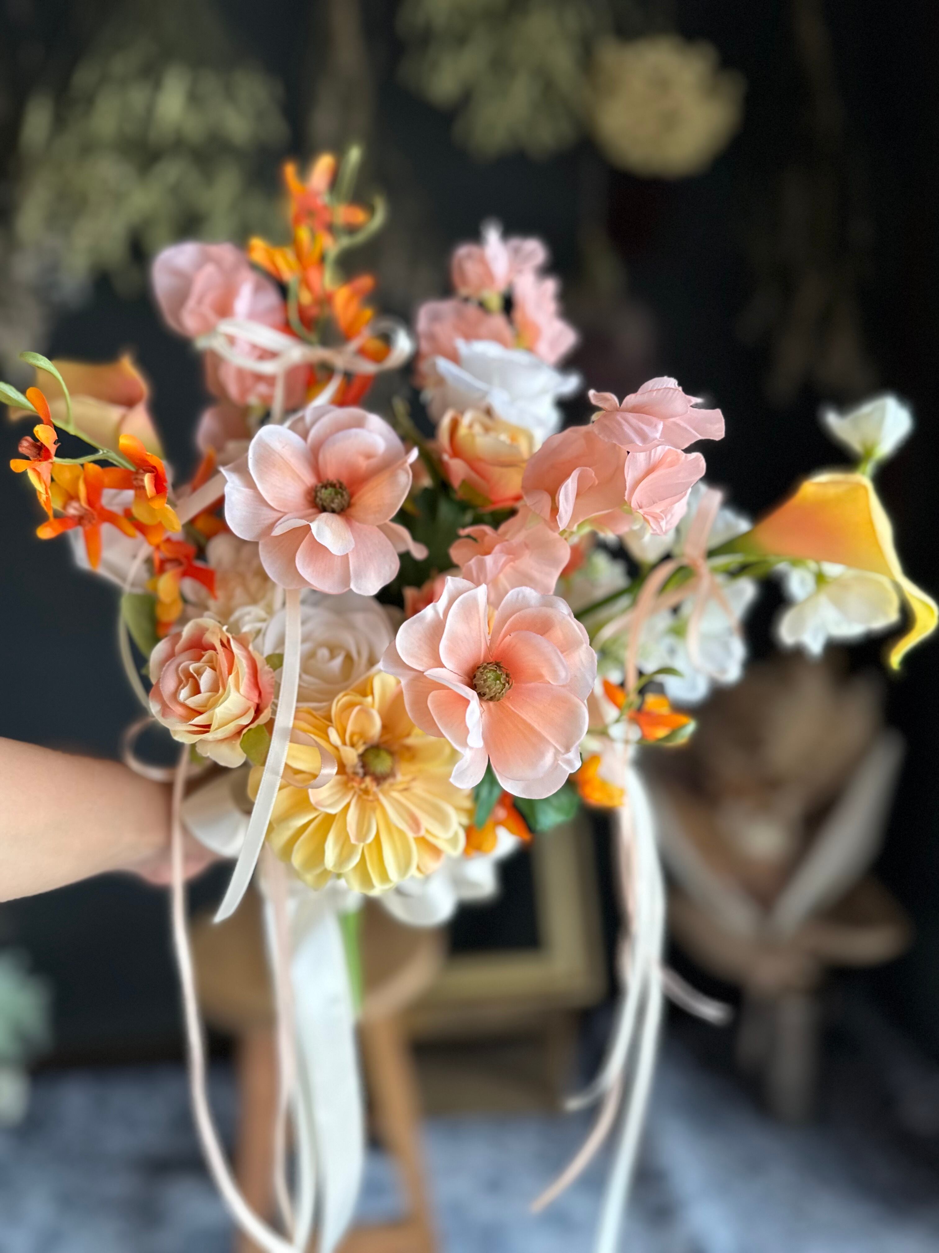 カラーやスイートピー、バラやジニアなど、多彩な花々が優しく寄り添い、ふんわりとした幸福感を演出してくれます•*・