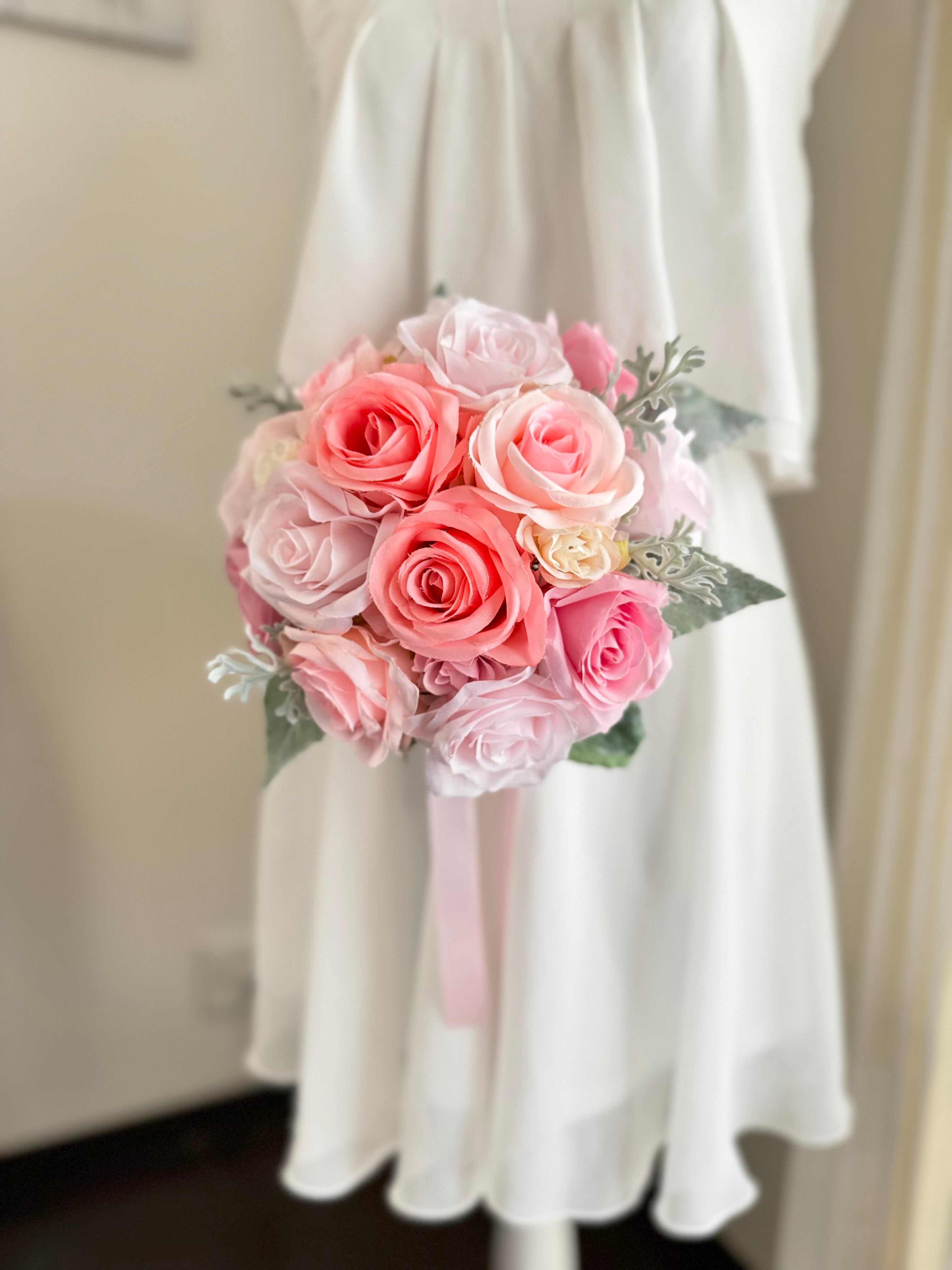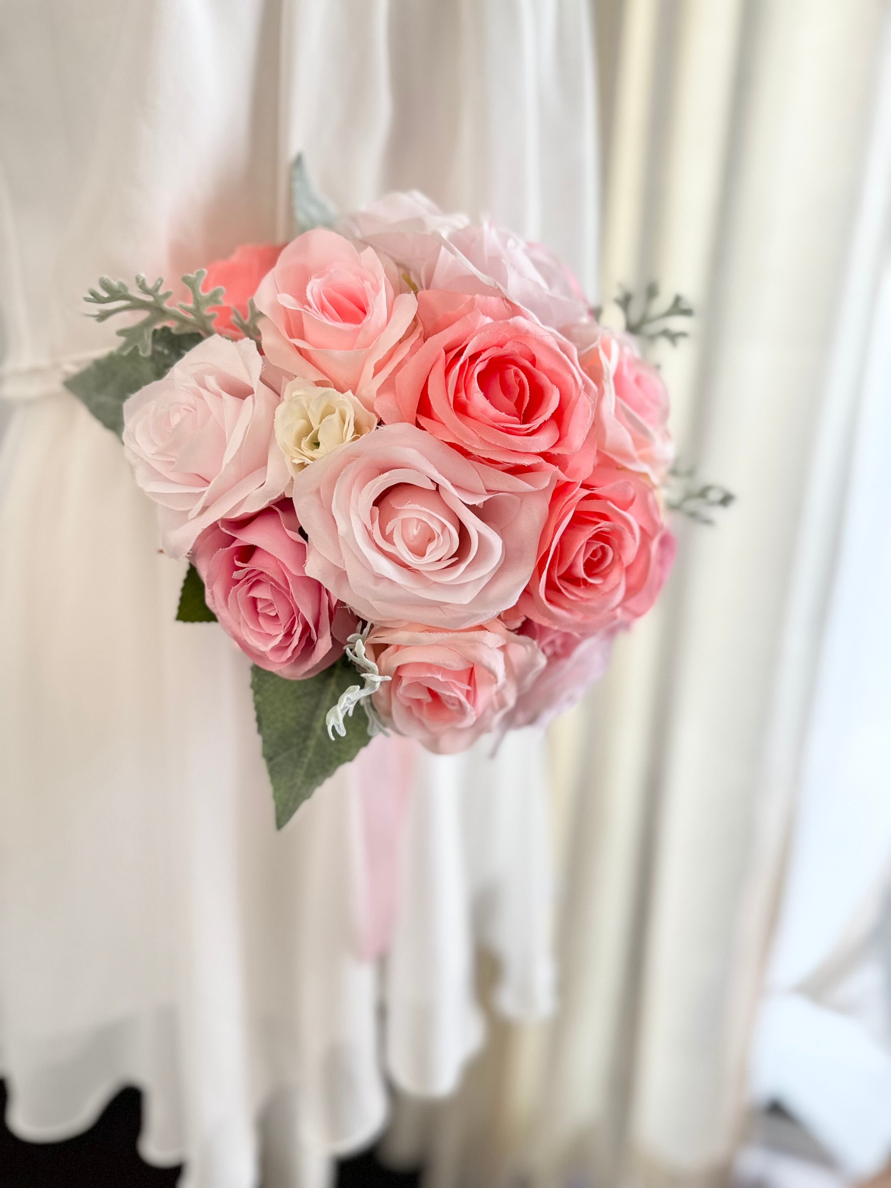 可愛いらしく、なおかつ上品なデザインが特徴のラウンドブーケ、白っぽい葉っぱが高級感を演出し、儚さや優しさを表現したラウンドブーケです•*・