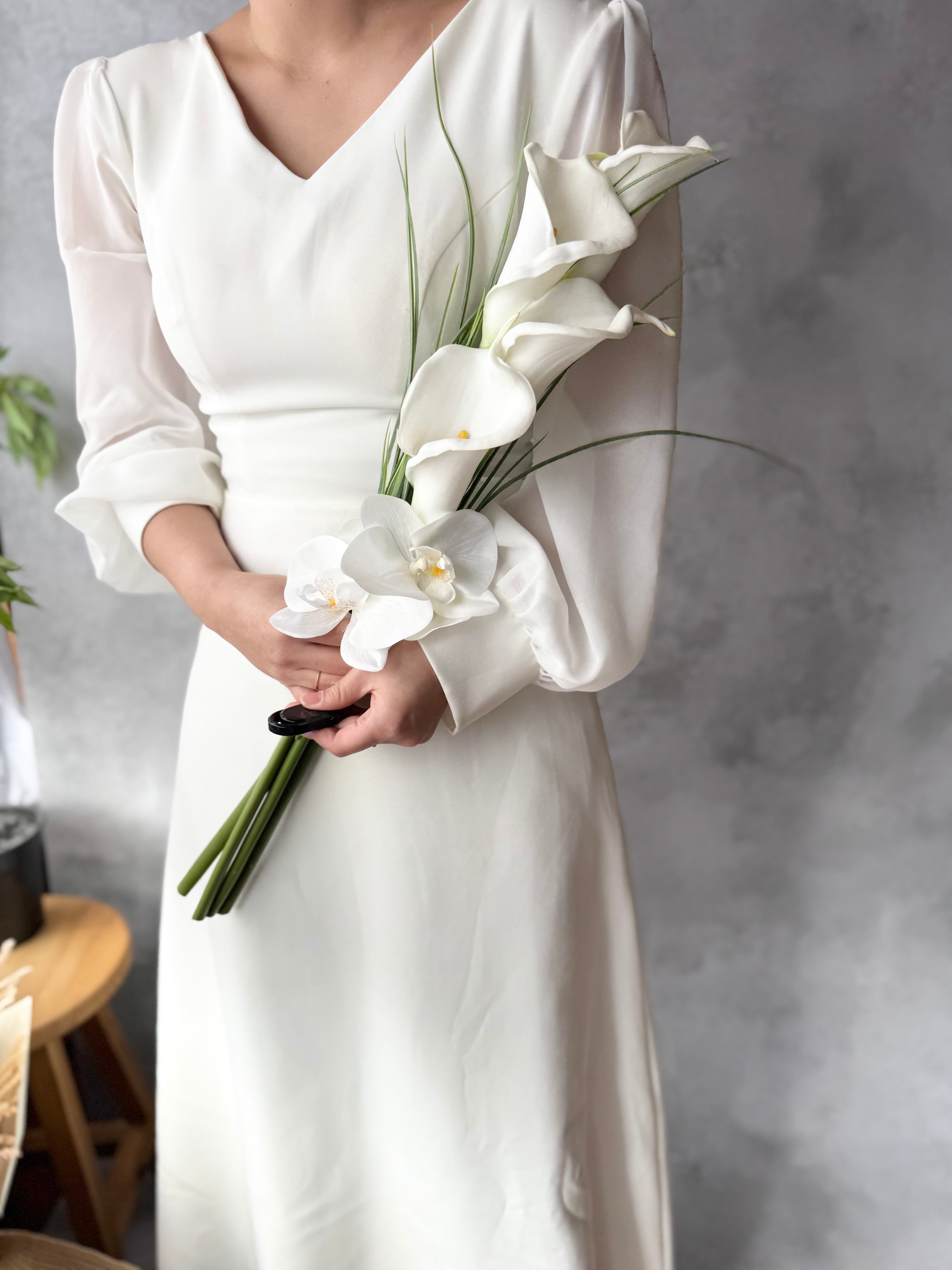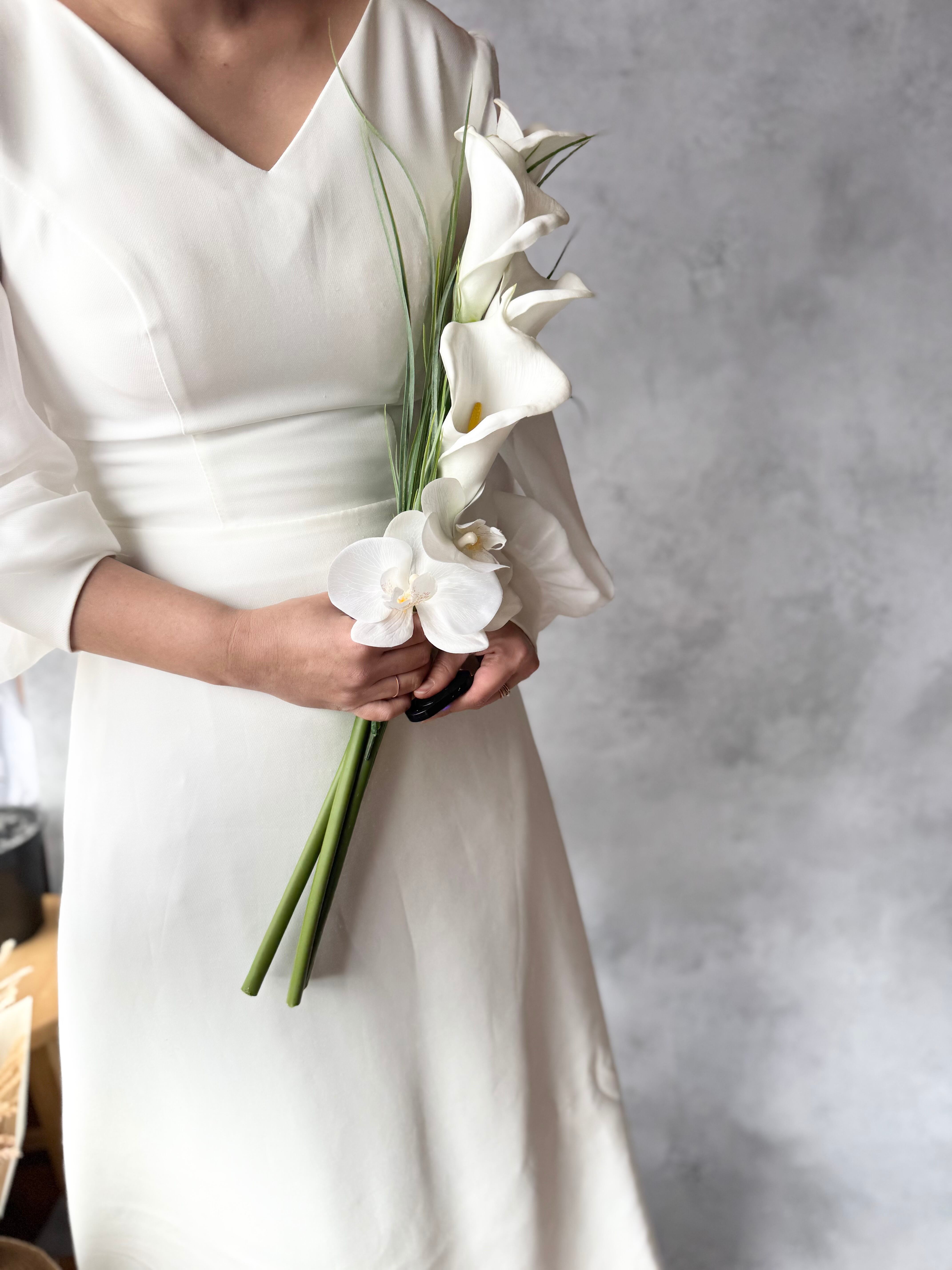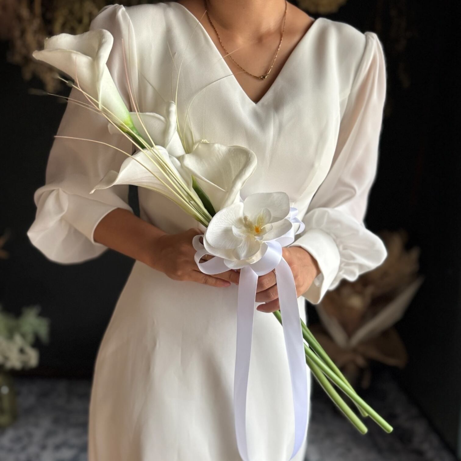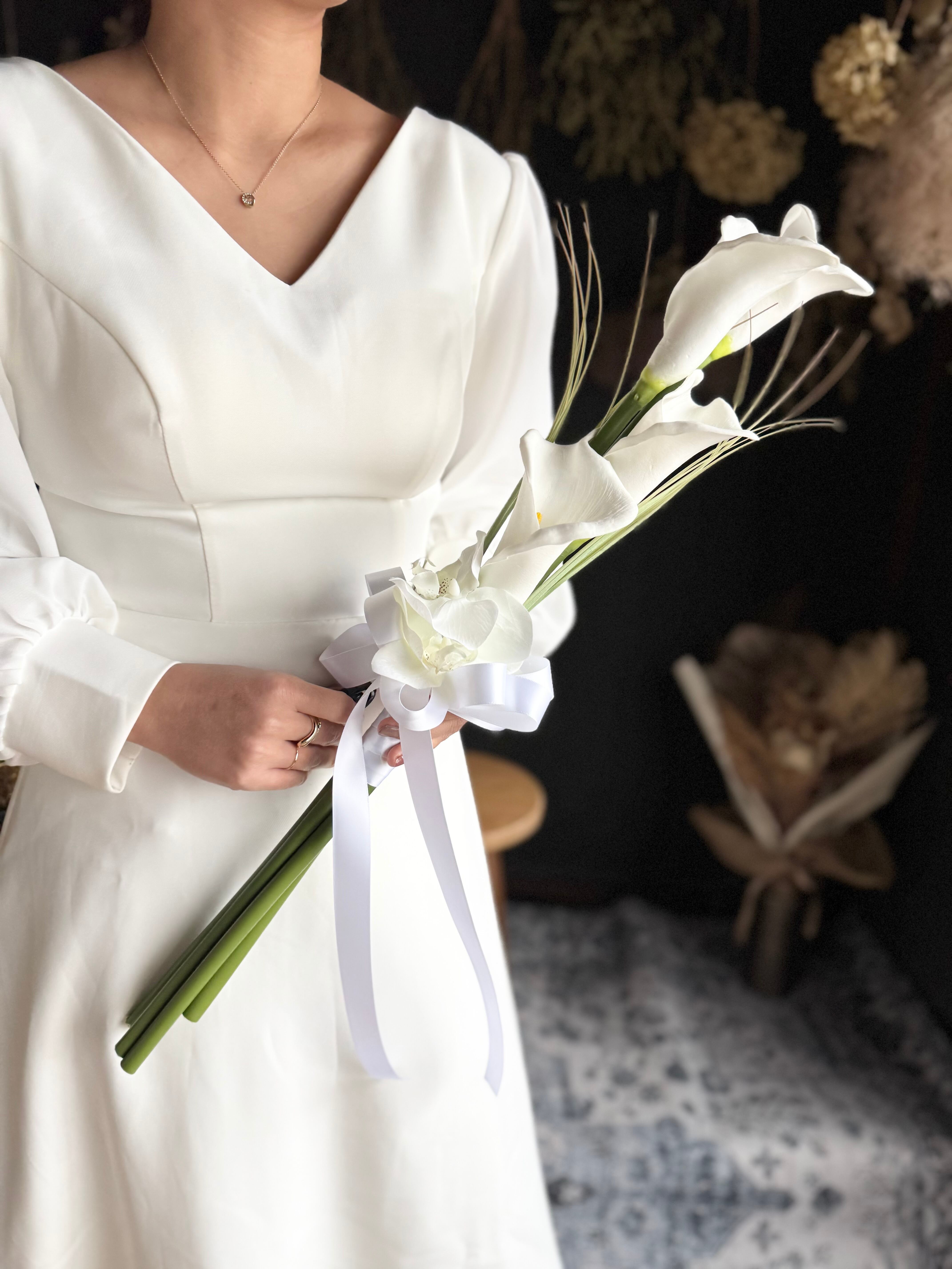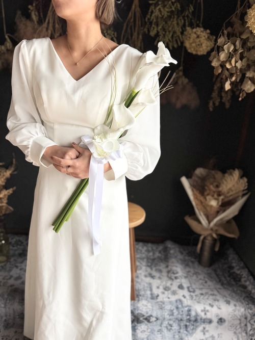 マーメイドラインのドレスや大人っぽいスタイリッシュなドレスにピッタリのブーケです•*・