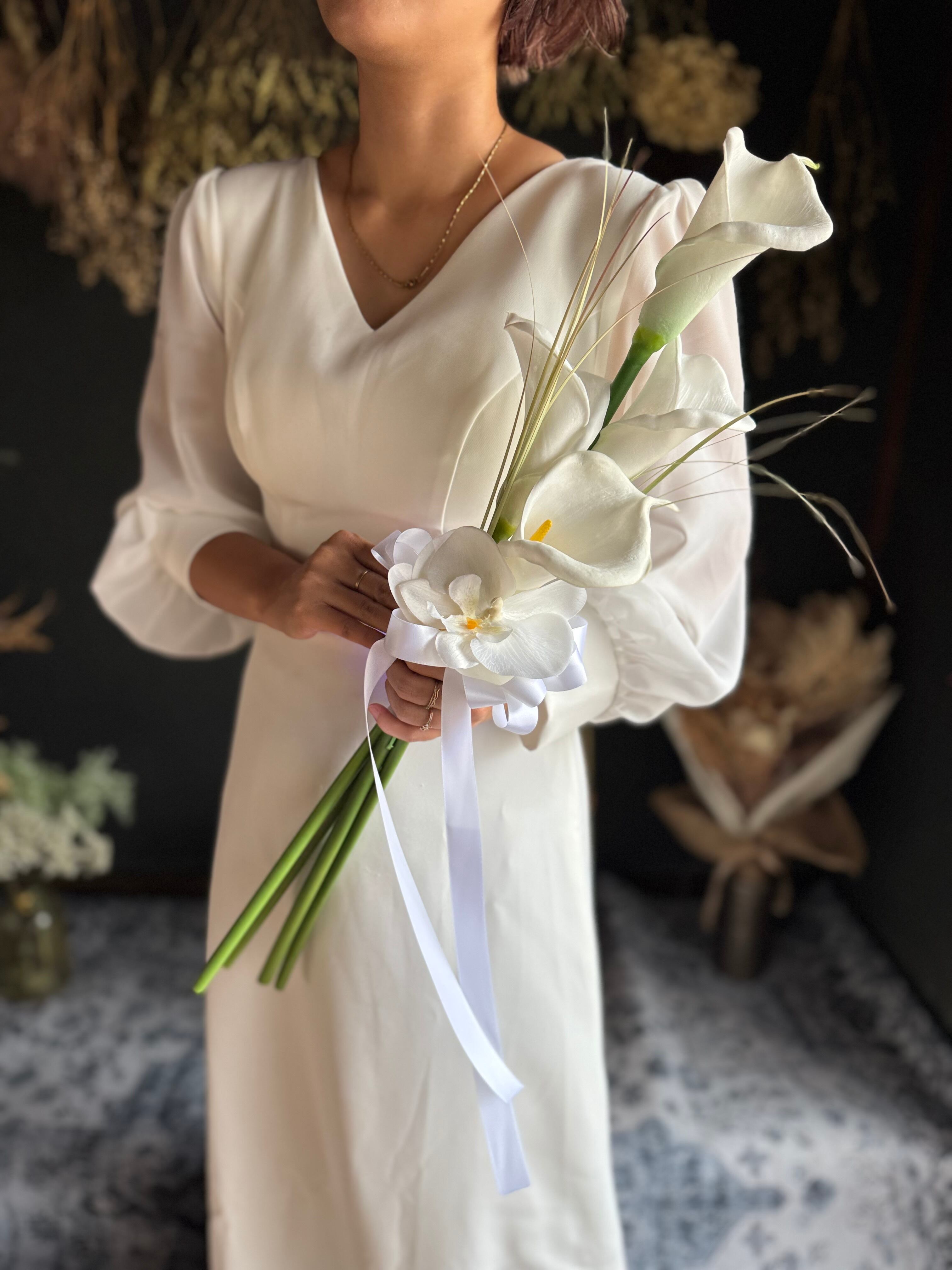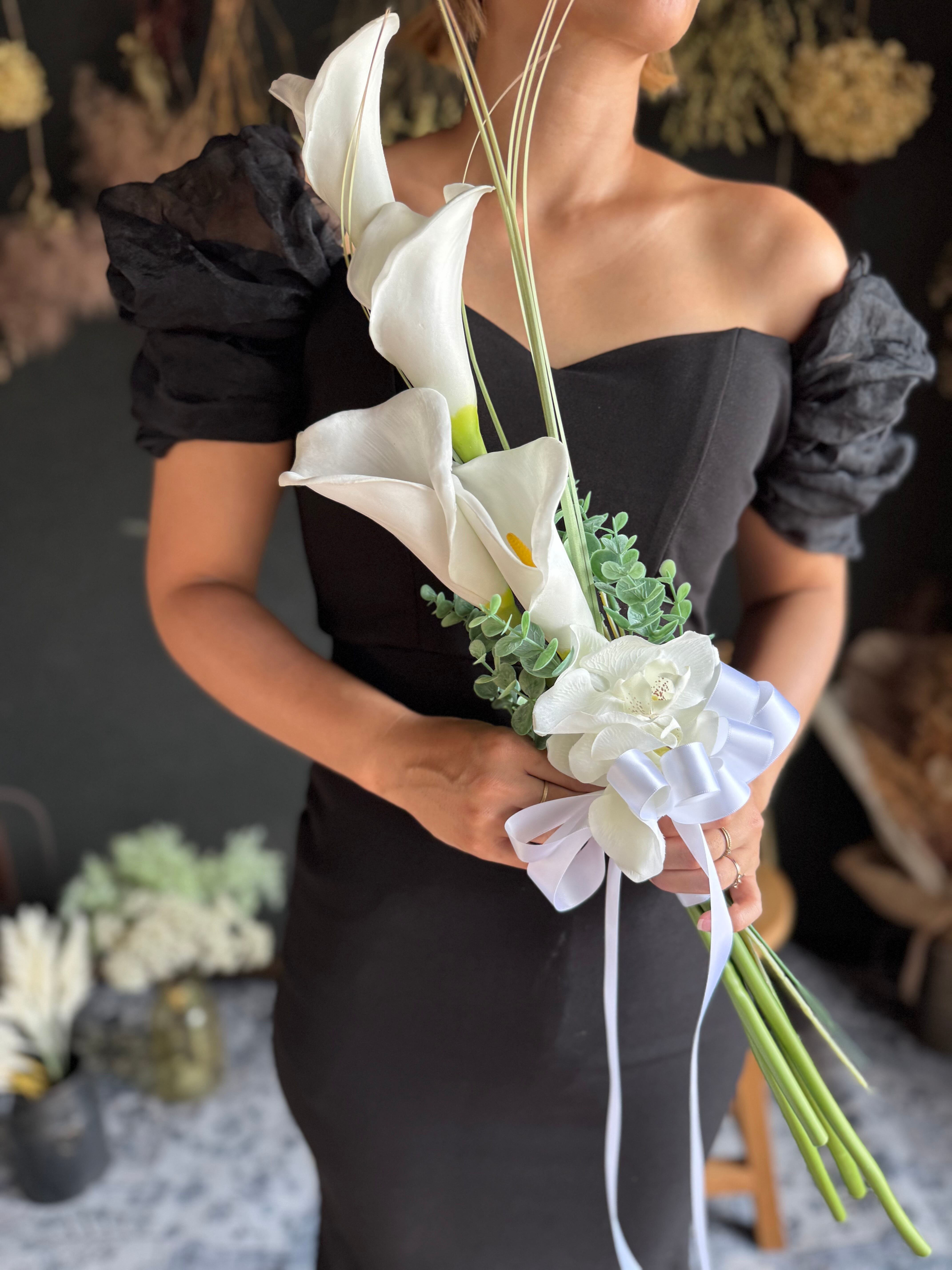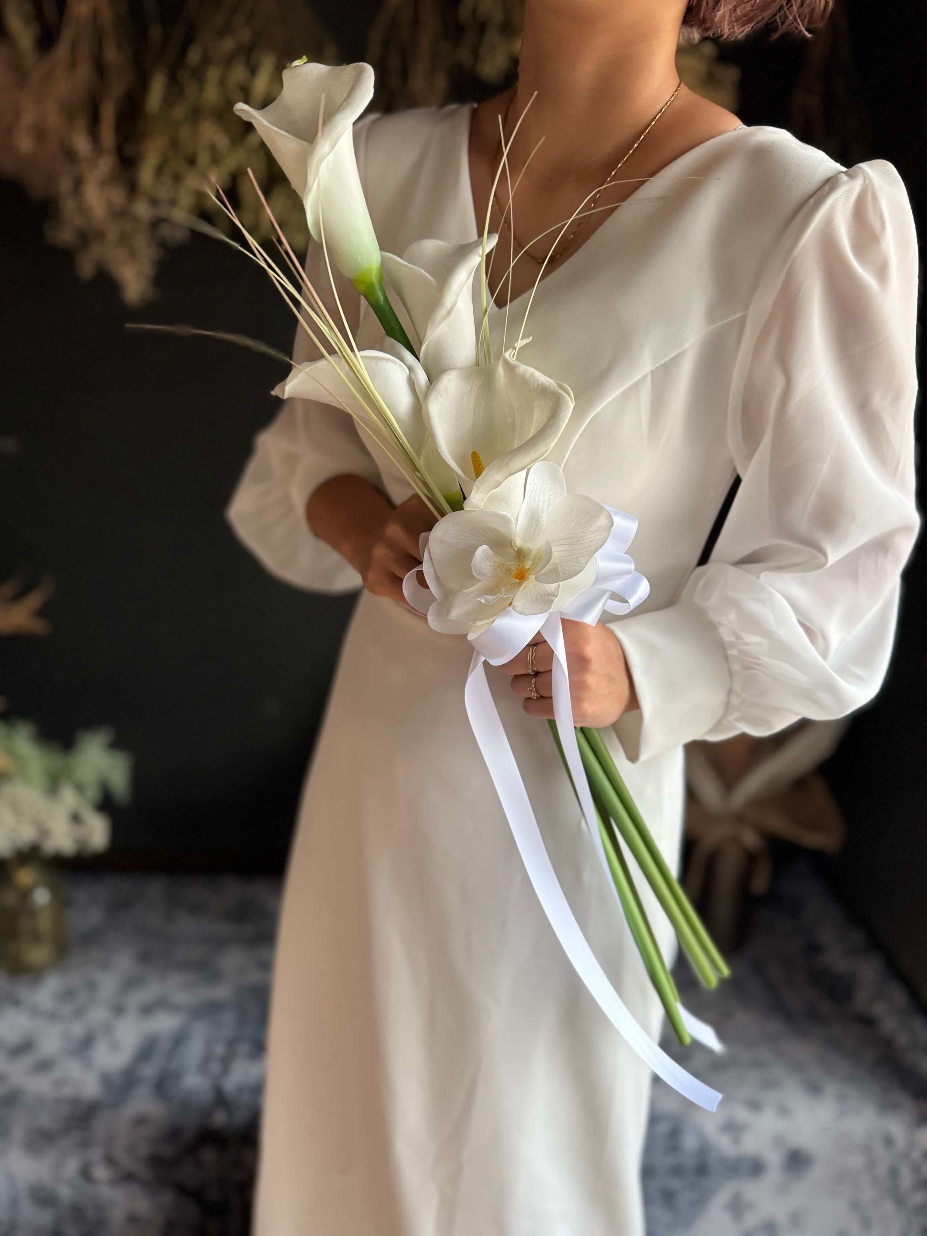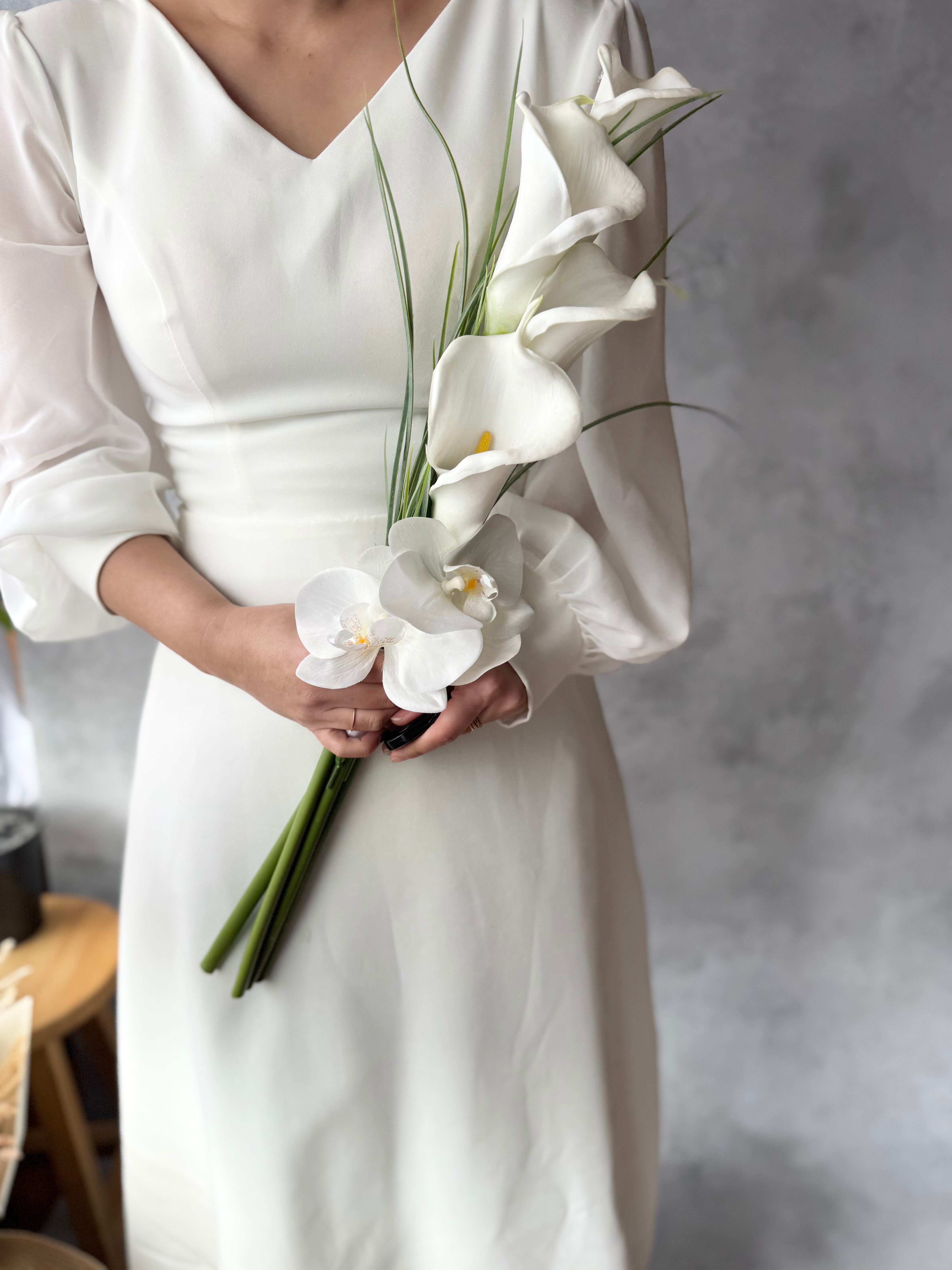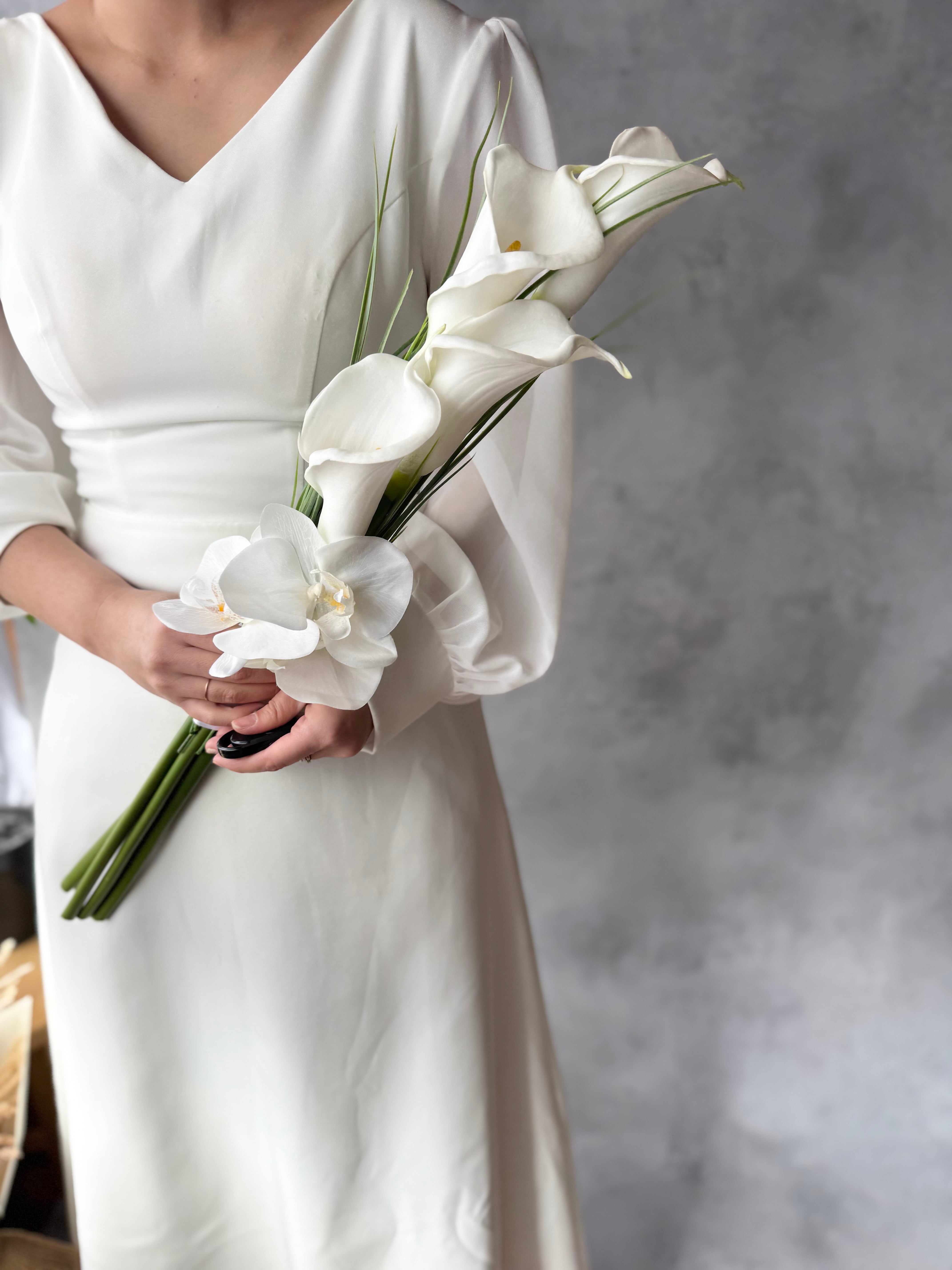 マーメイドラインのドレスや大人っぽいスタイリッシュなドレスにピッタリのブーケです•*・