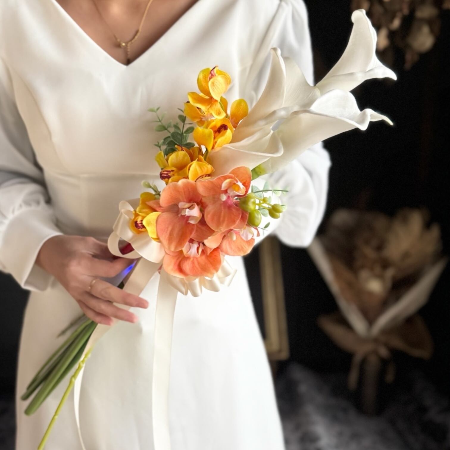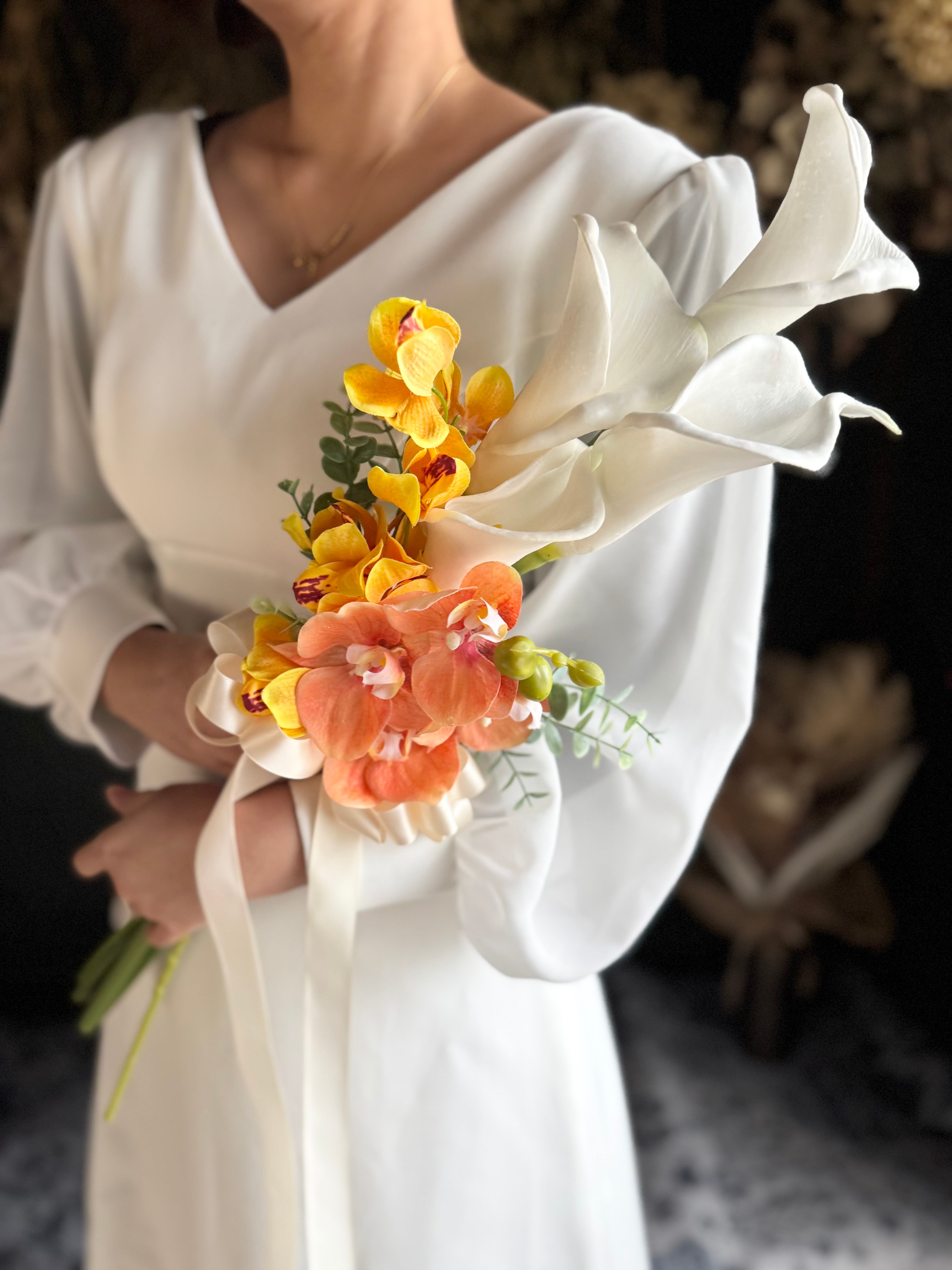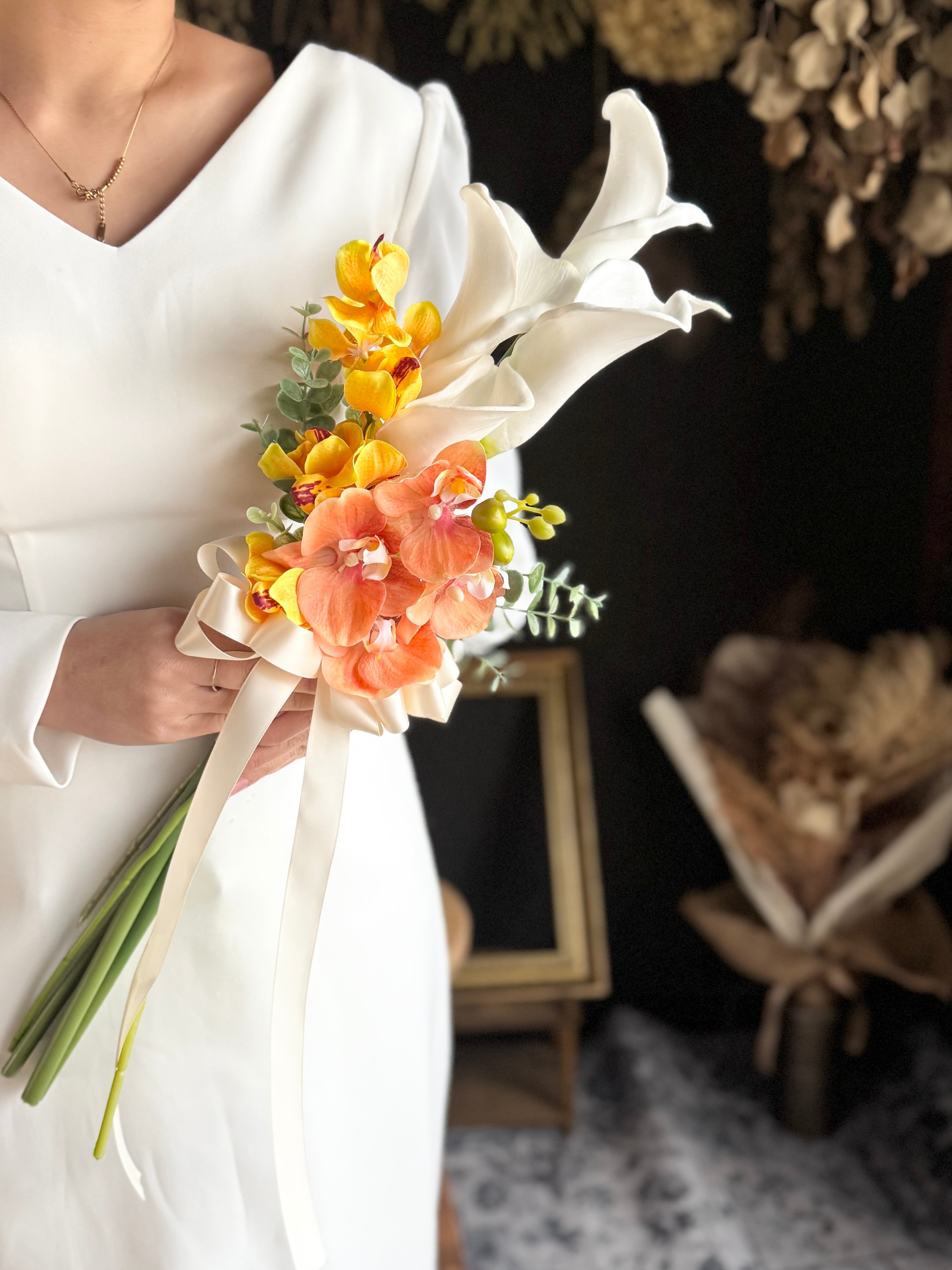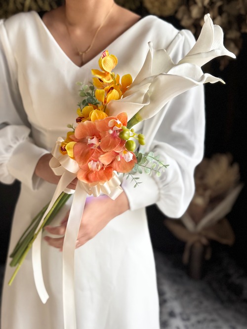 マーメイドラインのドレスや大人っぽいスタイリッシュなドレスにピッタリのブーケです•*・