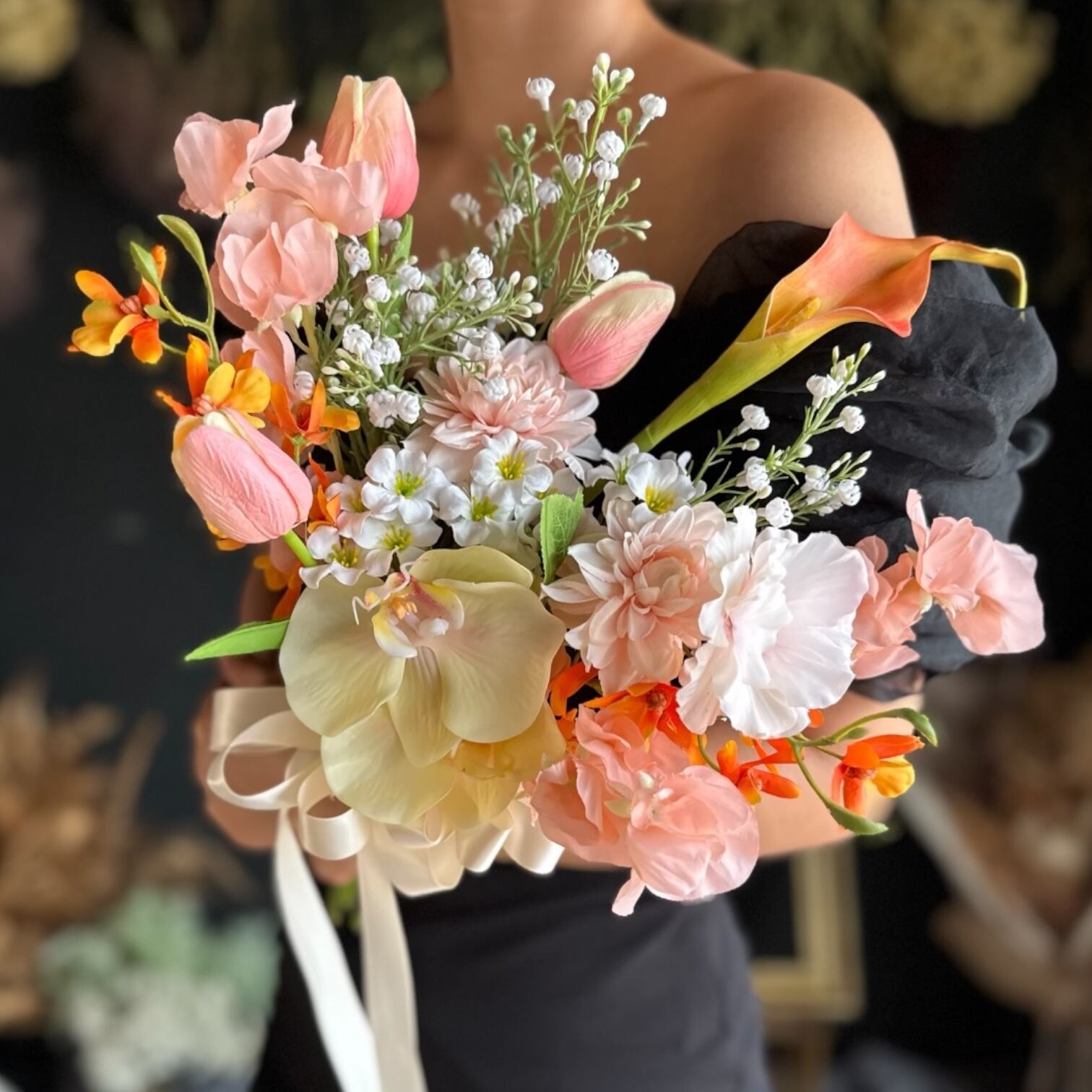 造花(アーティフィシャルフラワー)なので、前撮りや結婚式本番はもちろん、挙式後もそのままインテリアとして飾っていただけます。
